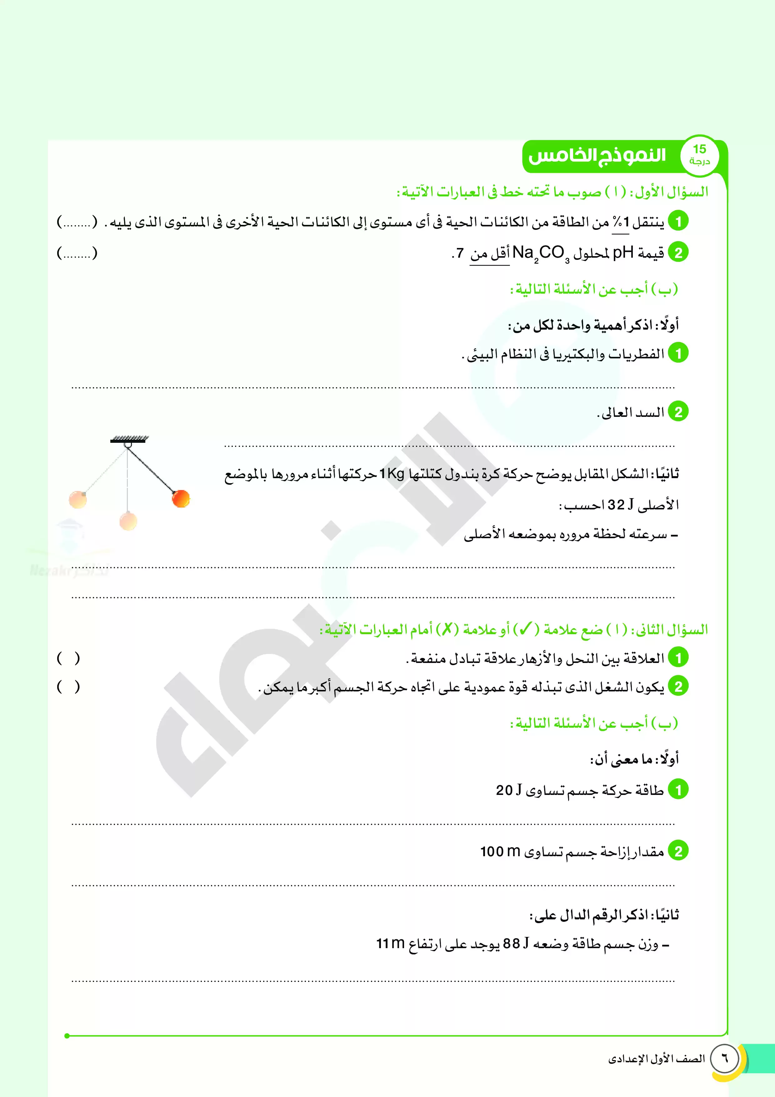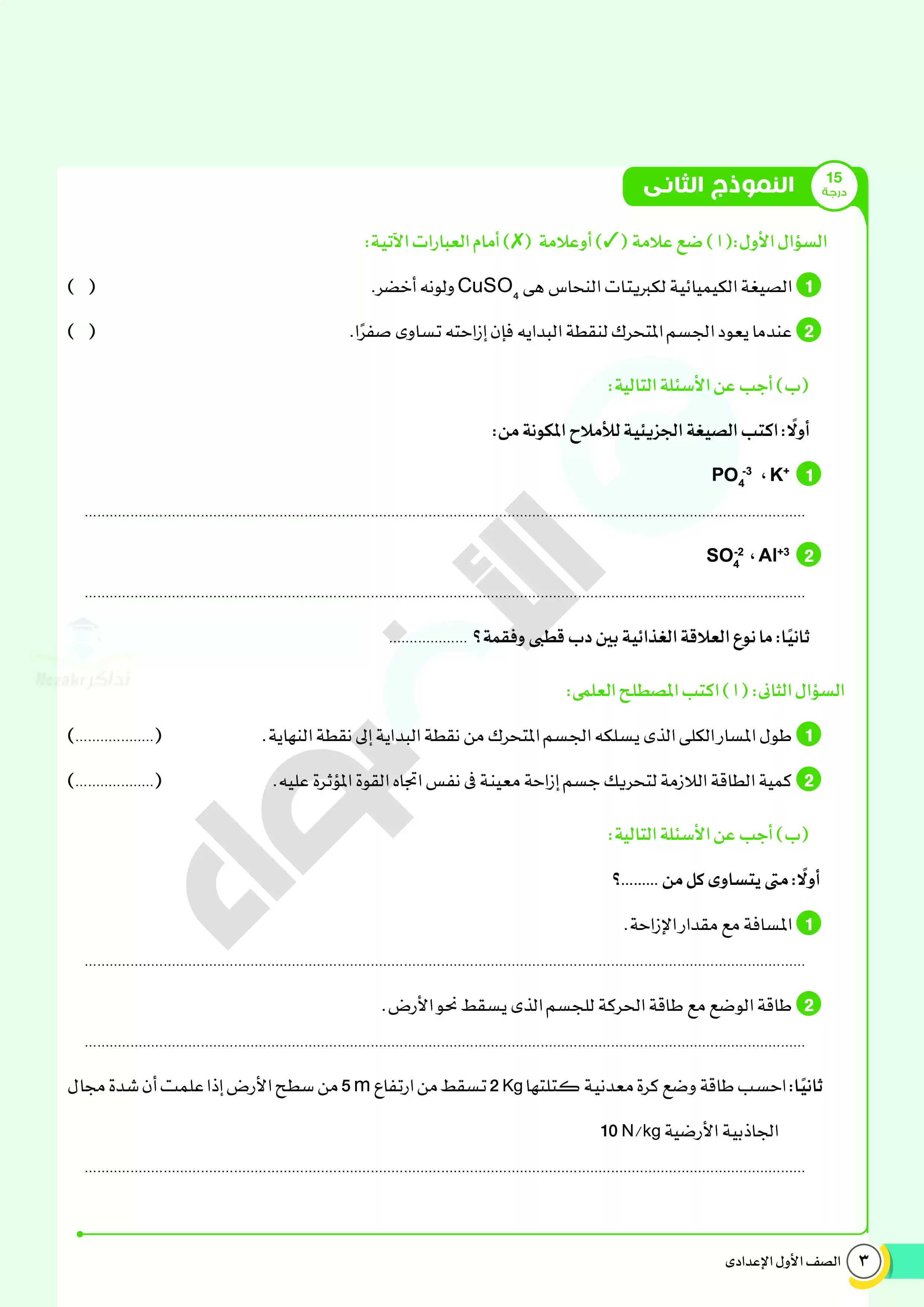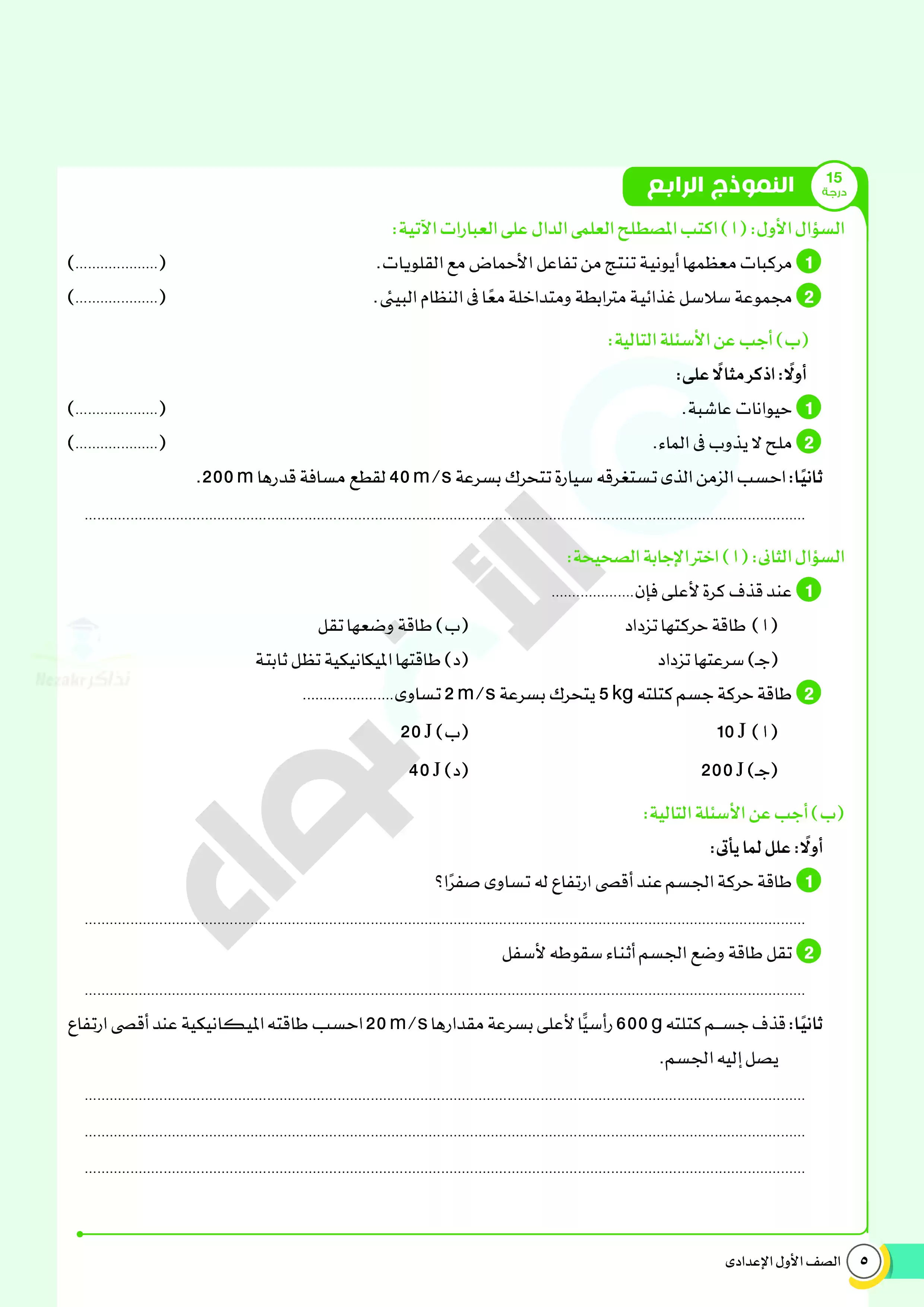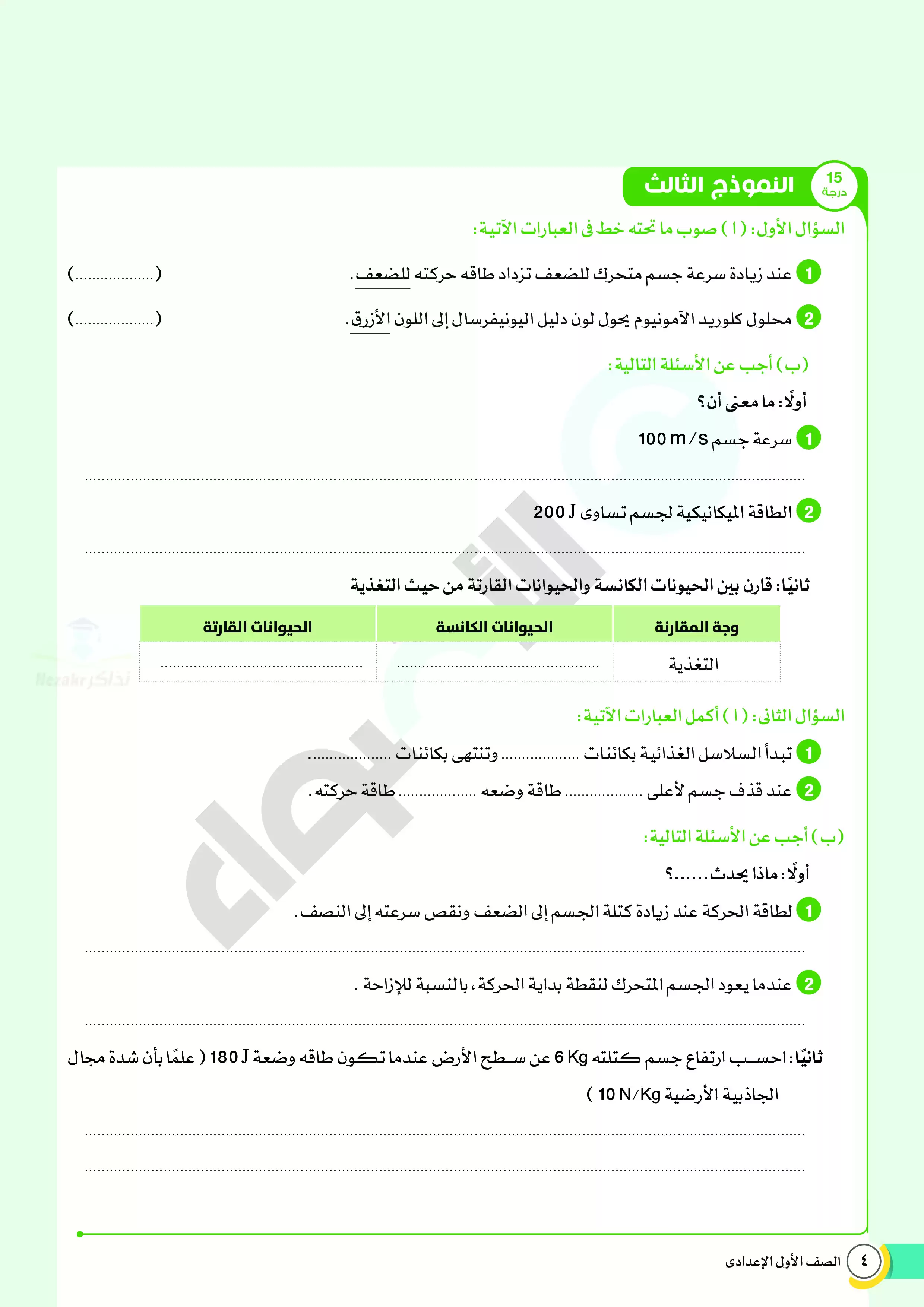 1. نماذج امتحانات استرشادية من كتاب الأضواء على منهج العلوم المقرر في شهر ابريل للصف الأول الإعدادي.