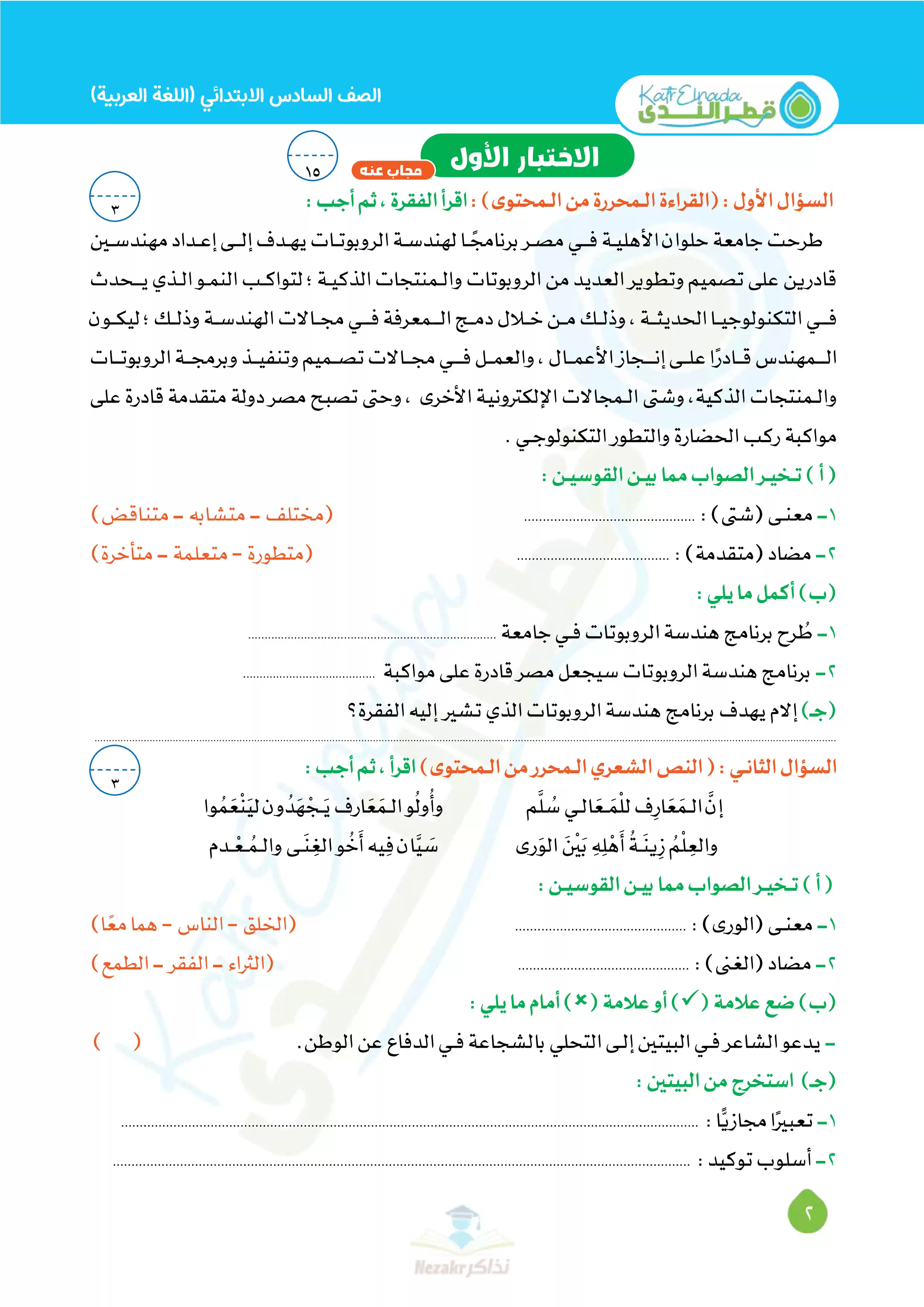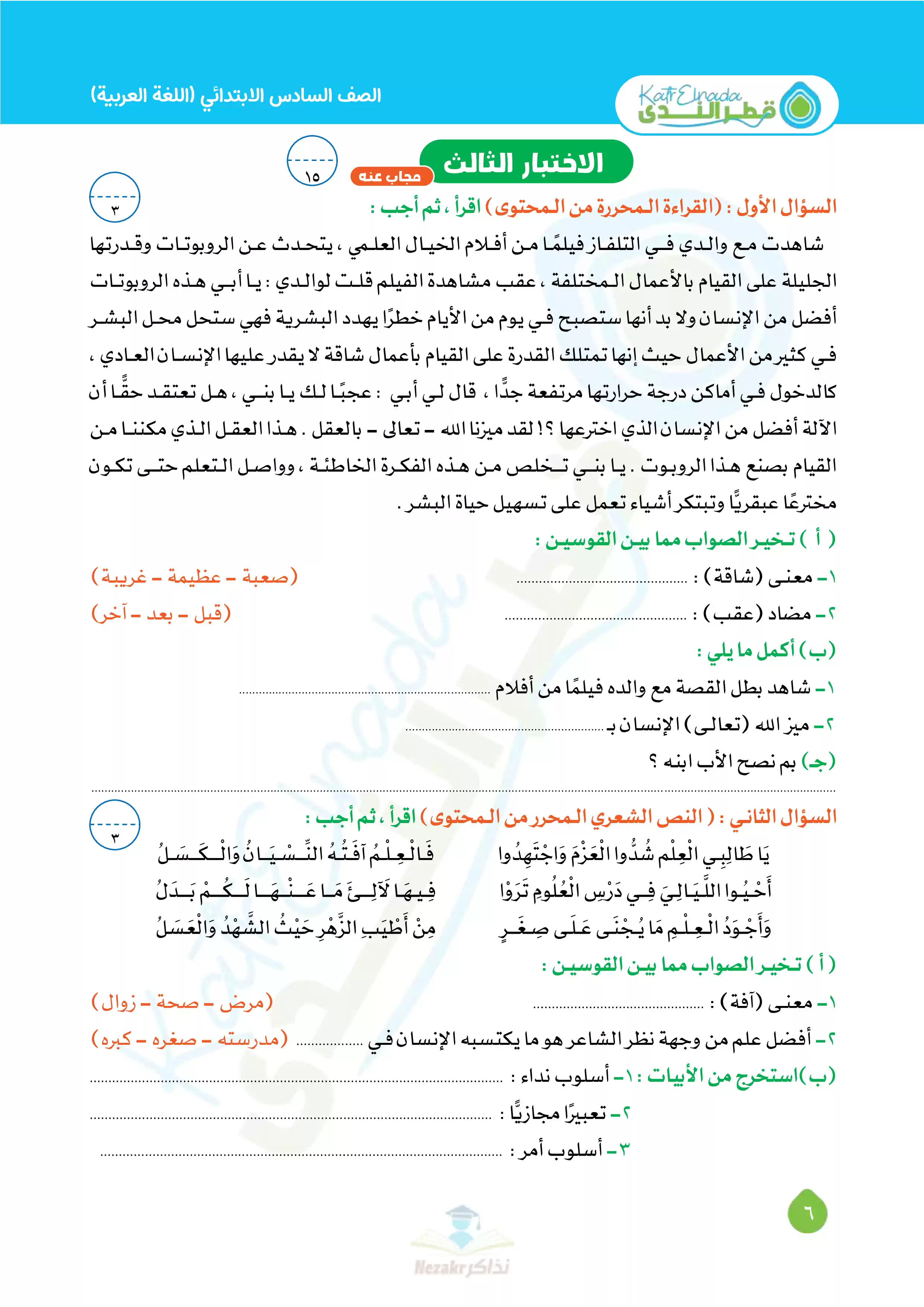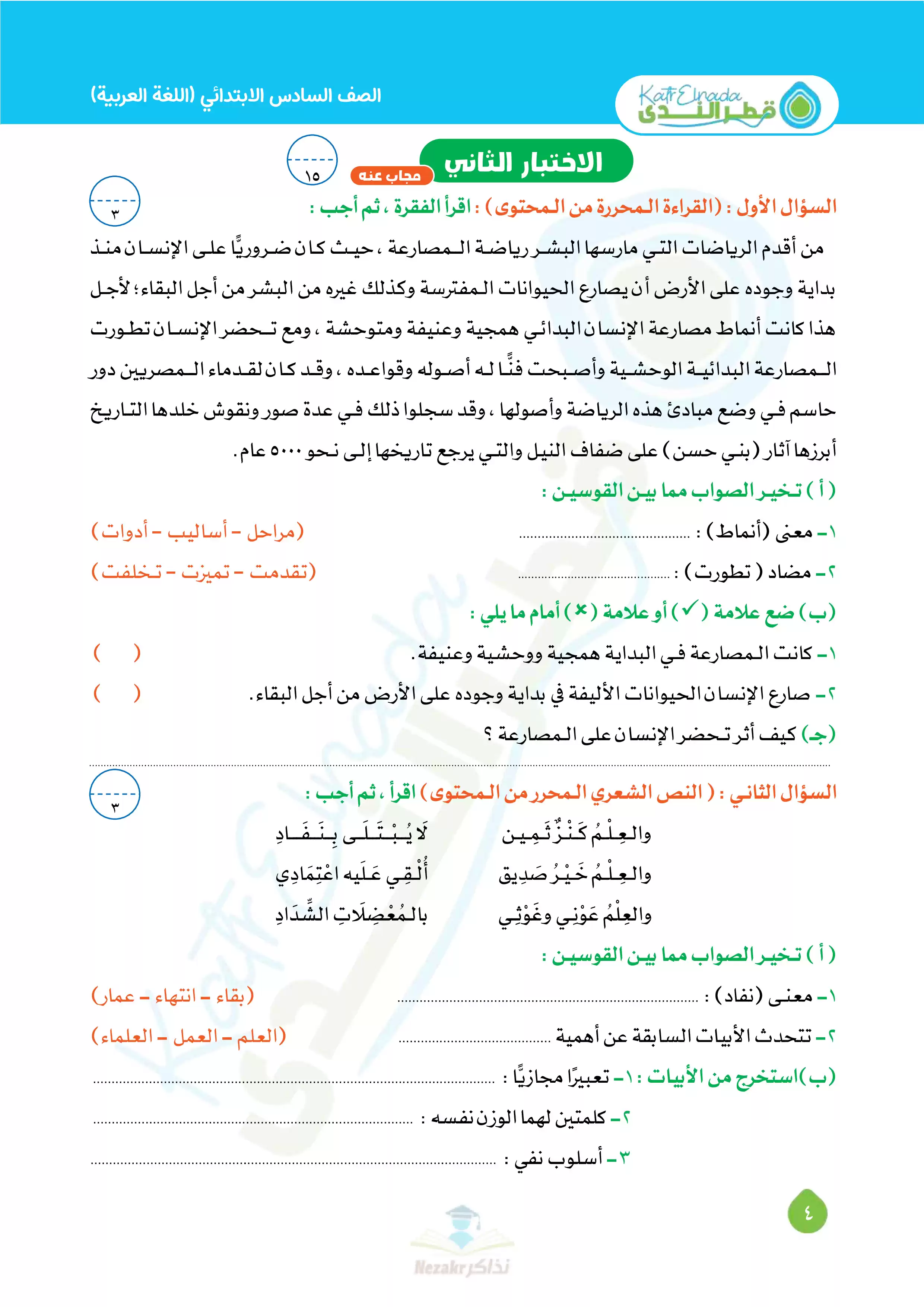 بيانات الملف: (بالإجابات اختبارات قطر الندي في اللغة العربية لسادسة ابتدائي امتحان ابريل 2025 - Nezakr)