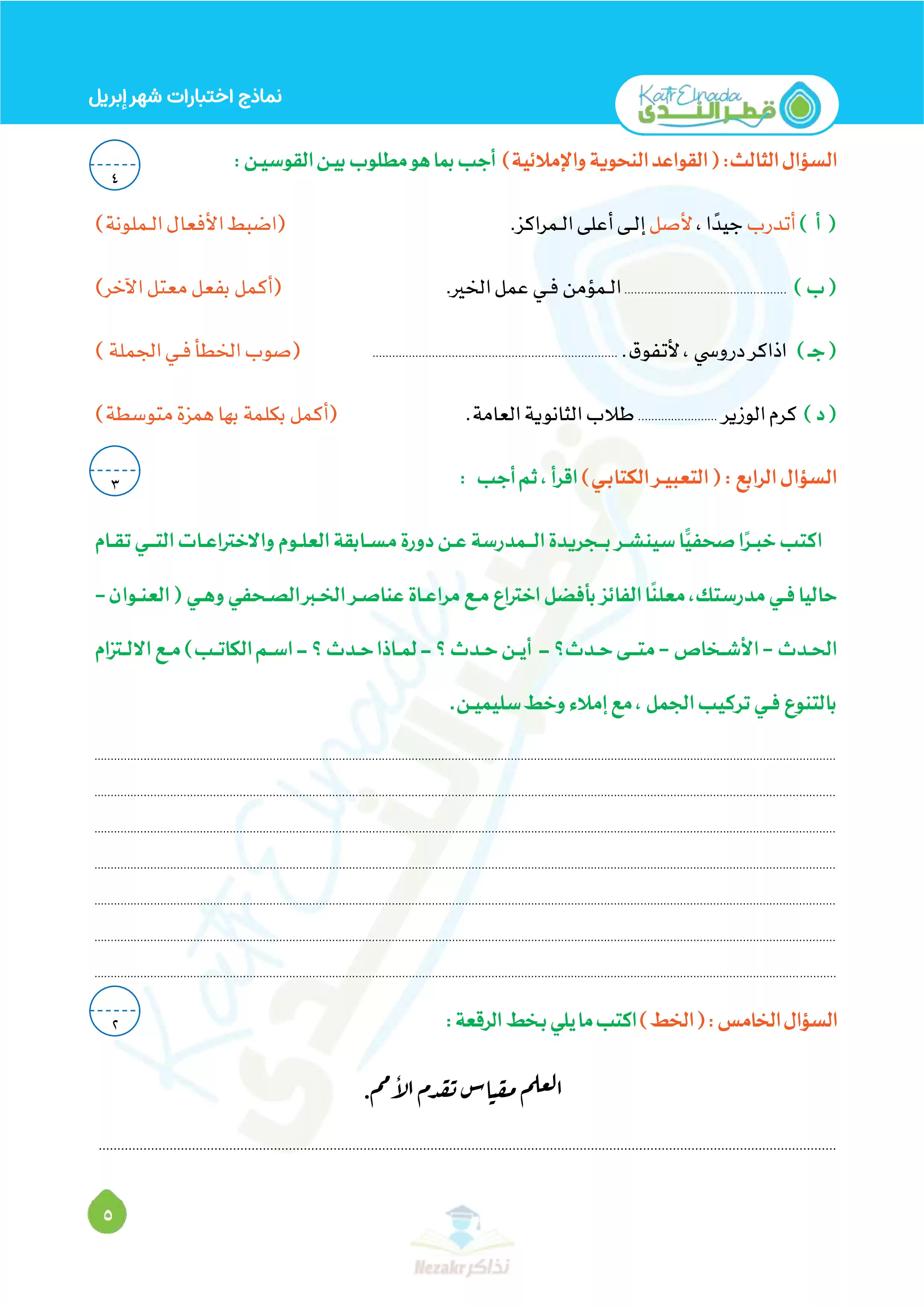 صفحة 5 من 11 صفحة من ملف: بالإجابات اختبارات قطر الندي في اللغة العربية لسادسة ابتدائي امتحان ابريل 2025 - Nezakr