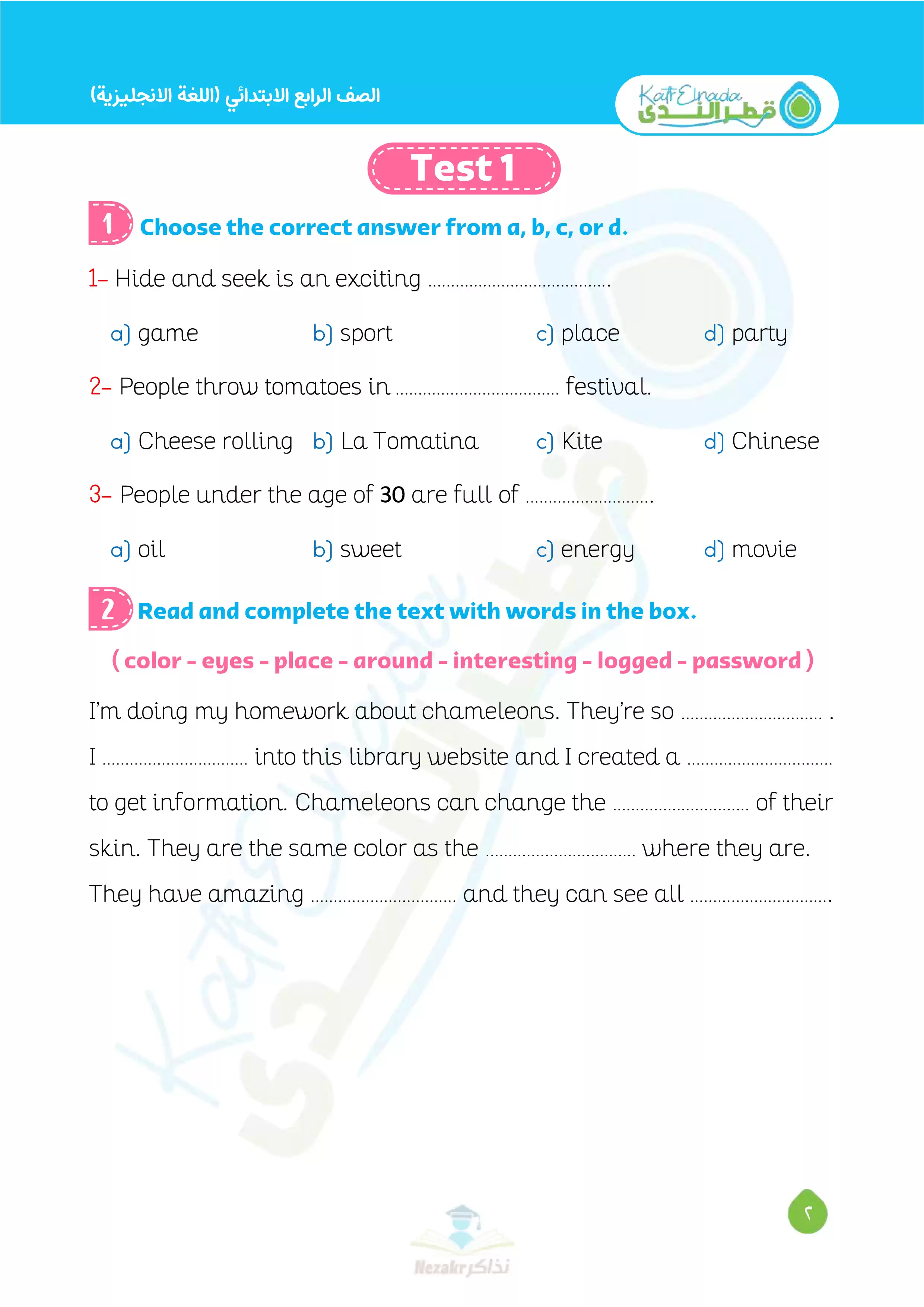صفحة 2 من 12 صفحة من ملف: بالإجابات اختبارات قطر الندي في الانجليزي لرابعة ابتدائي امتحان ابريل 2025 - Nezakr