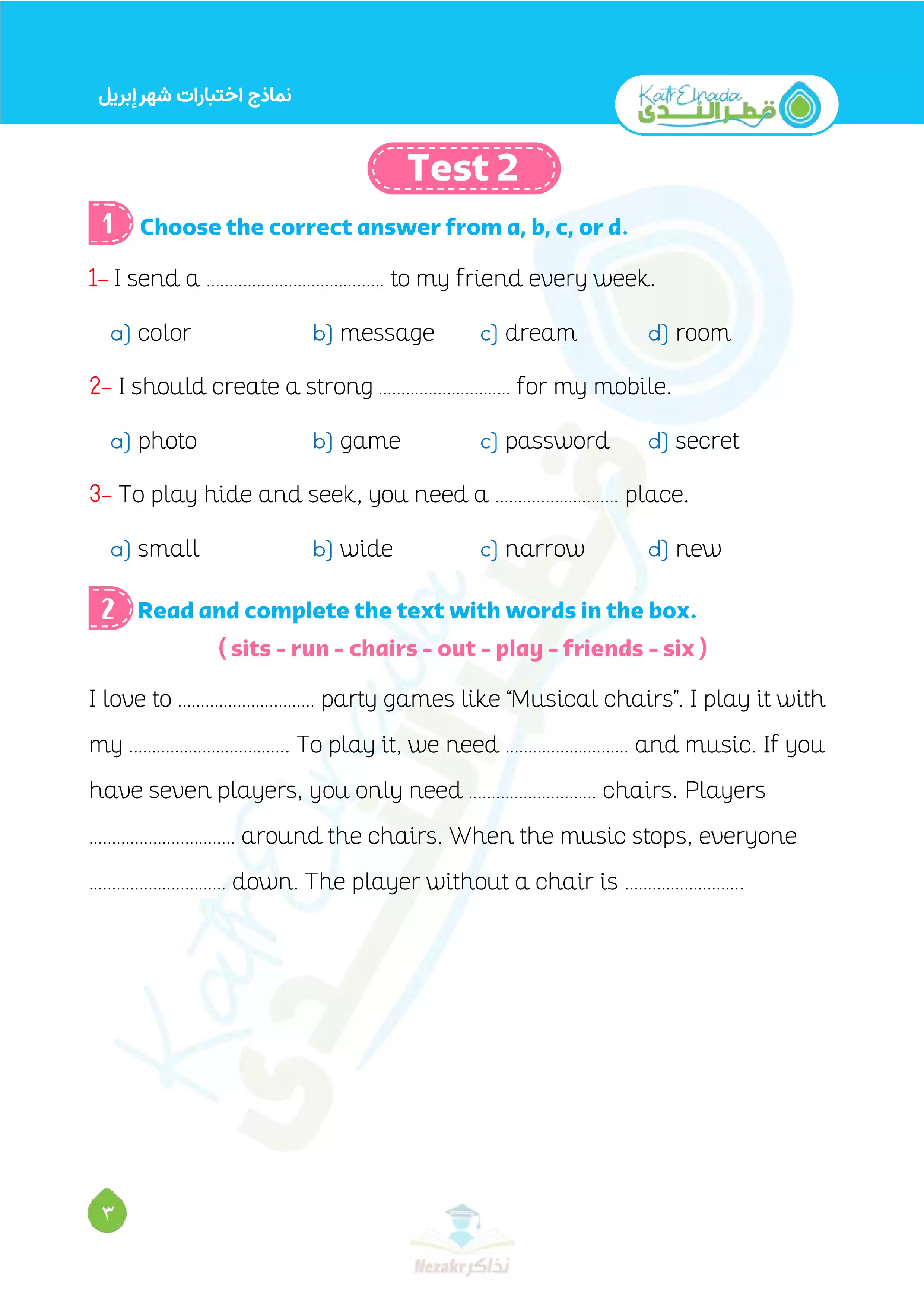 صفحة 3 من 12 صفحة من ملف: بالإجابات اختبارات قطر الندي في الانجليزي لرابعة ابتدائي امتحان ابريل 2025 - Nezakr