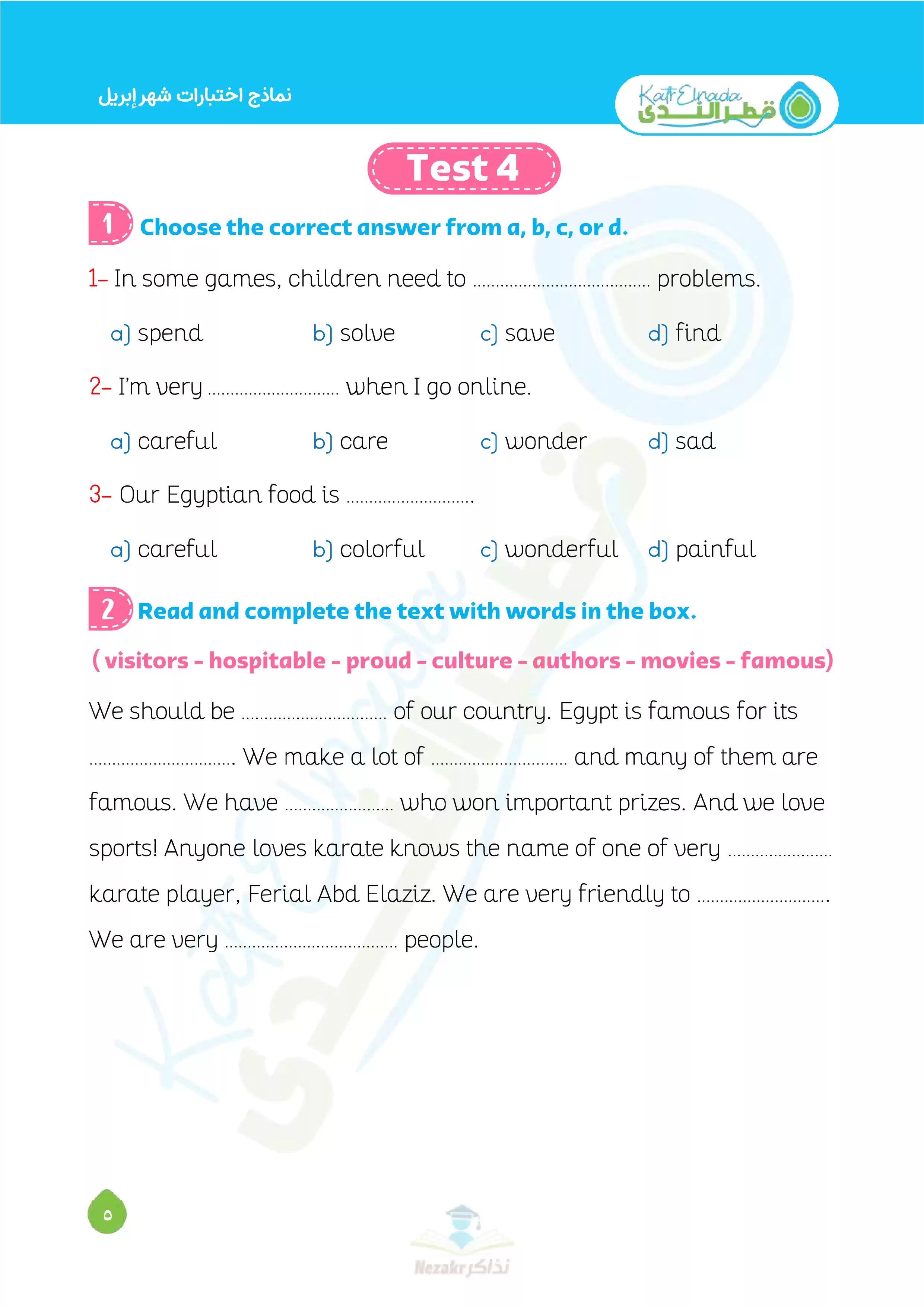 صفحة 5 من 12 صفحة من ملف: بالإجابات اختبارات قطر الندي في الانجليزي لرابعة ابتدائي امتحان ابريل 2025 - Nezakr