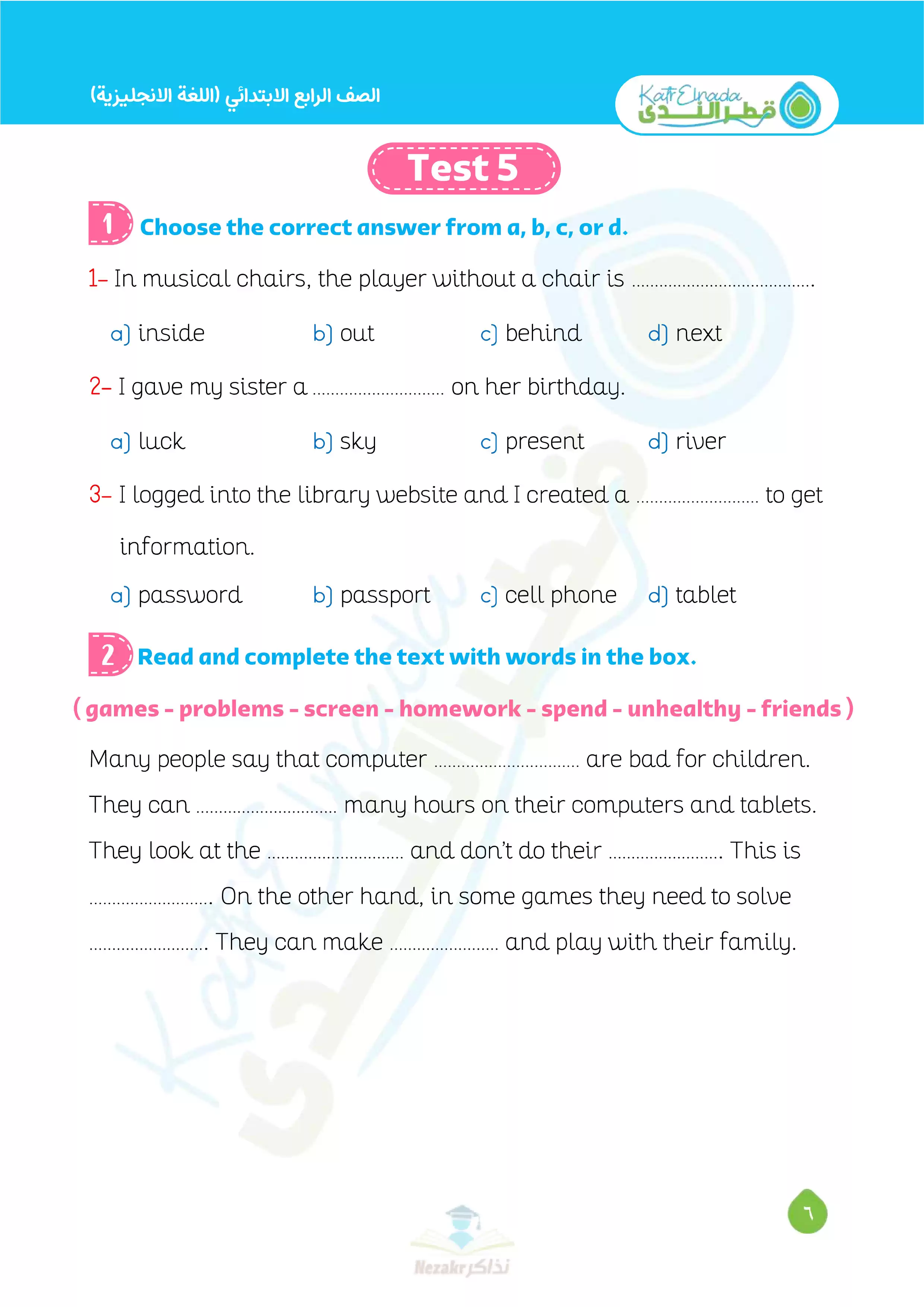 صفحة 6 من 12 صفحة من ملف: بالإجابات اختبارات قطر الندي في الانجليزي لرابعة ابتدائي امتحان ابريل 2025 - Nezakr