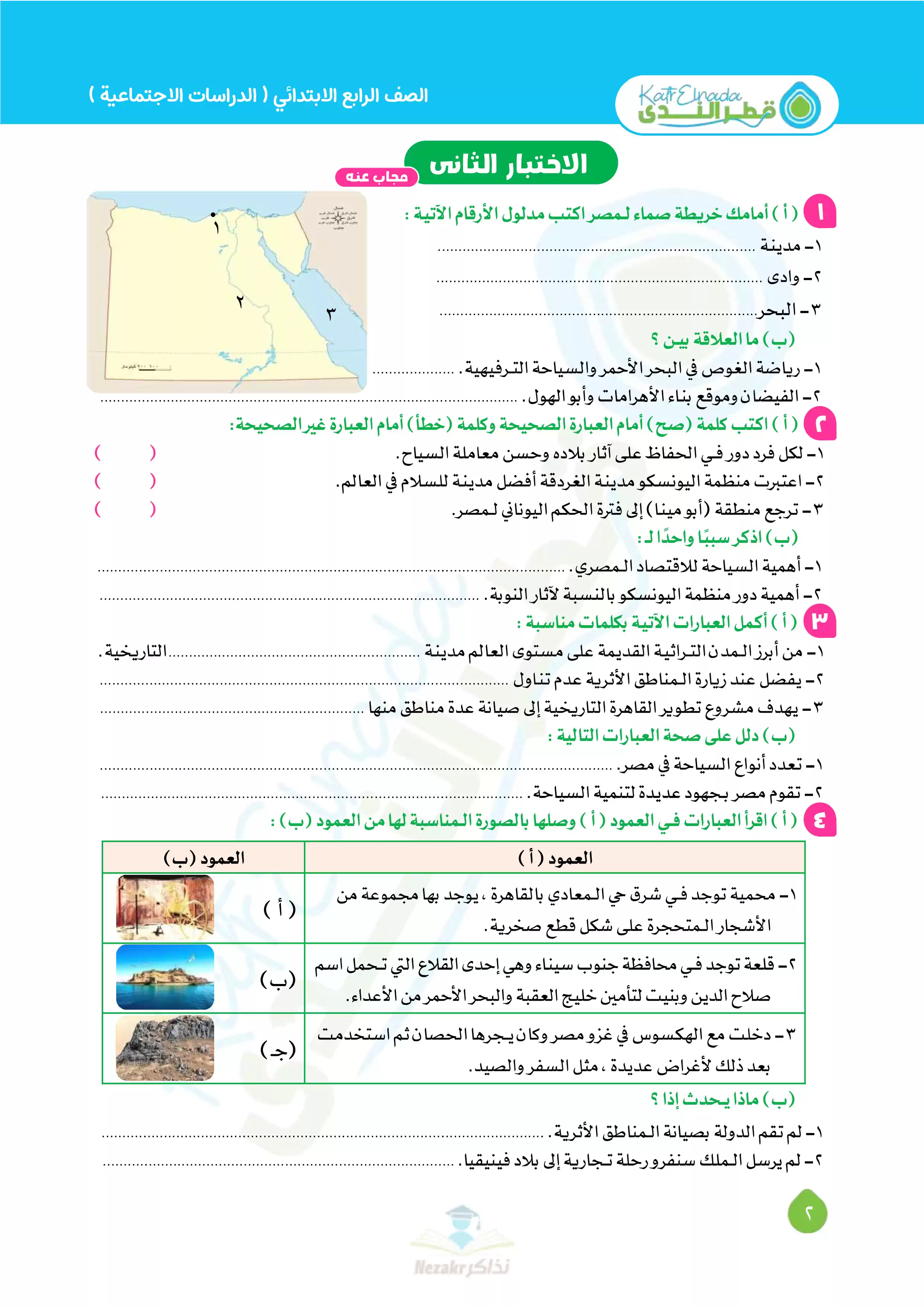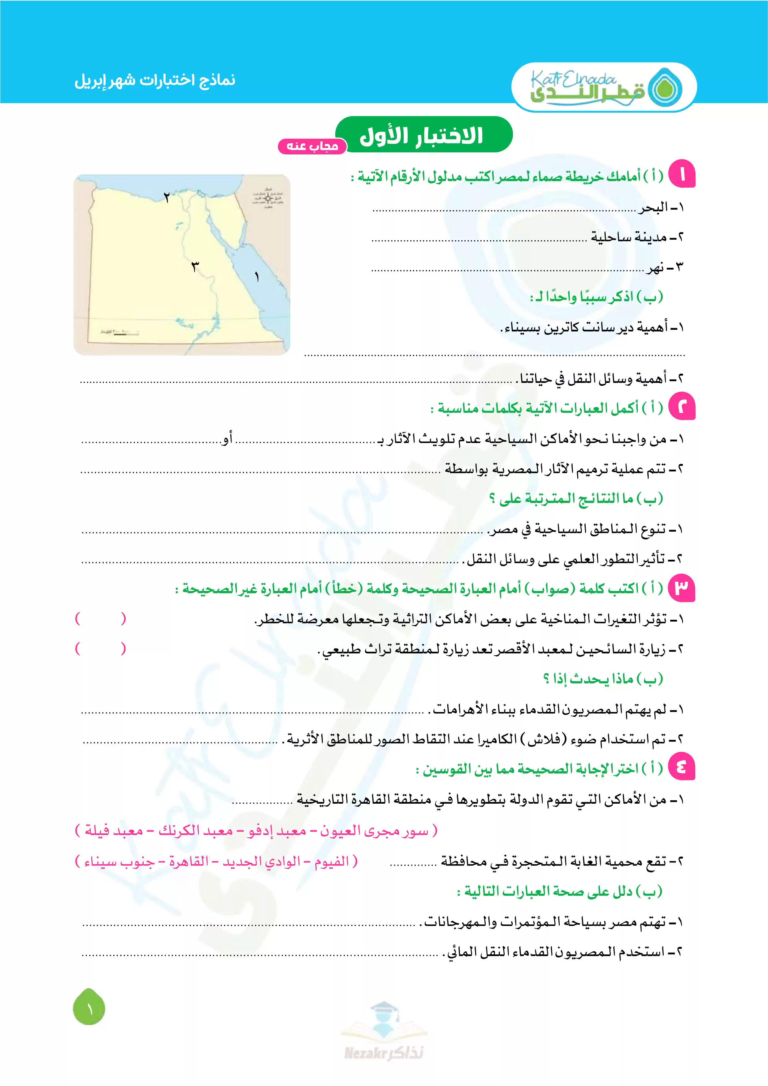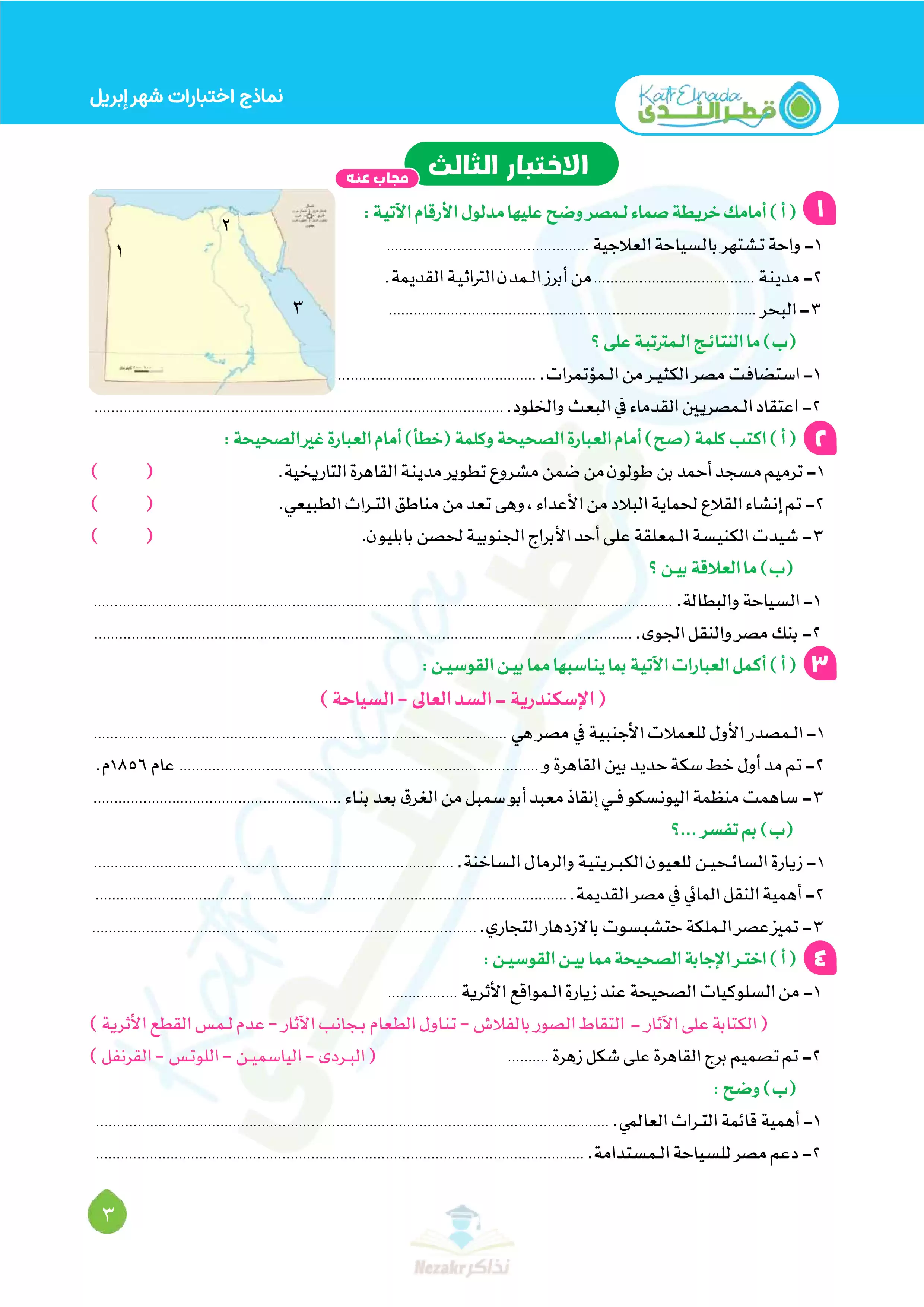 صفحة 3 من 11 صفحة من ملف: بالإجابات اختبارات قطر الندي في الدراسات الاجتماعية لرابعة ابتدائي امتحان ابريل 2025 - Nezakr