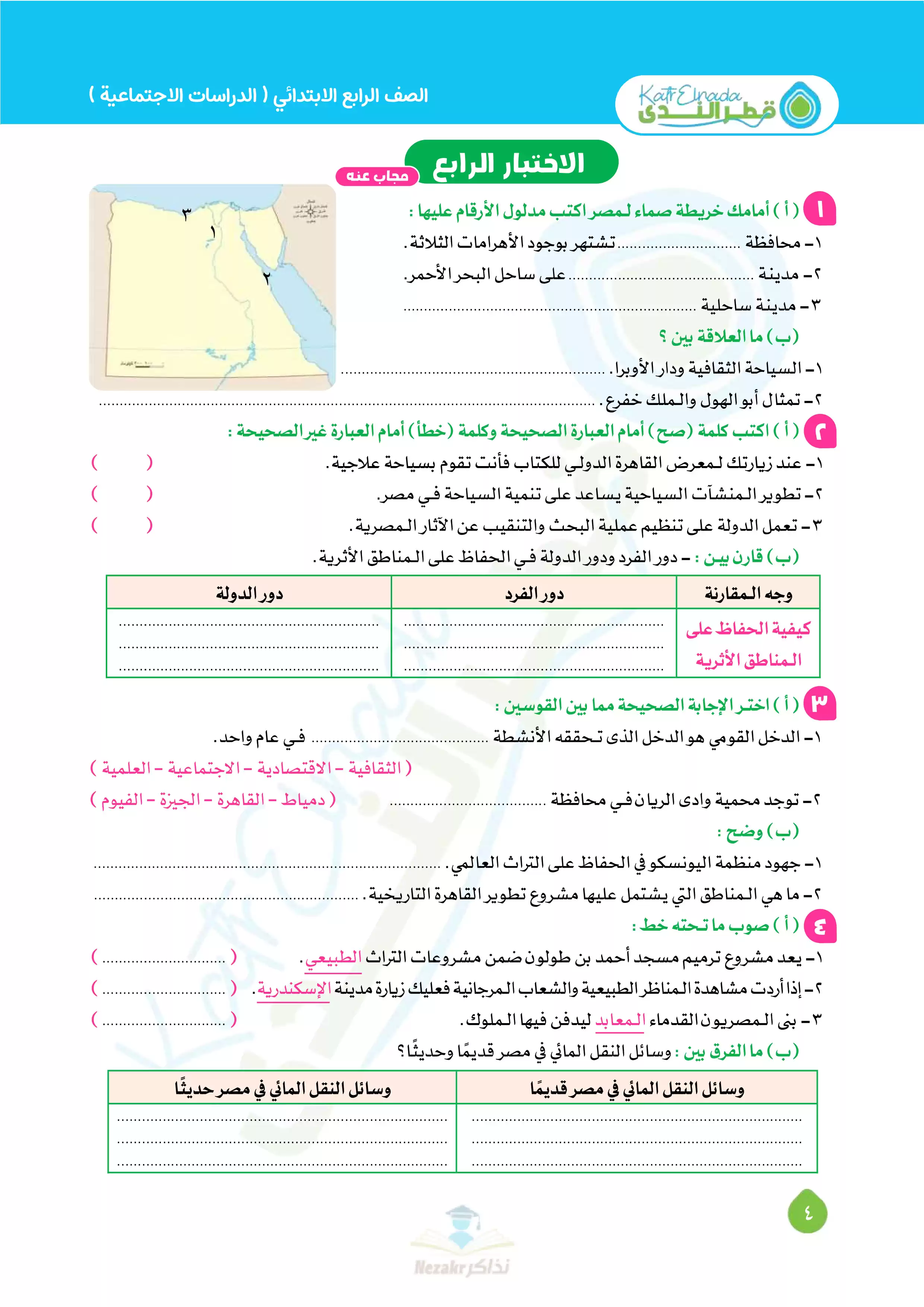 صفحة 4 من 11 صفحة من ملف: بالإجابات اختبارات قطر الندي في الدراسات الاجتماعية لرابعة ابتدائي امتحان ابريل 2025 - Nezakr