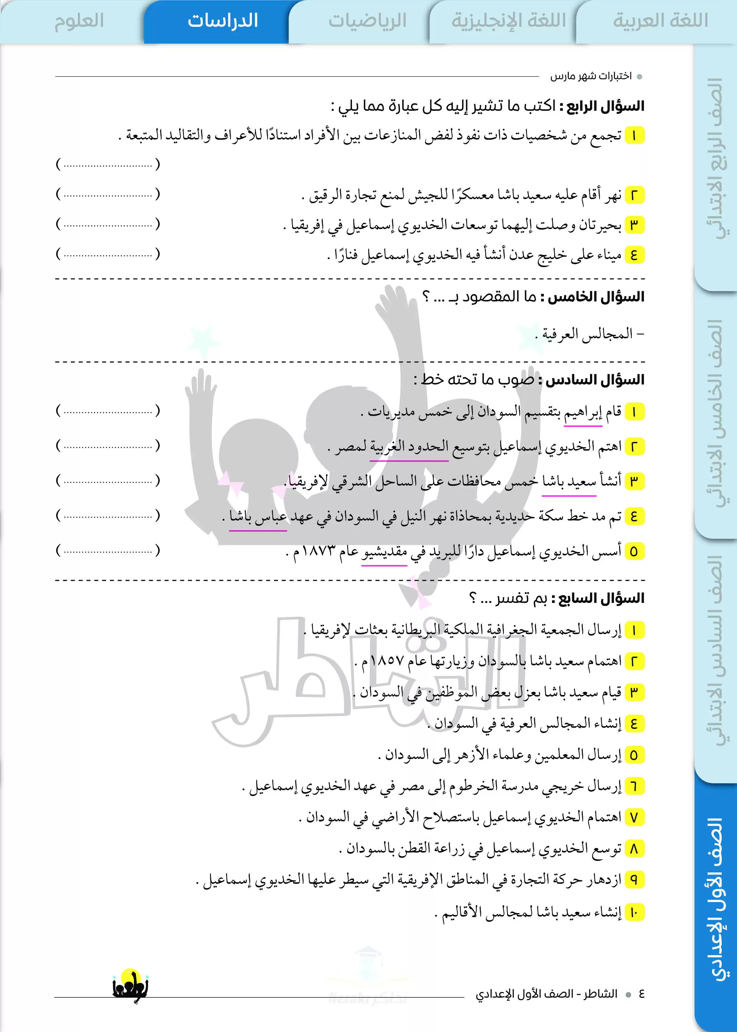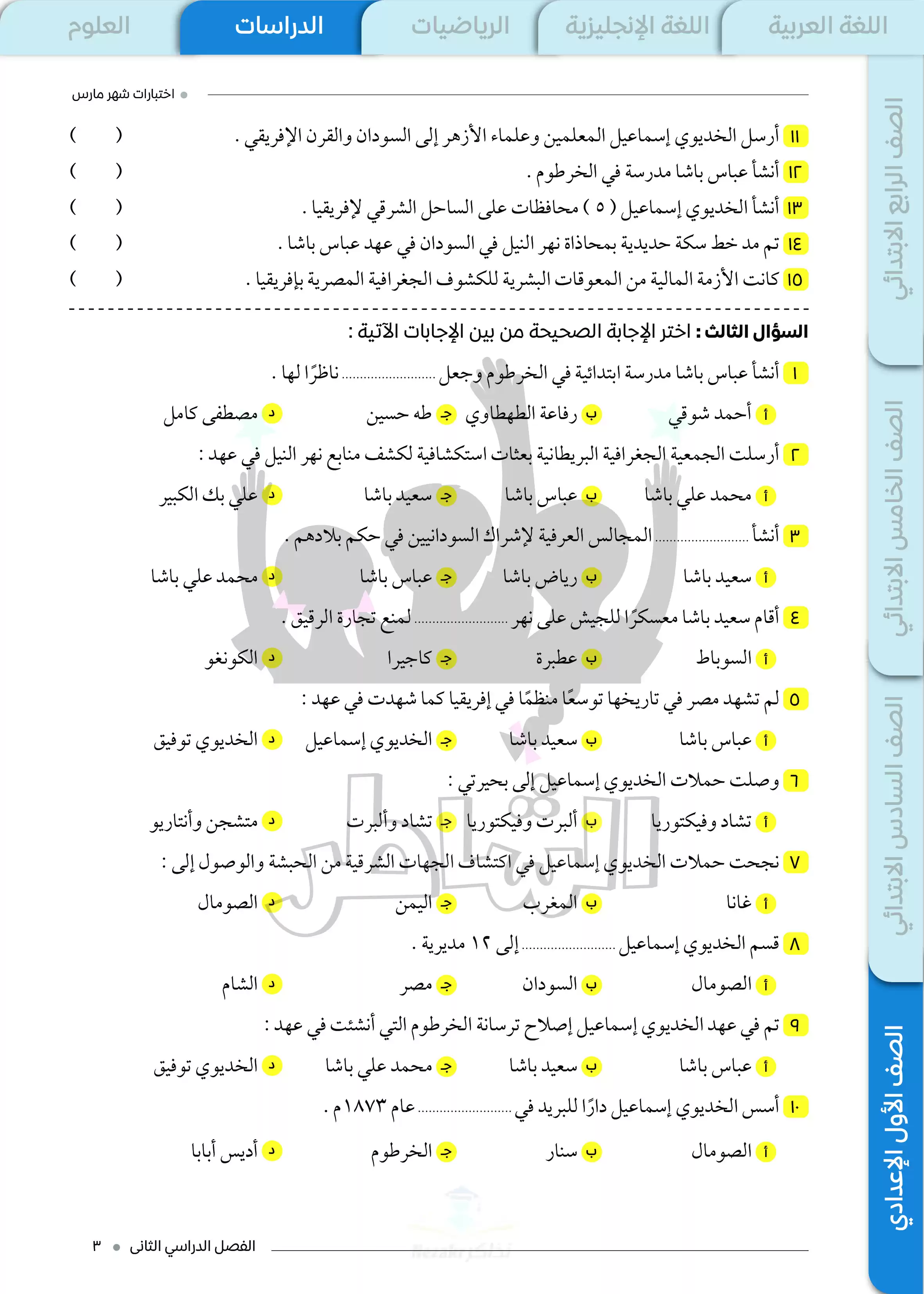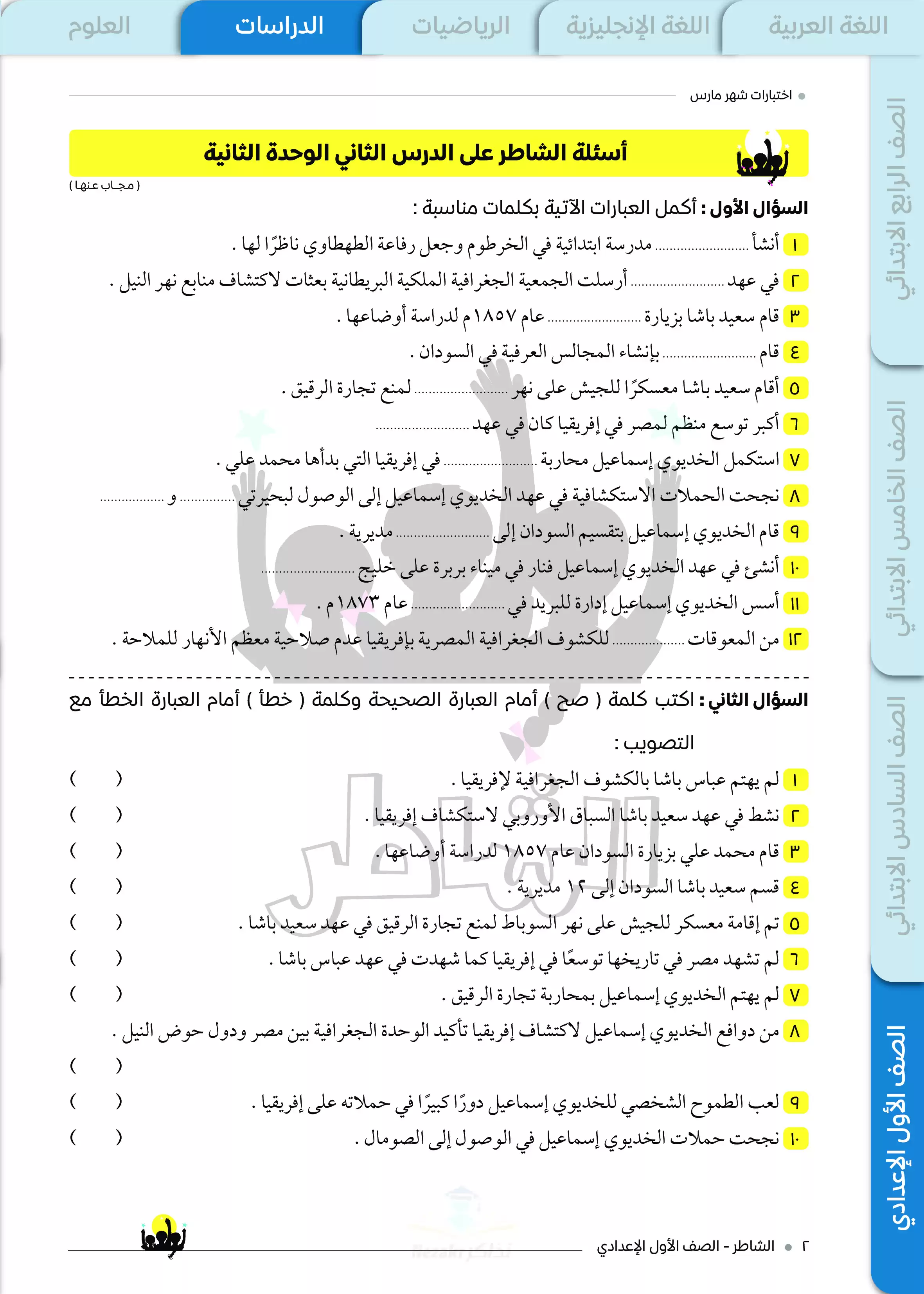 ننشر لكم المراجعة الشهرية الخاصة بشهر مارس على مقرر منهج الشهر في الدراسات الاجتماعية للصف الأول الاعدادي من كتاب الشاطر، وهي في شكل نماذج اختبارات لأولى اعدادي اعدادي مميزة مجابة على منهج الدراسات وبنك أسئلة متنوع ومميز ومجاب على دراسات شهر مارس، وكتاب الشاطر من الكتب الخارجية المميزة التي تتضمن شرح وأسئلة مميزة بأسلوب واضح وسهل، والمراجعة عبارة عن اختبارات استرشادية وبنك أسئلة على مقرر شهر مارس في مادة الدراسات مع إجاباتها النموذجية.