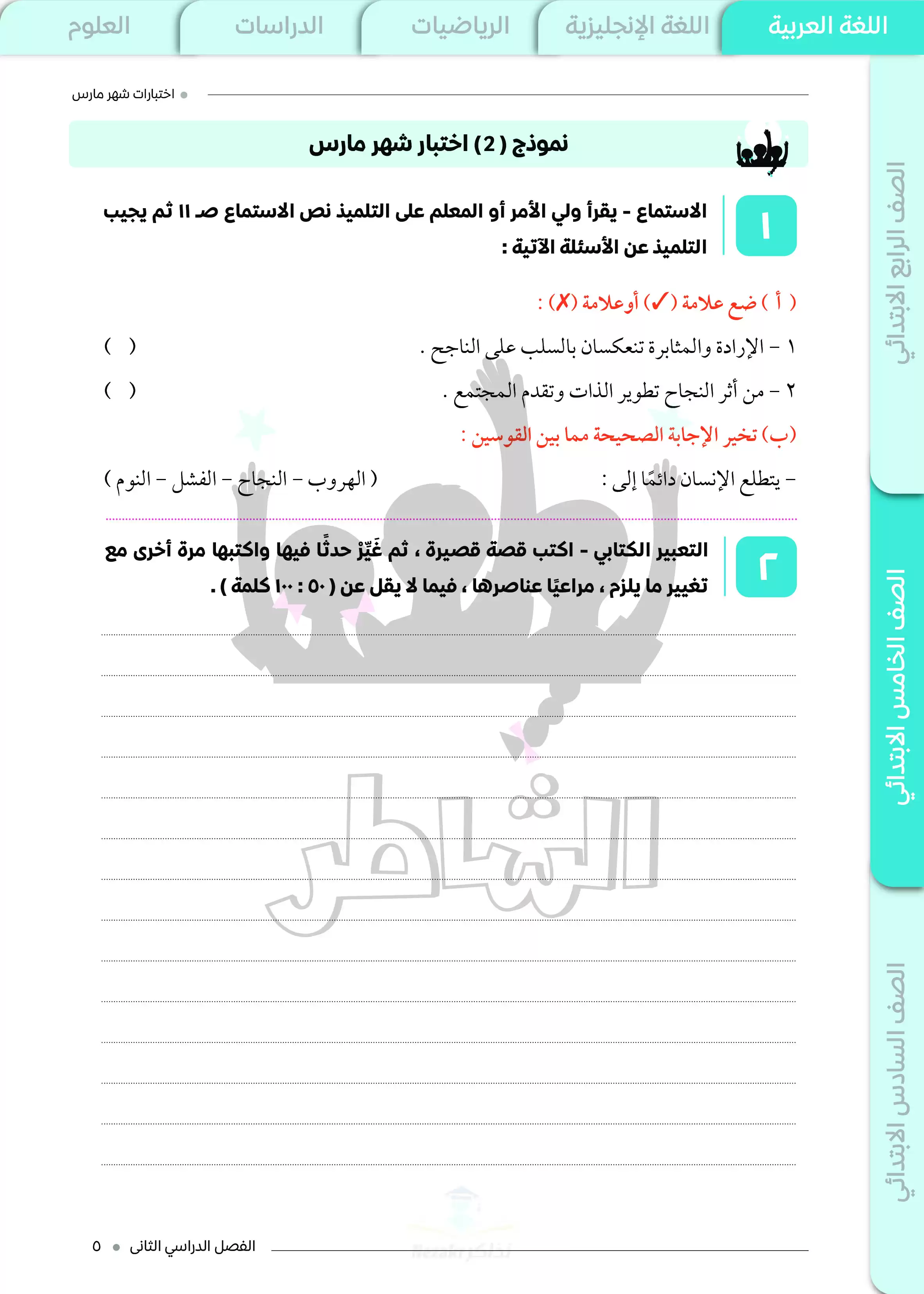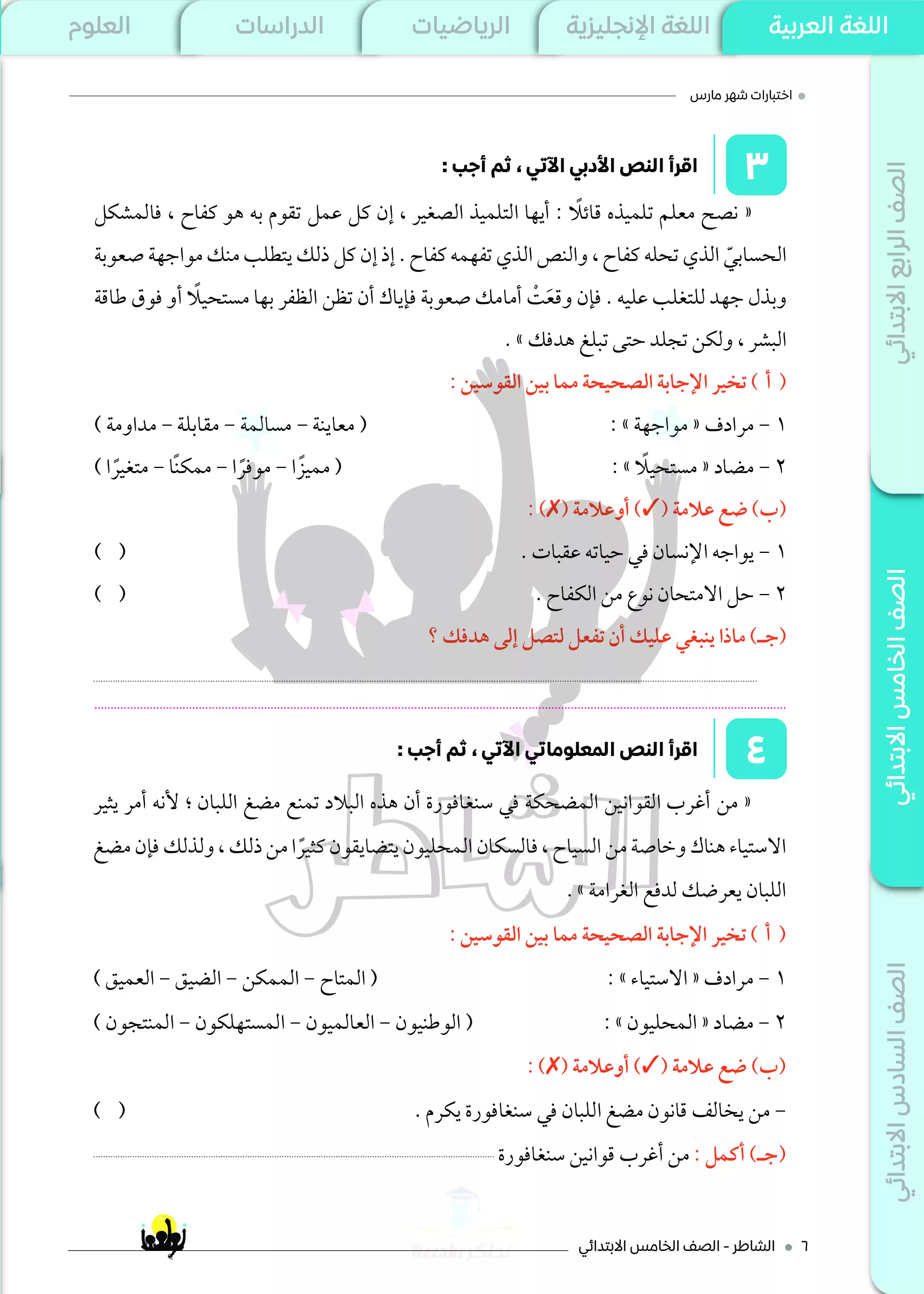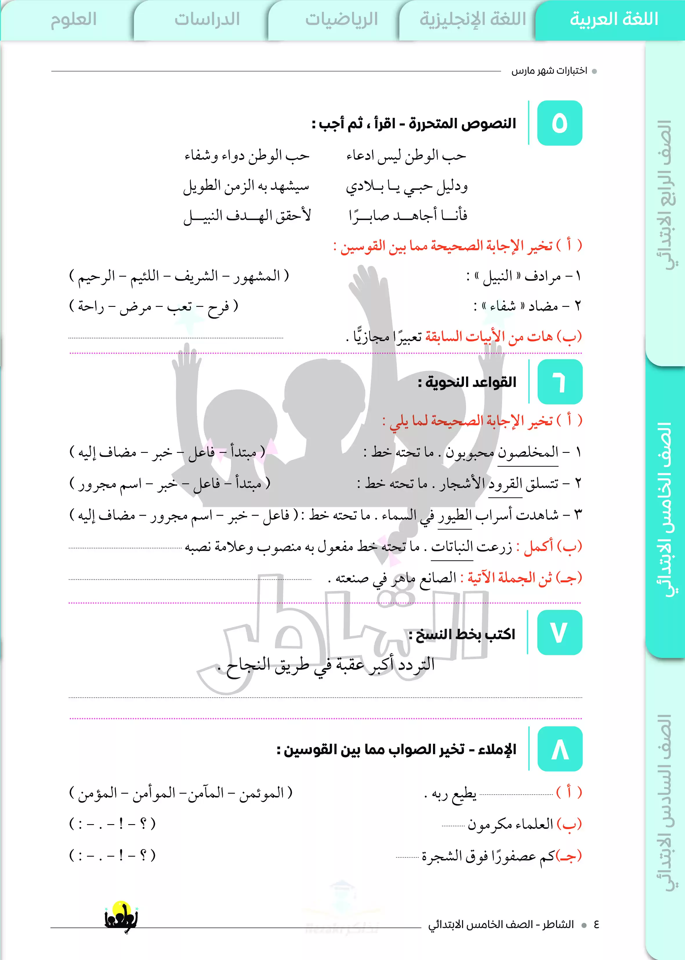 نماذج اختبارات الشاطر في اللغة العربية لخامسة ابتدائي منهج شهر مارس 2025 بصيغة PDF