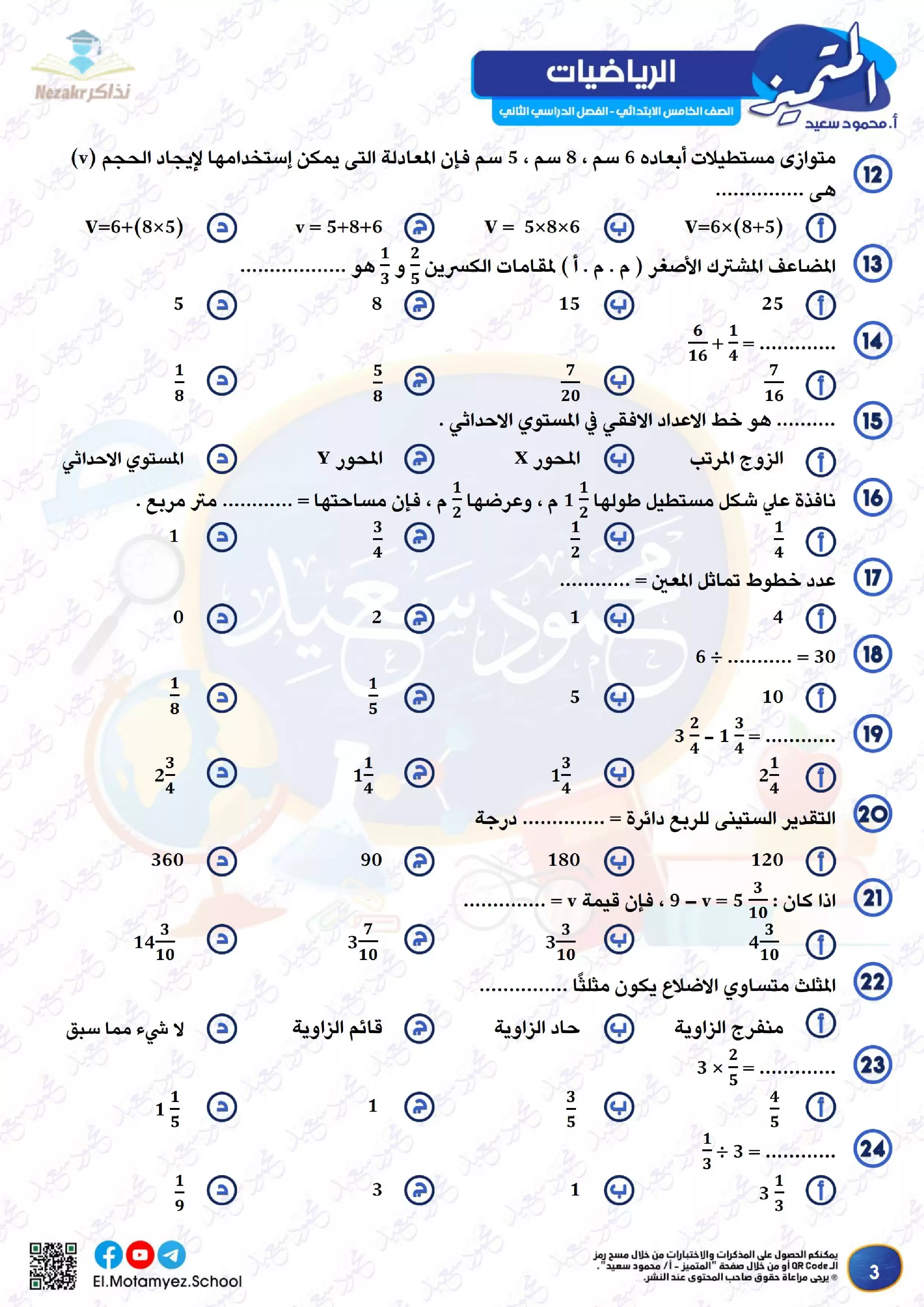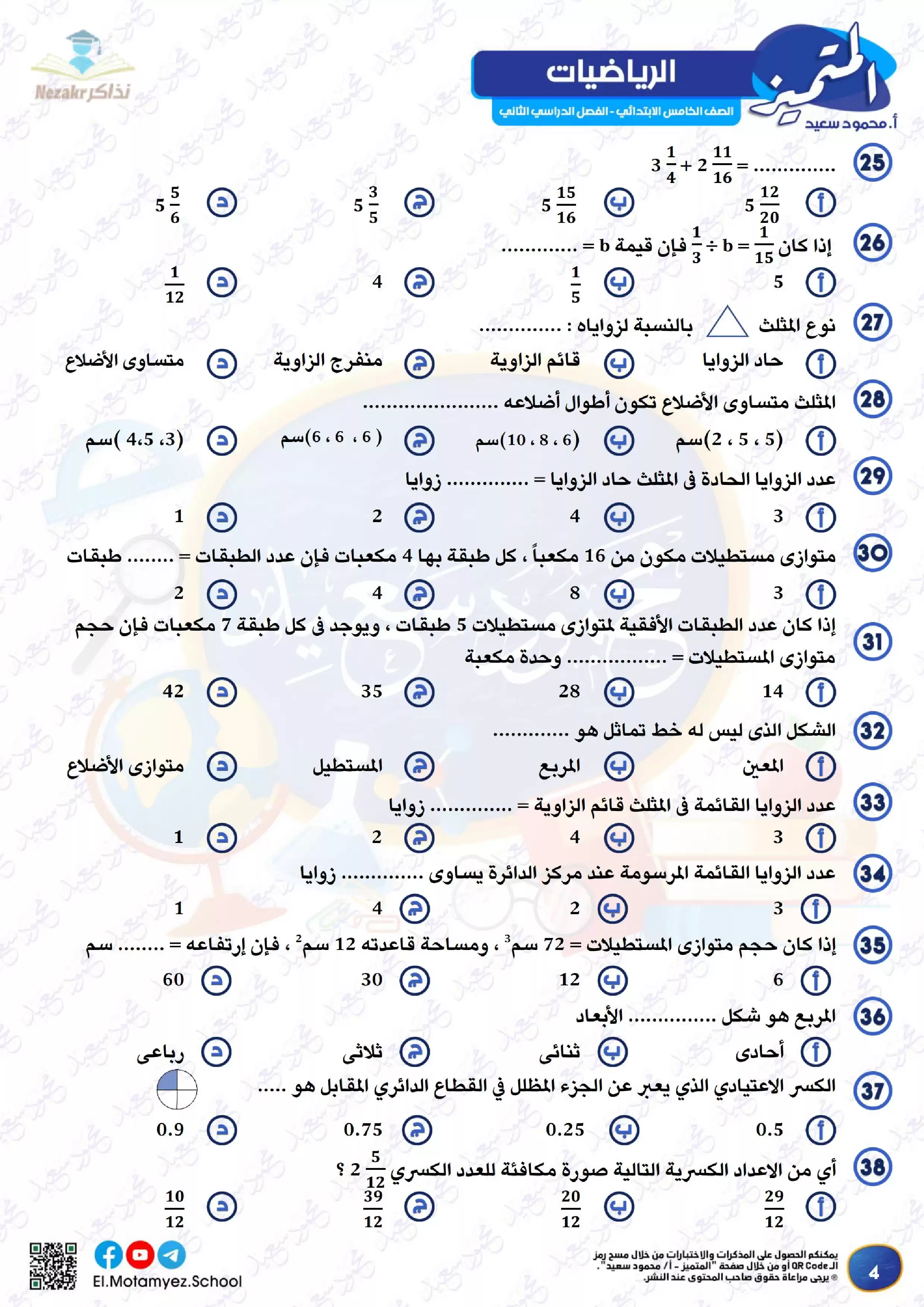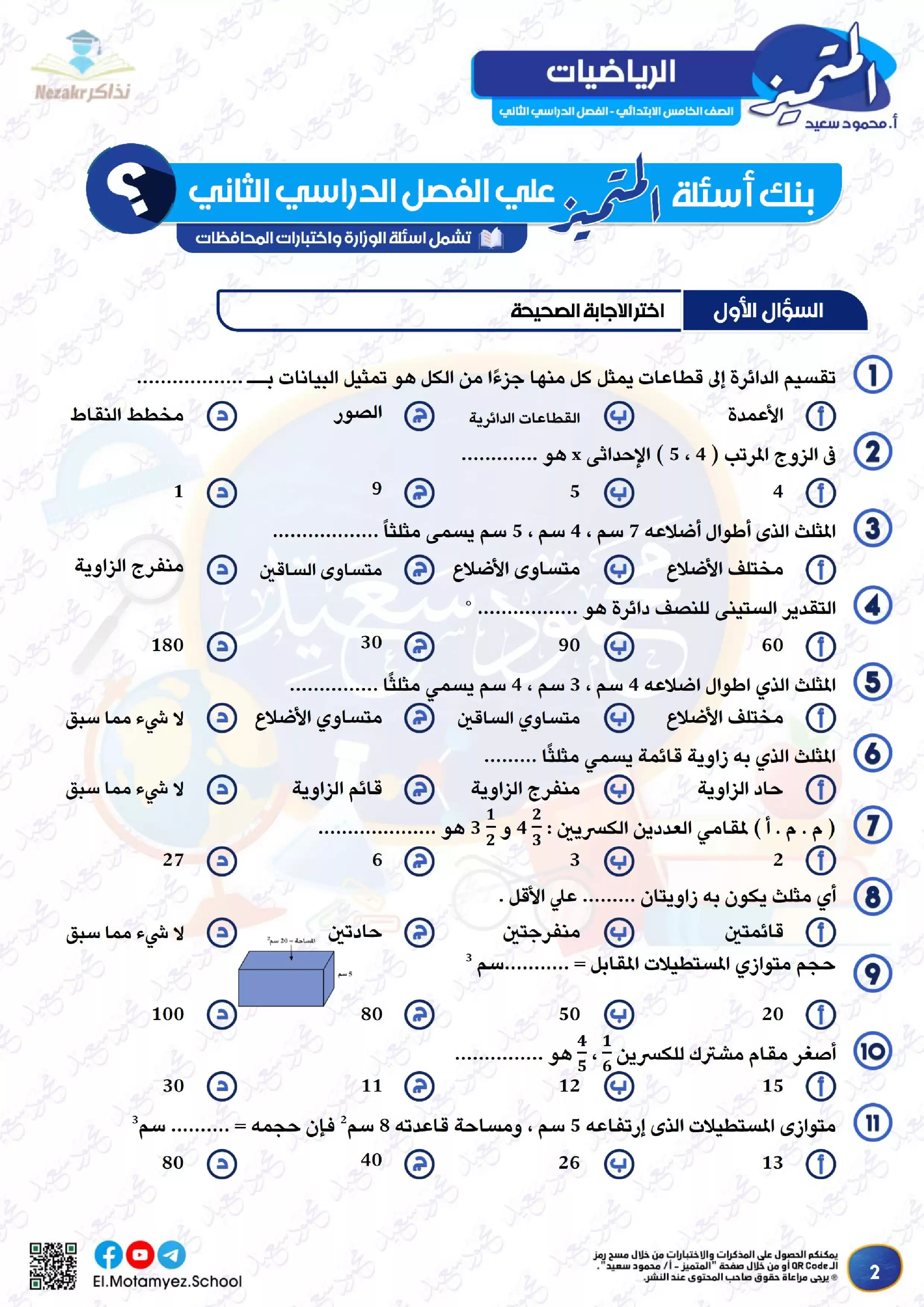 ملف المراجعة النهائية وبنك الأسئلة لمادة الرياضيات للصف الخامس الابتدائي من المتميز من إعداد: أ. منى ابراهيم و أ. مينا مراد