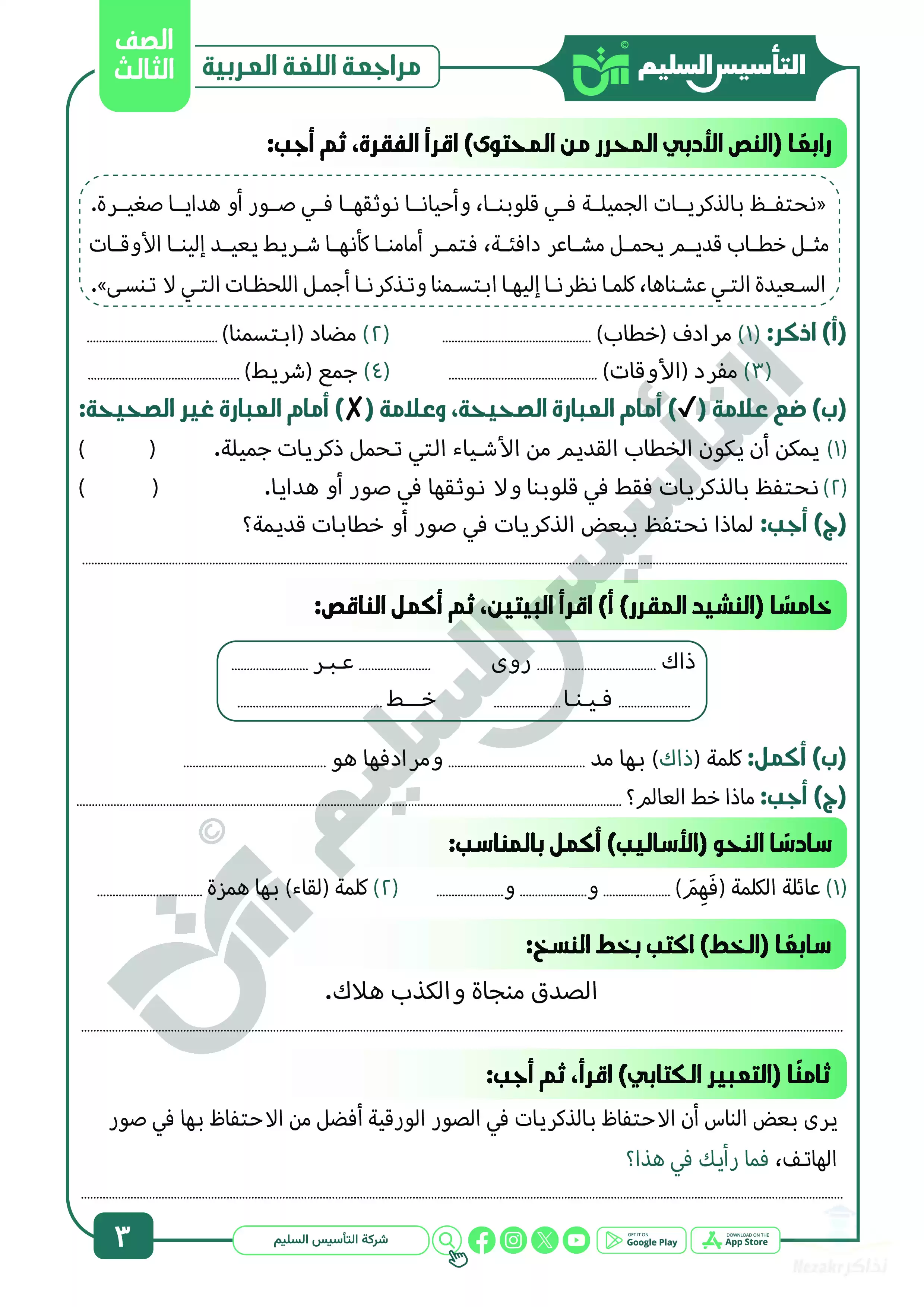 صفحة 3 من 15 صفحة من ملف: مراجعة شهر ابريل في العربي للصف الثالث الابتدائي من التأسيس السليم - Nezakr