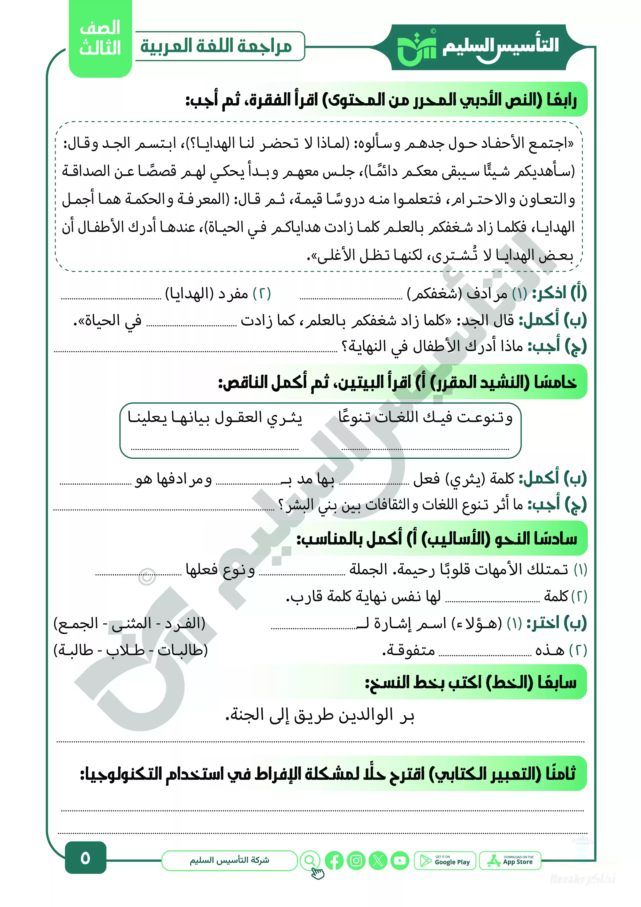 صفحة 5 من 15 صفحة من ملف: مراجعة شهر ابريل في العربي للصف الثالث الابتدائي من التأسيس السليم - Nezakr