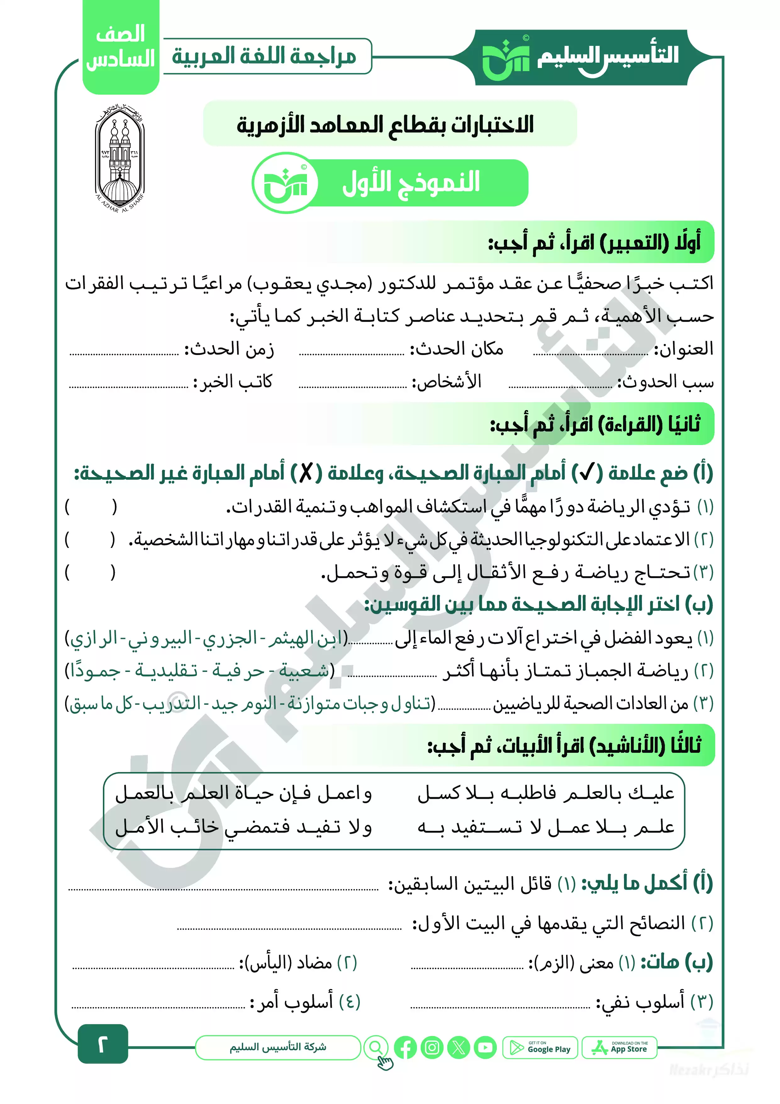صفحة 2 من 7 صفحة من ملف: مراجعة شهر ابريل في العربي للأزهر للصف السادس الابتدائي من التأسيس السليم - Nezakr