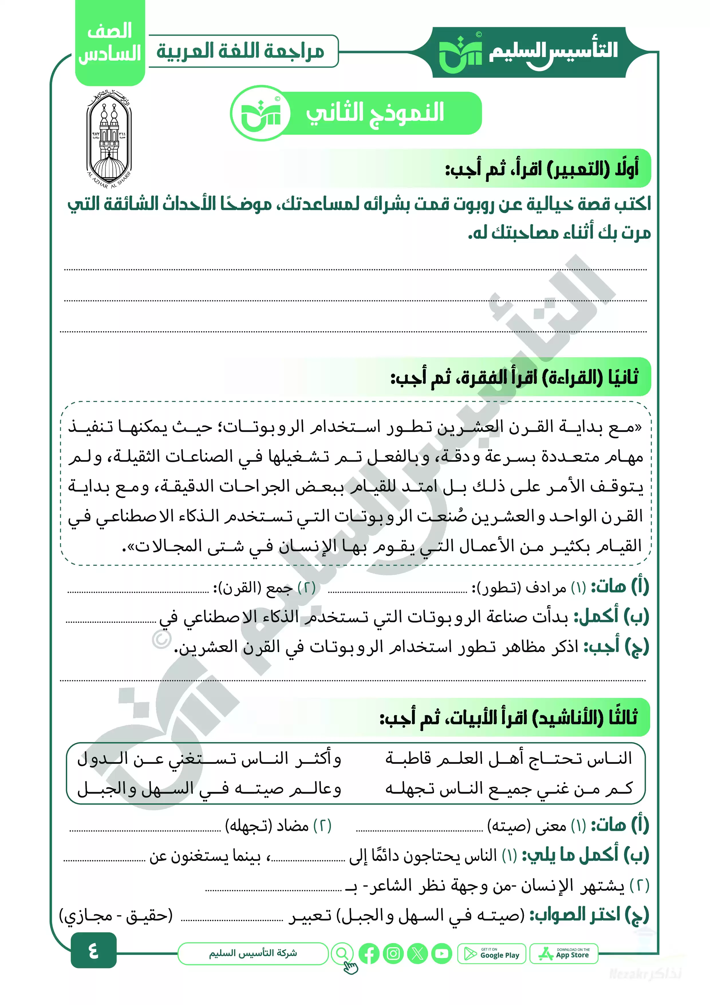 صفحة 4 من 7 صفحة من ملف: مراجعة شهر ابريل في العربي للأزهر للصف السادس الابتدائي من التأسيس السليم - Nezakr
