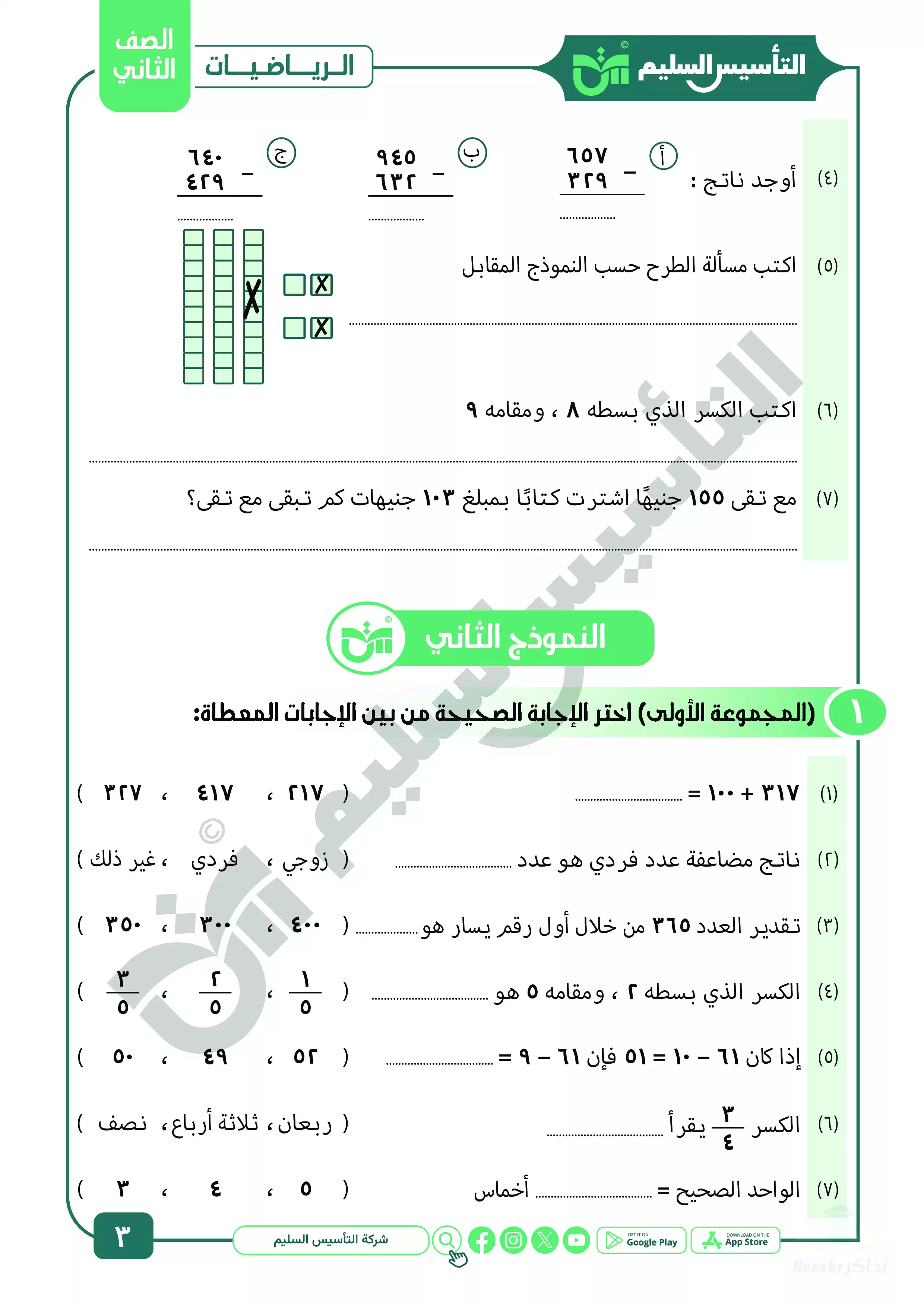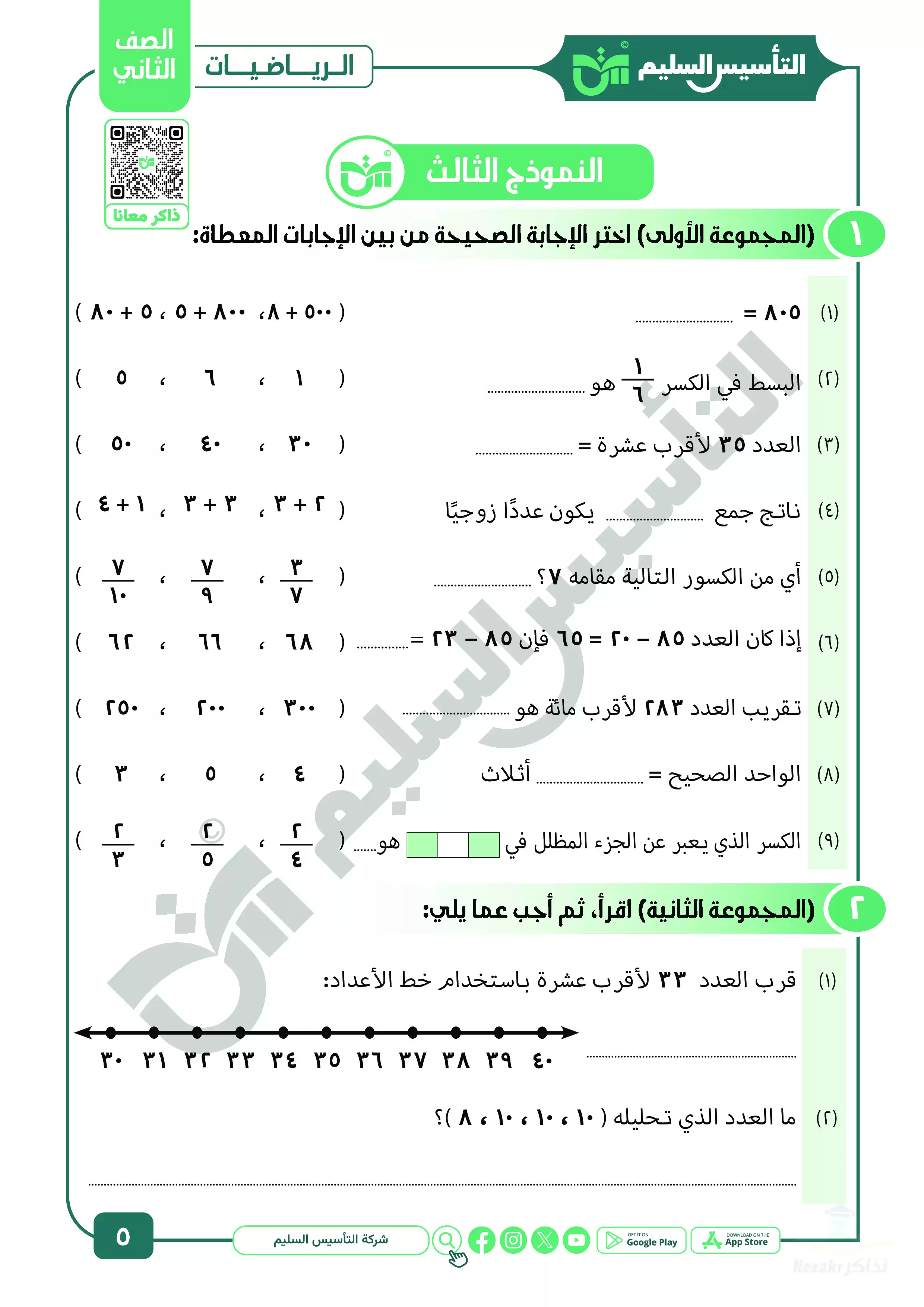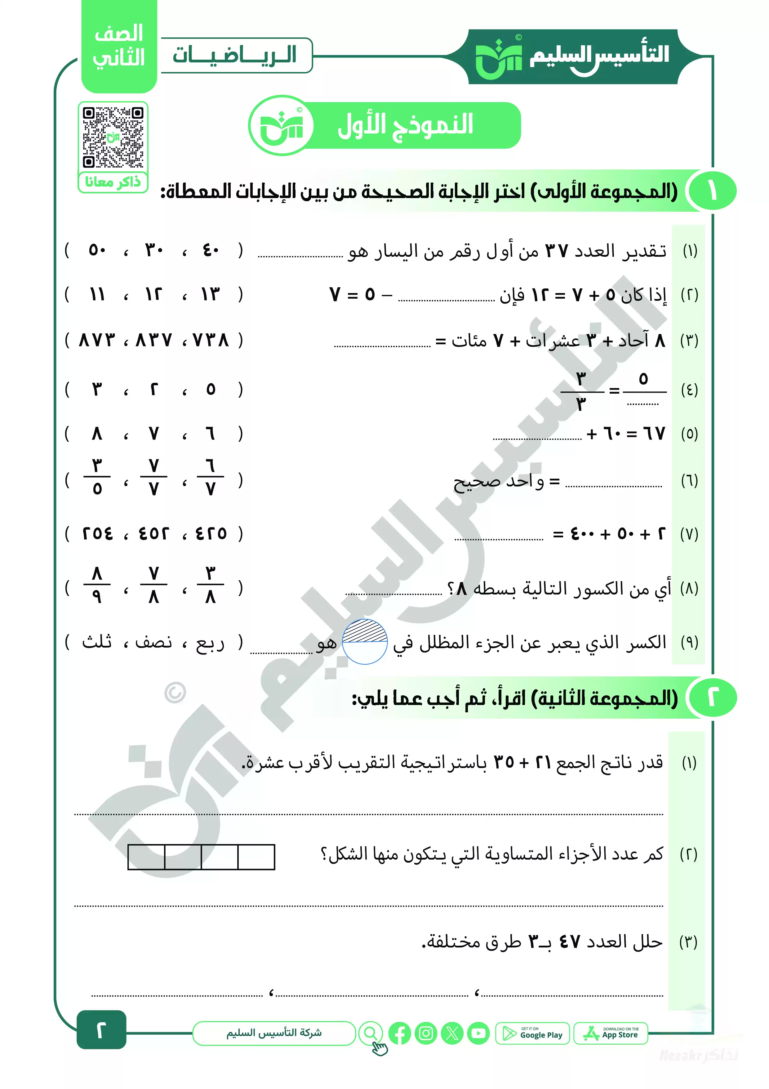 ننشر اليوم لكم مراجعة كتاب التأسيس السليم على منهج مادة الرياضيات للصف الثاني الابتدائي في شهر أبريل للعام الدراسي 2025، وهي مراجعة مميزة جداً ننشرها لكم بصيغة PDF وبجودة عالية متاحة للتحميل والتصفح مجاناً بحيث يمكنكم تجهيزها للطباعة بسهولة نظراً لجودتها المتميزة، وتتضمن المراجعة اختبارات مجابة على مقرر مادة الحساب لثانية ابتدائي بجودة عالية ومميزة، وكذلك بنك أسئلة مميز ومجاب على مقرر شهر أبريل في الحساب ليتدرب عليها تلاميذ الصف الثاني الابتدائي.