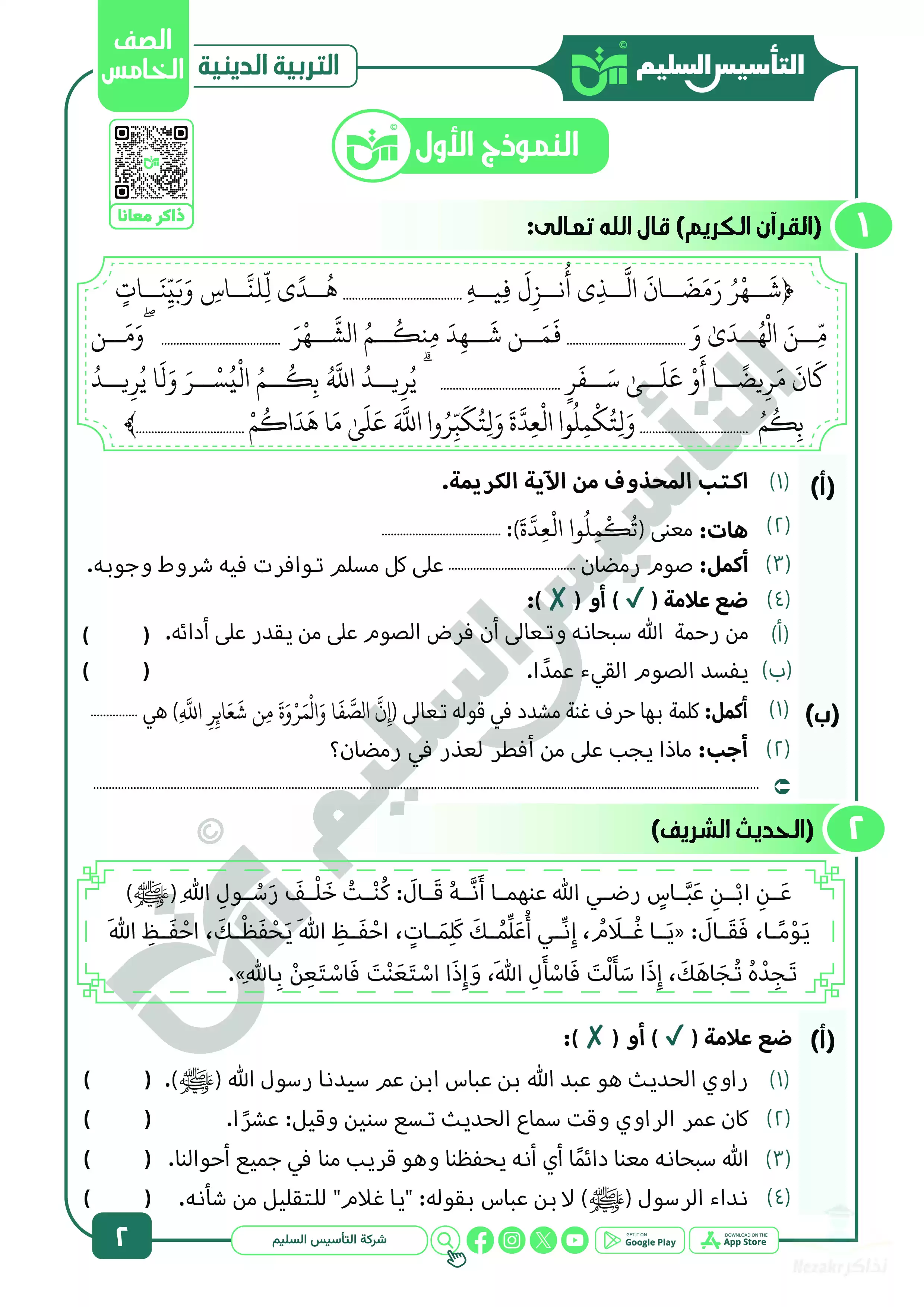 صفحة 2 من 39 صفحة من ملف: مراجعة شهر ابريل في التربية الدينية للصف الخامس الابتدائي من التأسيس السليم - Nezakr