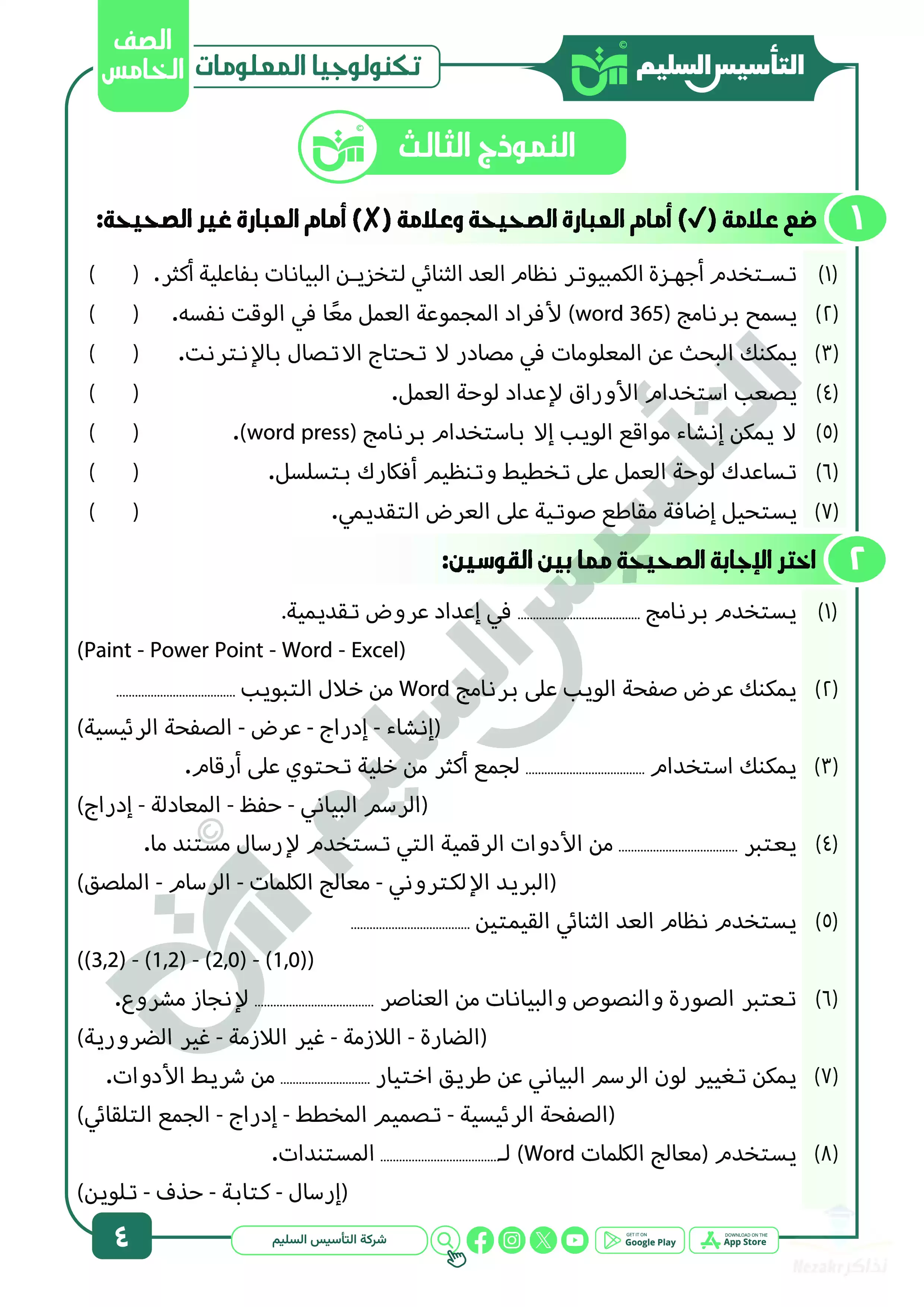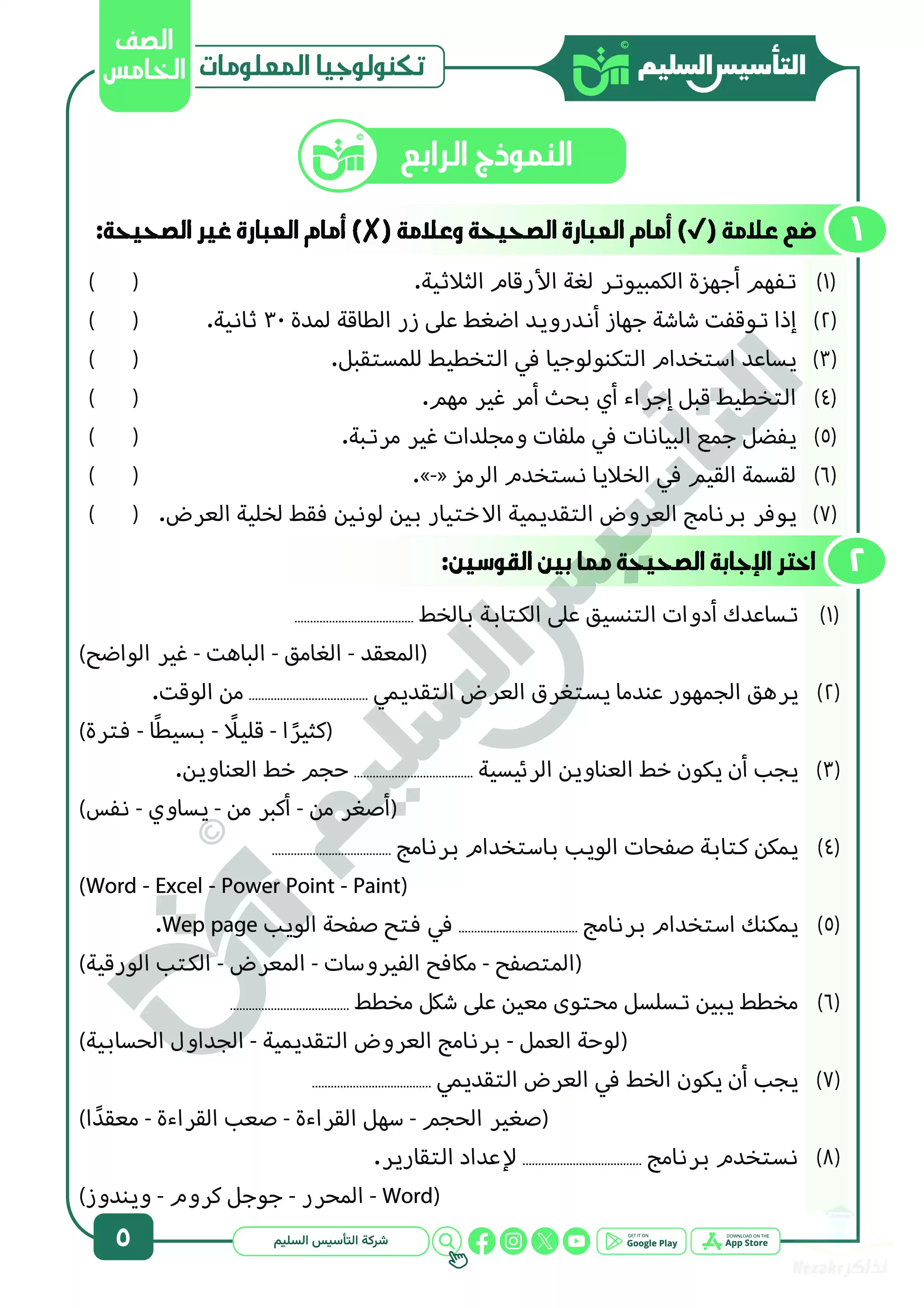 بيانات الملف: (مراجعة شهر ابريل في تكنولوجيا المعلومات والاتصالات للصف الخامس الابتدائي من التأسيس السليم - Nezakr)