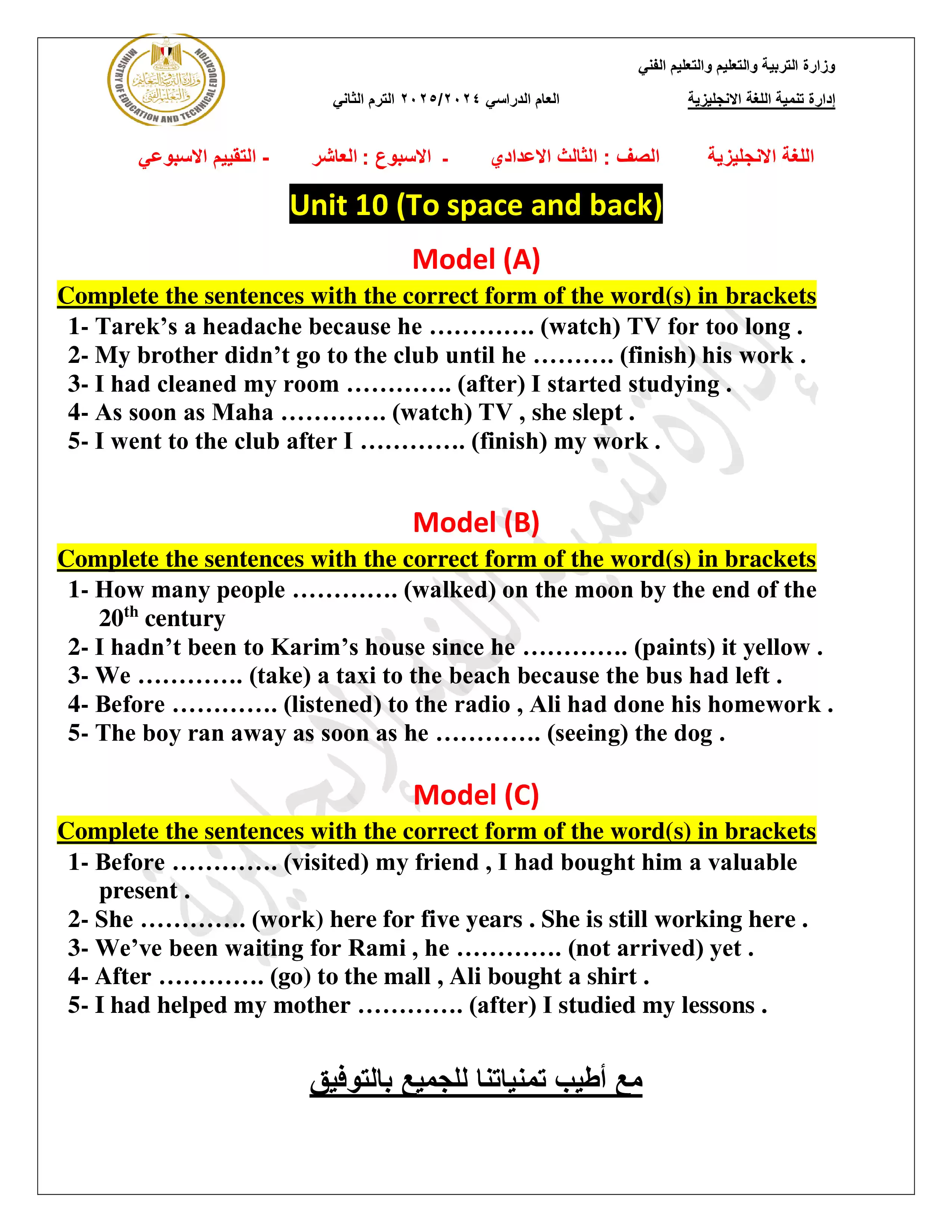 تقييمات الأسبوع العاشر في مادة اللغة الإنجليزية للصف الثالث الاعدادي الترم الثاني 2025 بصيغة PDF