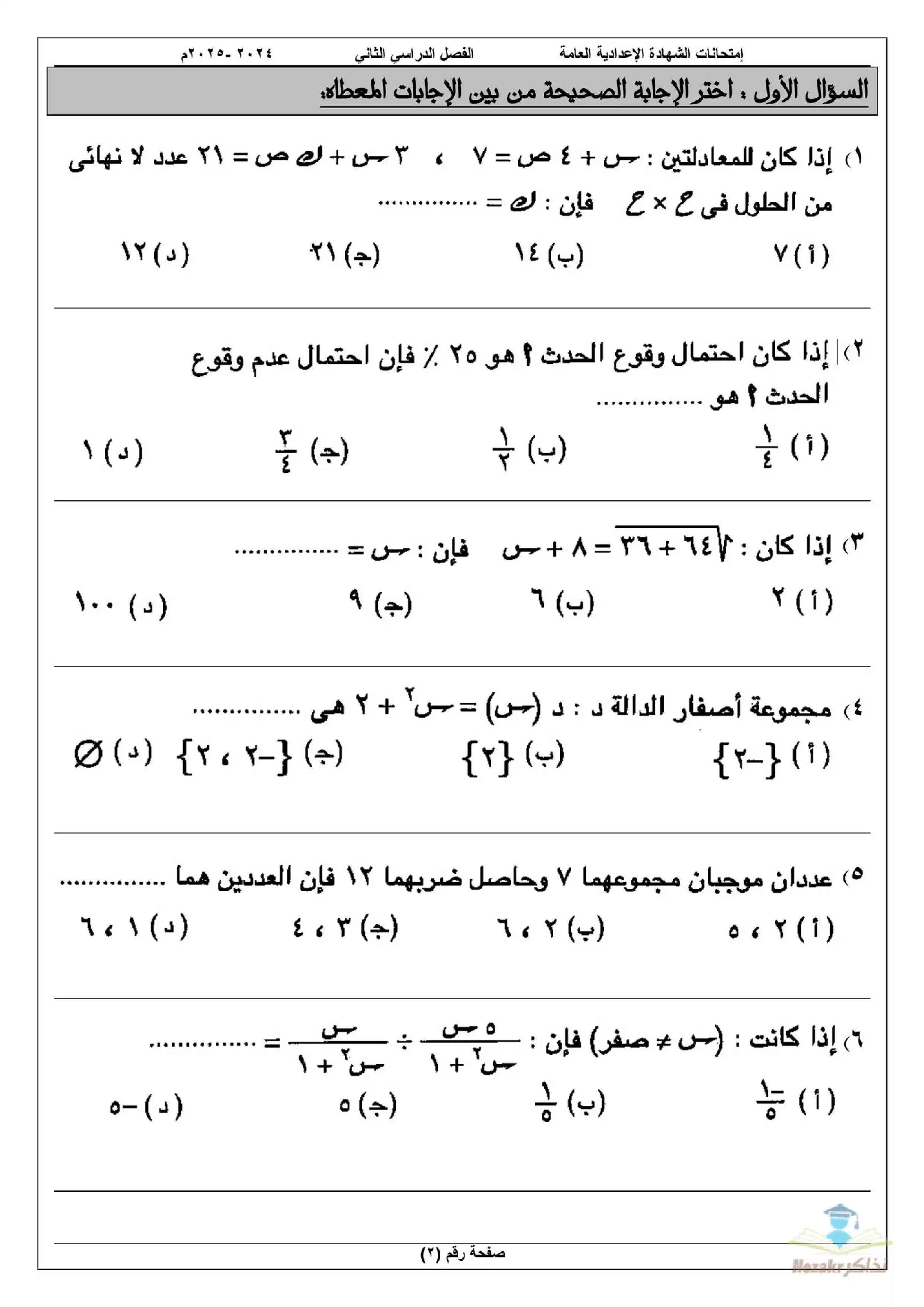 | بيانات الملف: (نموذج اختبار بوكلت استرشادي في الجبر للصف الثالث الاعدادي محافظة أسوان ترم ثاني 2025 - Nezakr) | |