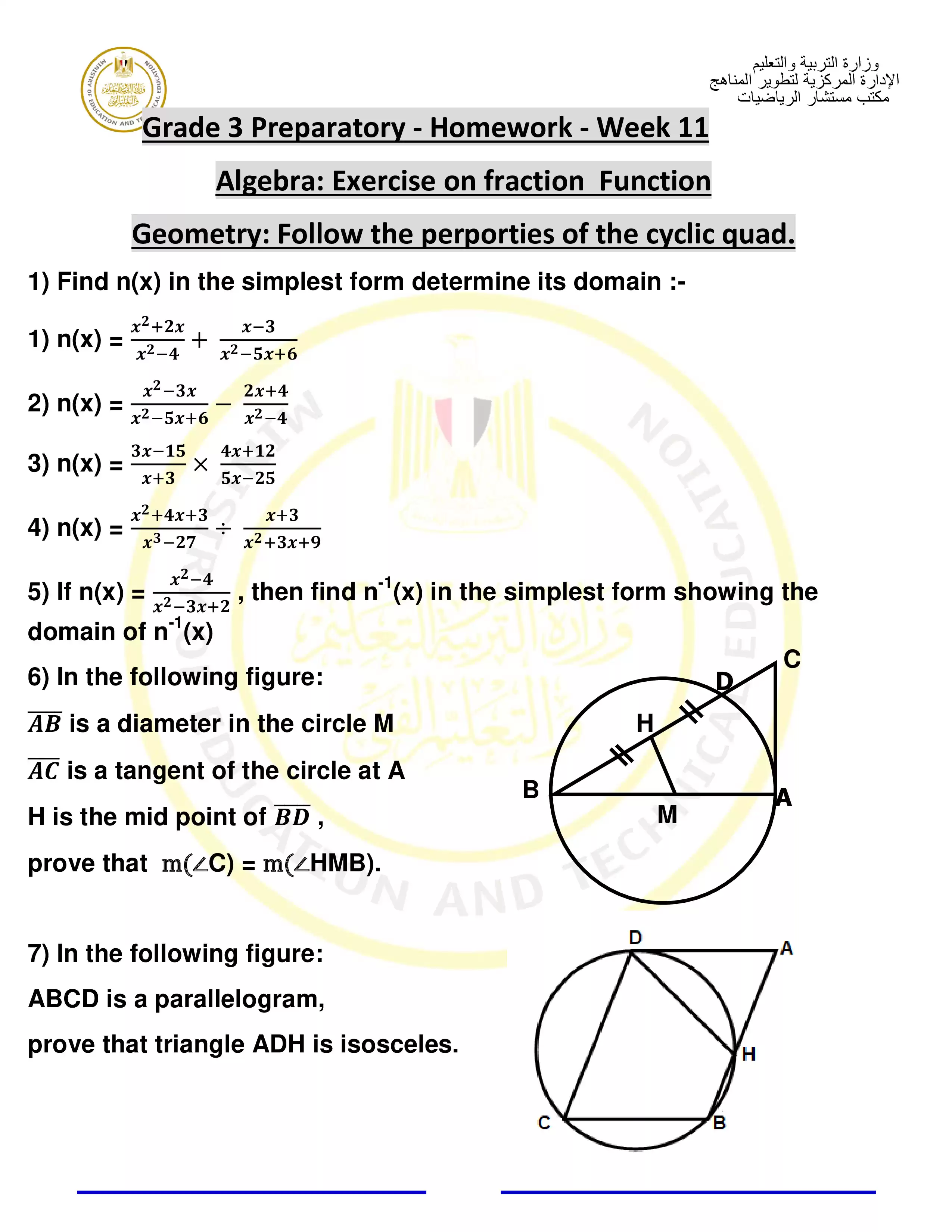 • الآداء المنزلي للصف الثالث الاعدادي في الماث Math