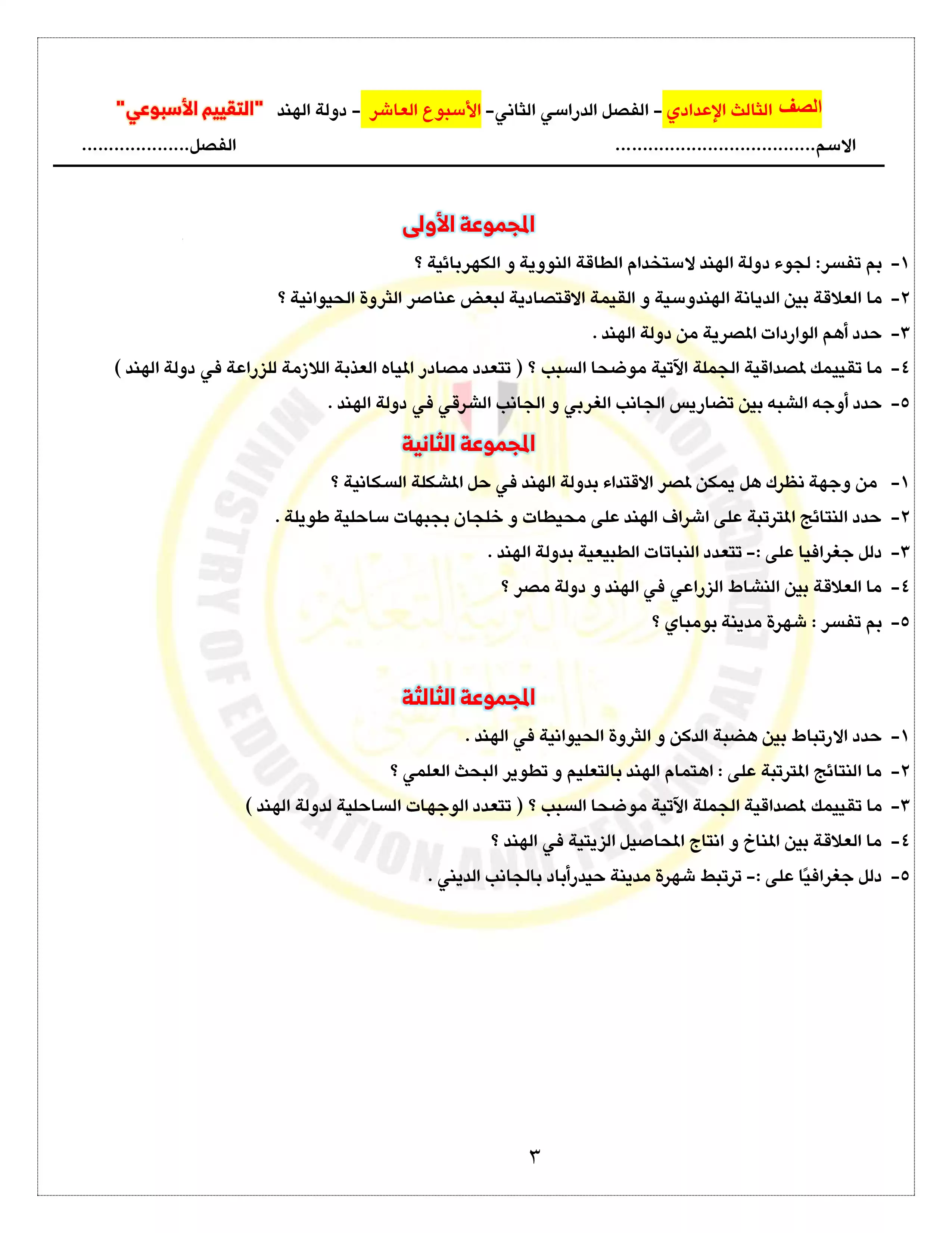 صفحة 3 من 5 صفحة من ملف: التقييمات والآداءات الصفية والمنزلية الخاصة بالأسبوع العاشر في الدراسات للصف الثالث الاعدادي الترم الثاني 2025 - Nezakr