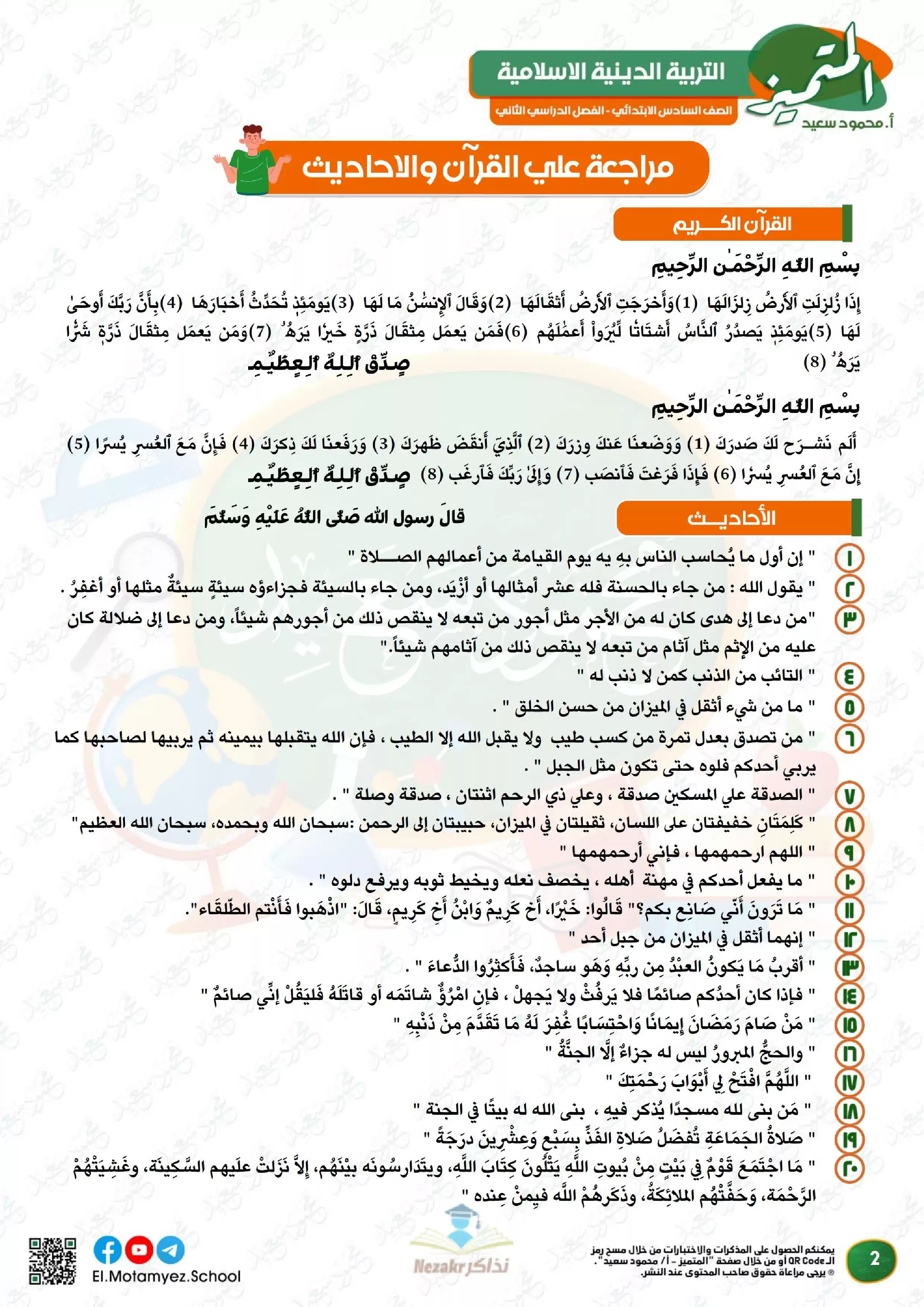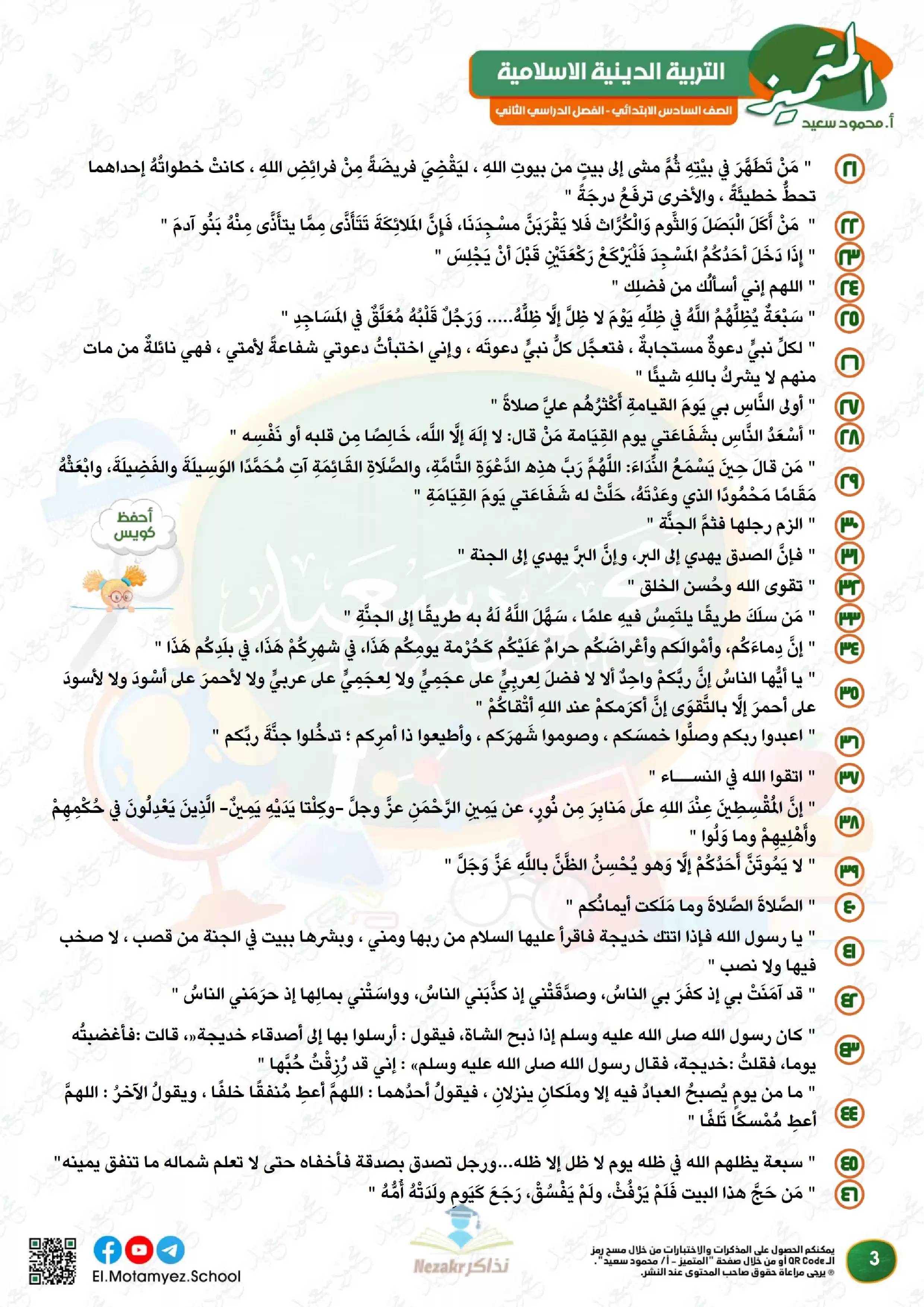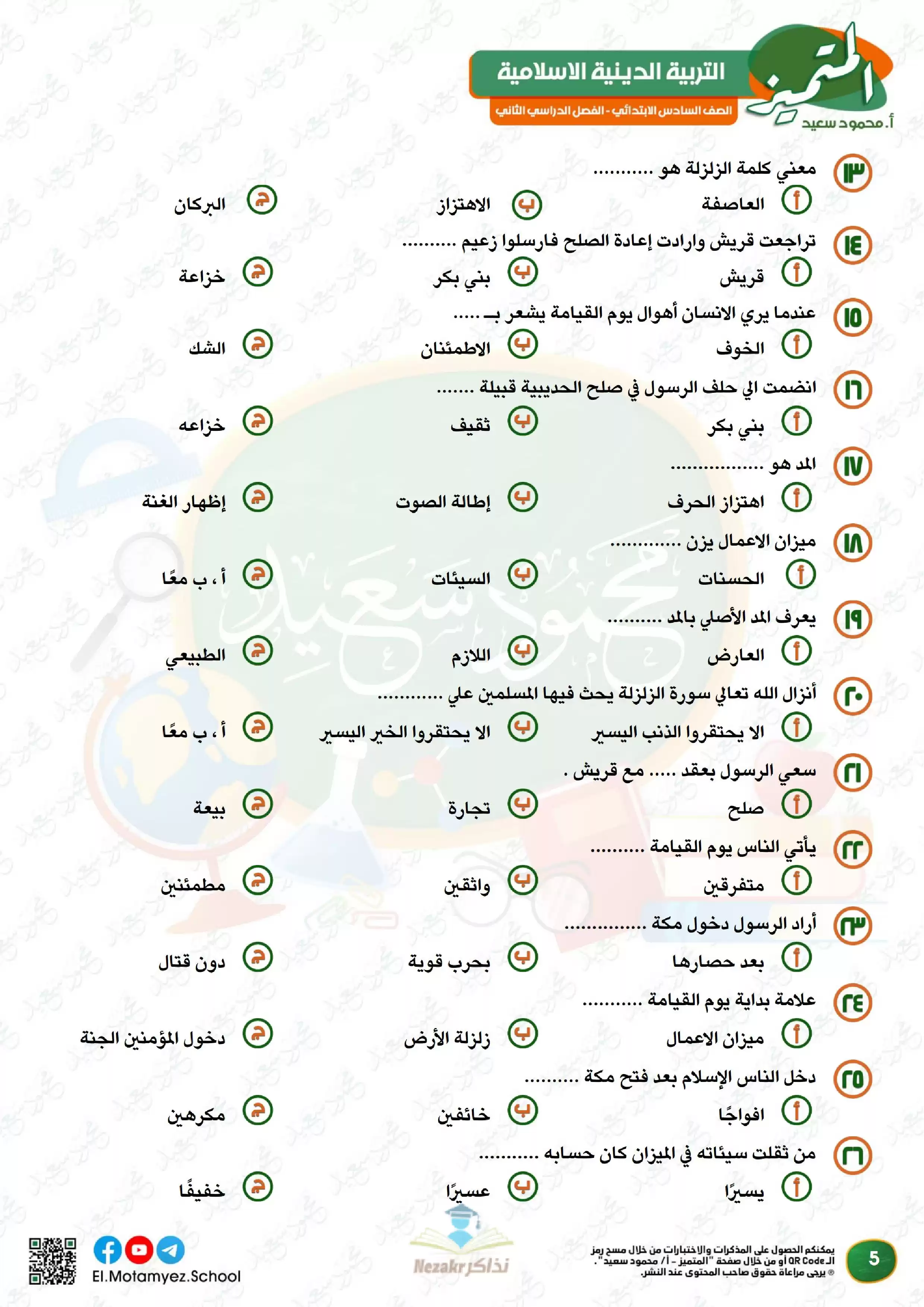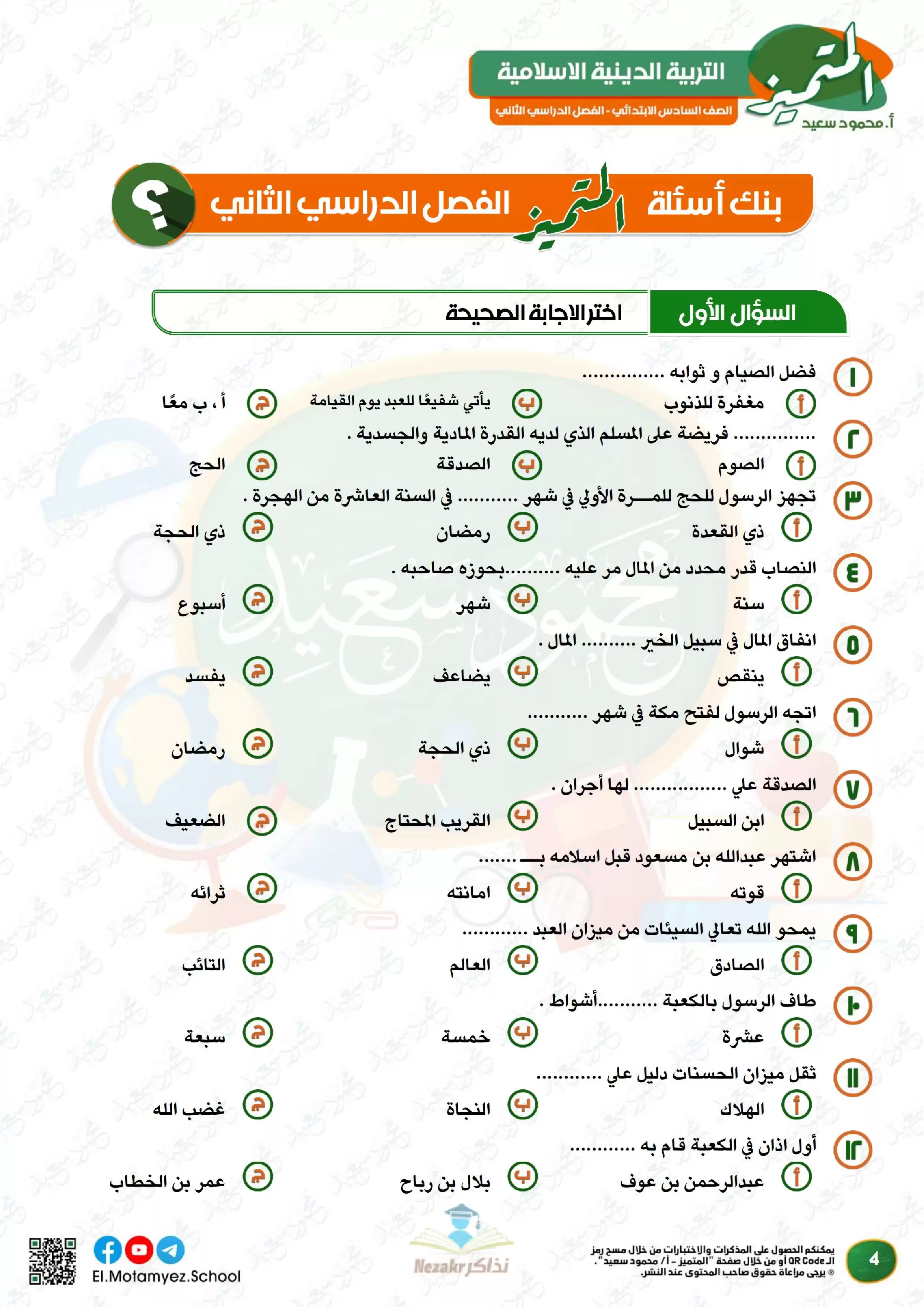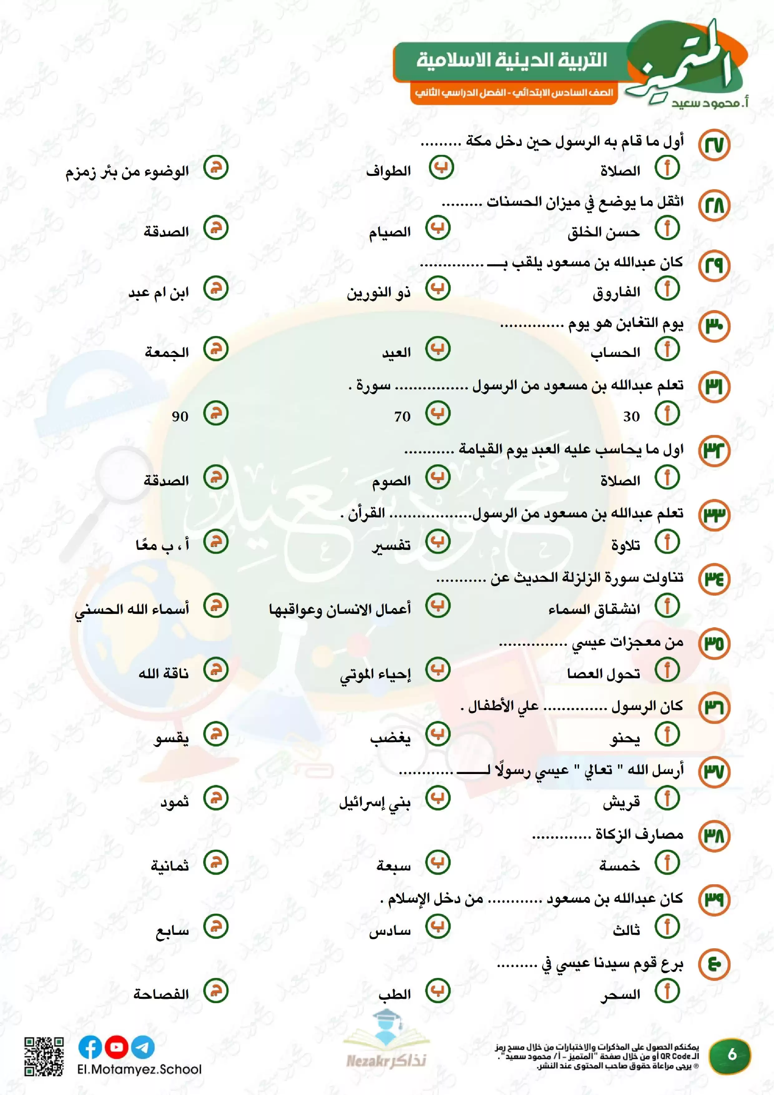 ملف المراجعة النهائية وبنك الأسئلة لمادة التربية الدينية الاسلامية للصف السادس الابتدائي من المتميز من إعداد: أ. محمود محمد, أ. عبدالرحمن جمعة