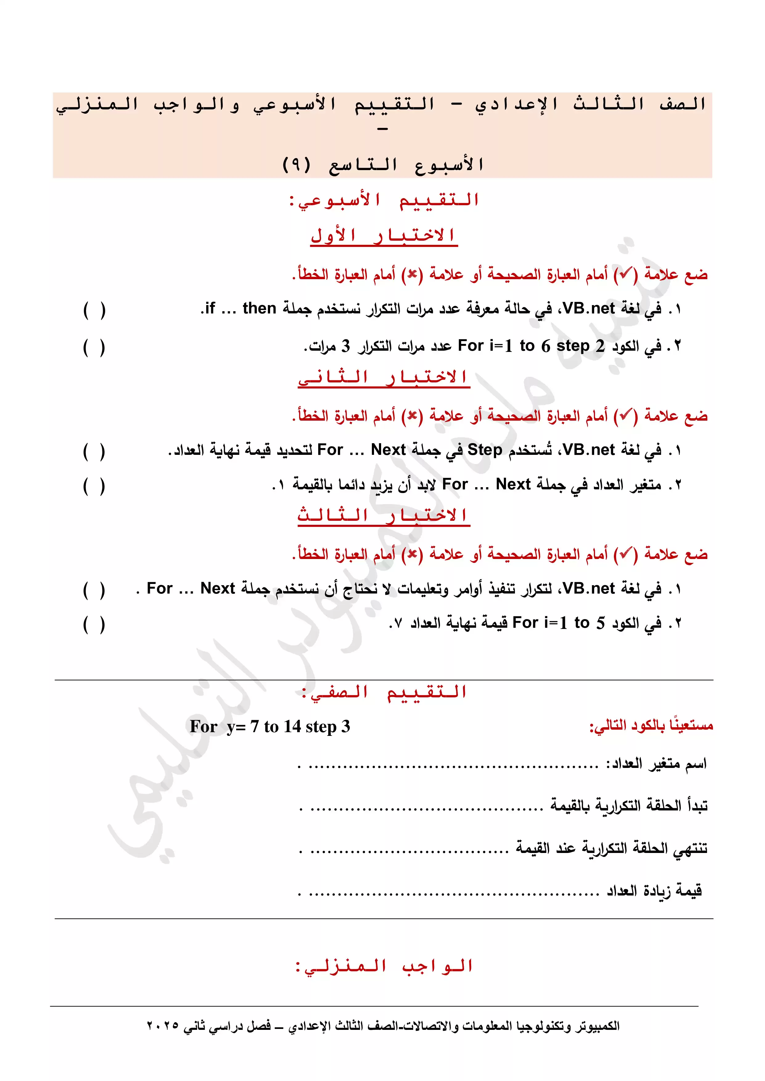 • التقييم الأسبوعي التاسع في مادة تكنولوجيا المعلومات والاتصالات للصف الثالث الاعدادي الترم الثاني 2025