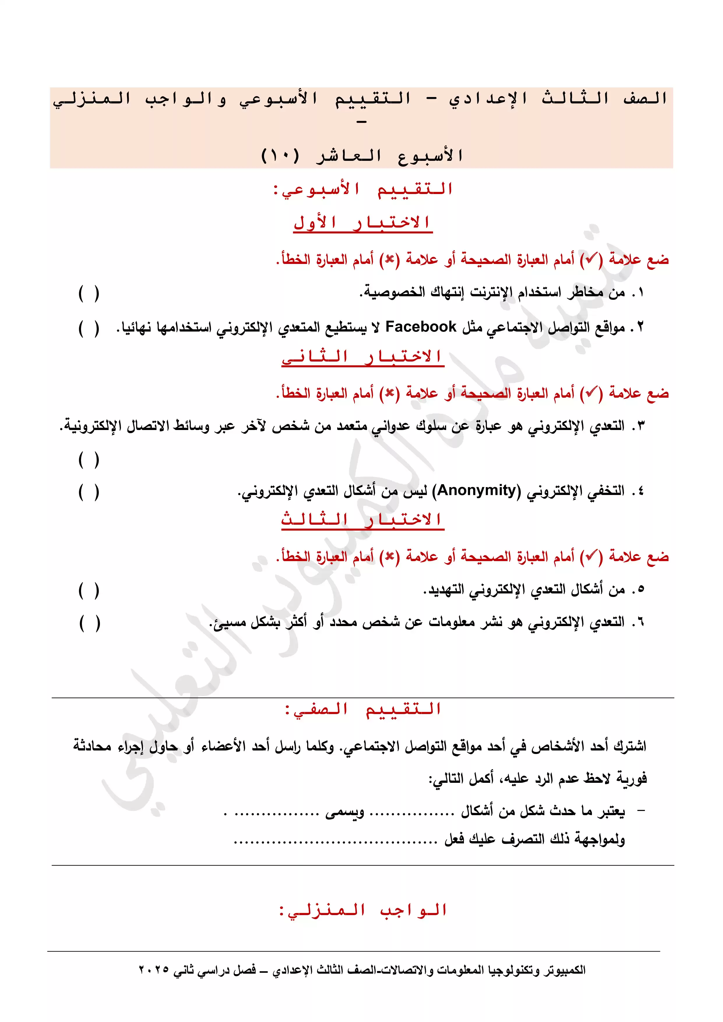 تقييمات الأسبوع العاشر في مادة تكنولوجيا المعلومات والاتصالات لثالثة اعدادي الترم الثاني 2025 بصيغة PDF