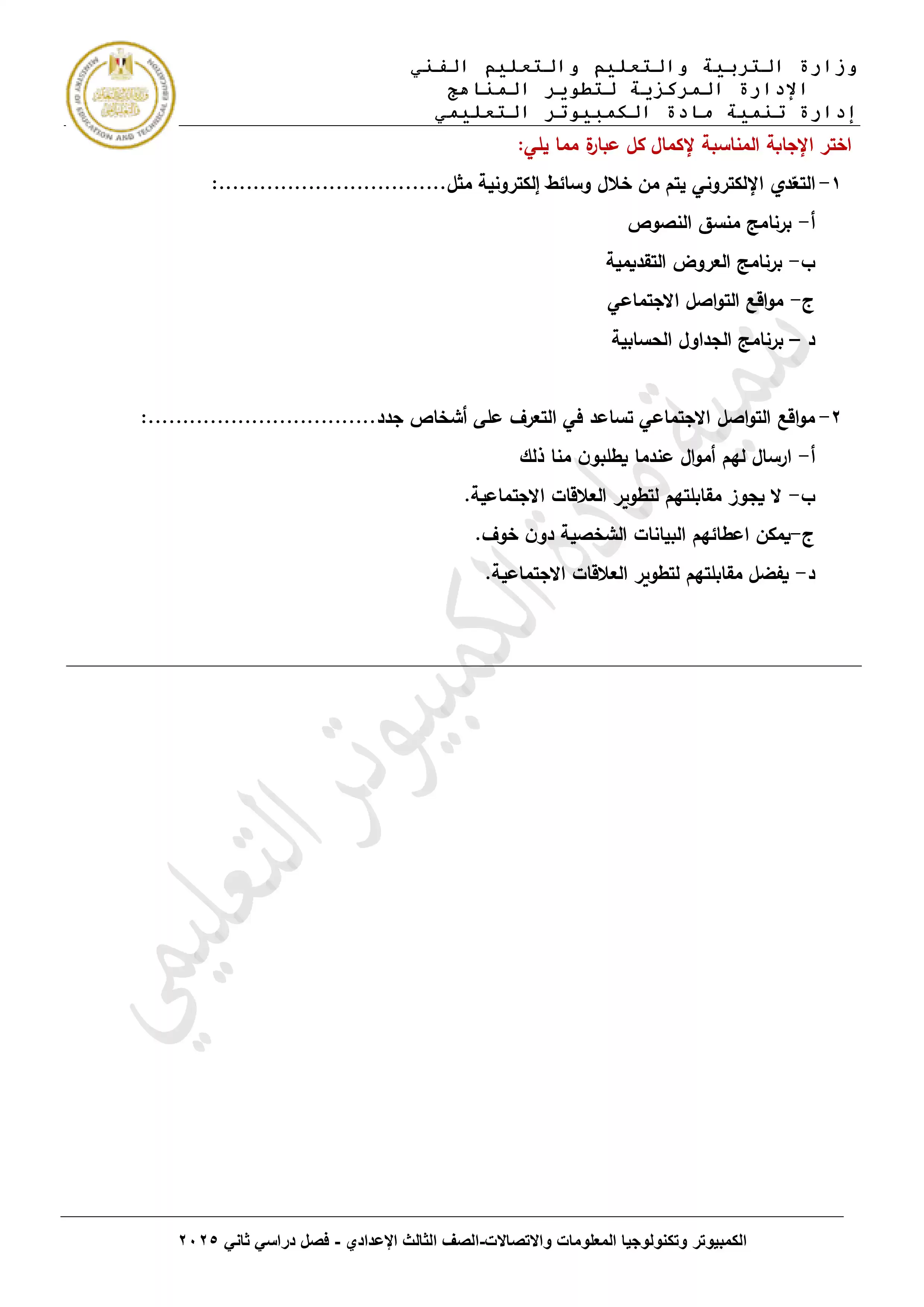 صفحة 2 من 3 صفحة من ملف: التقييمات الخاصة بالأسبوع العاشر في تكنولوجيا المعلومات والاتصالات للصف الثالث الاعدادي الترم الثاني 2025 - Nezakr