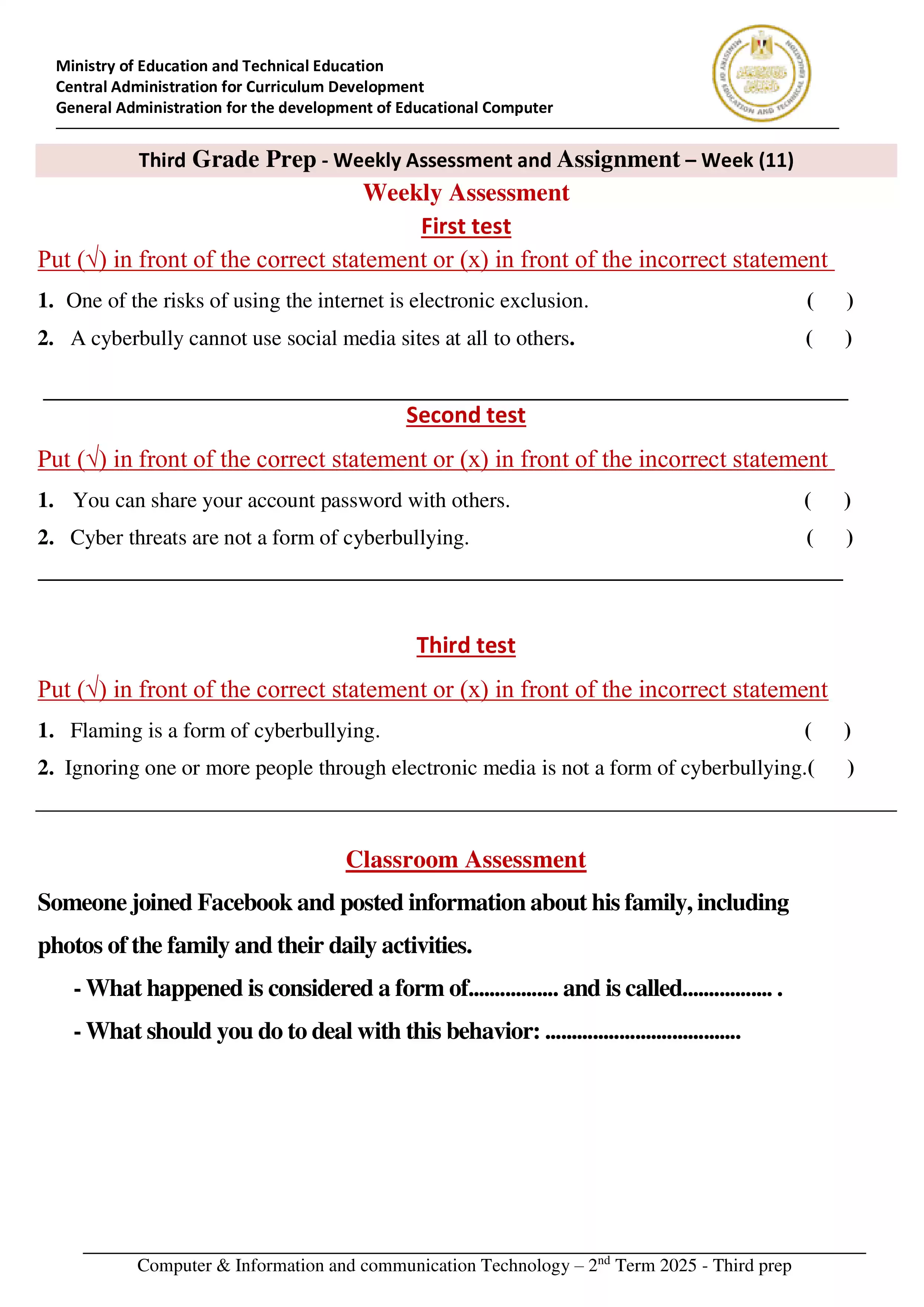 تقييمات الوزارة والأداء الصفي والمنزلي للصف الثالث الإعدادي الترم الثاني 2025