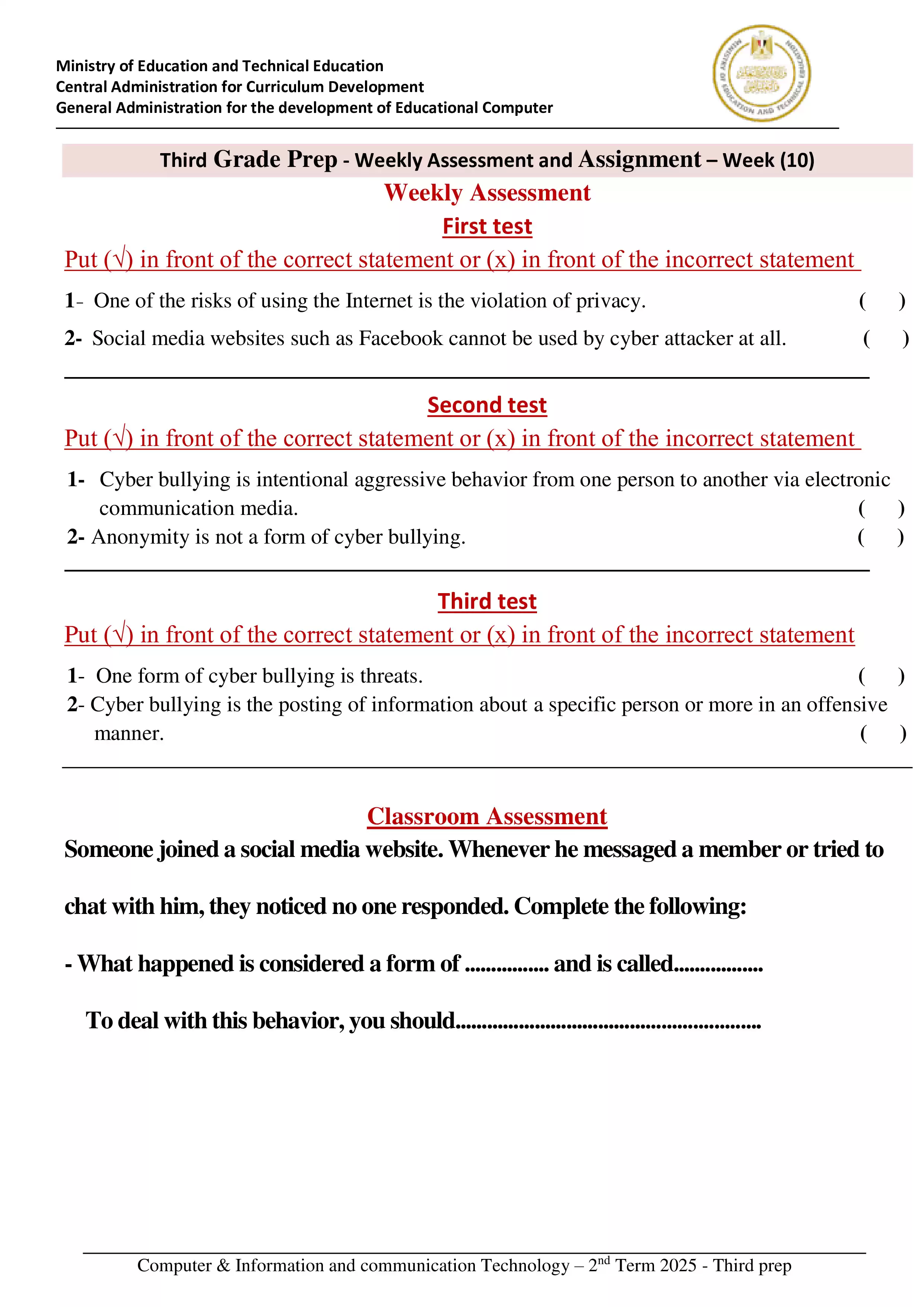 | بيانات الملف: (التقييمات الخاصة بالأسبوع العاشر في تكنولوجيا المعلومات والاتصالات لغات ICT للصف الثالث الاعدادي الترم الثاني 2025 - Nezakr) | |