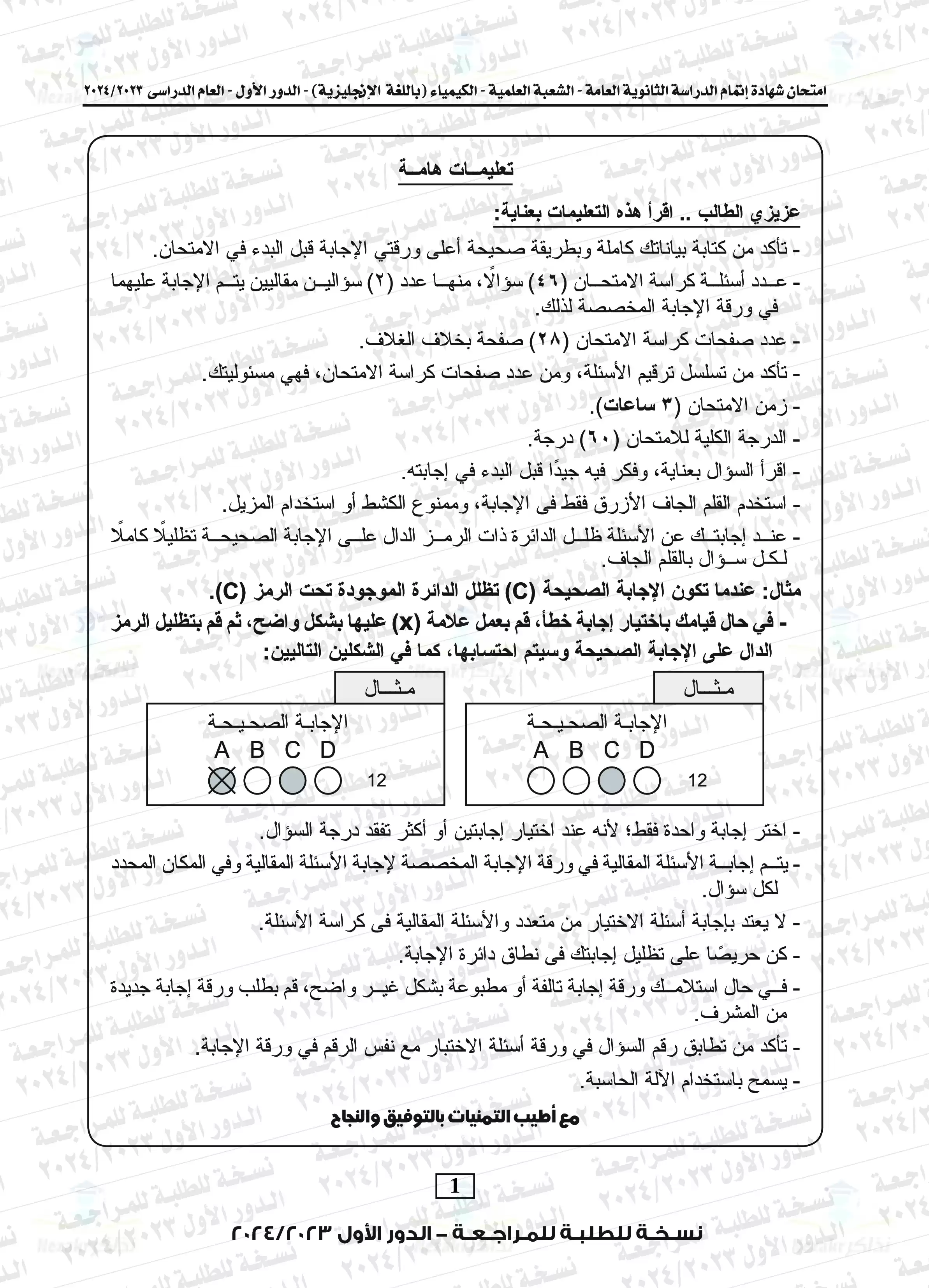 امتحان الكيمسترى Chemistry للثانوية العامة الدور الأول 2024 بصيغة PDF بنموذج الإجابات الرسمي