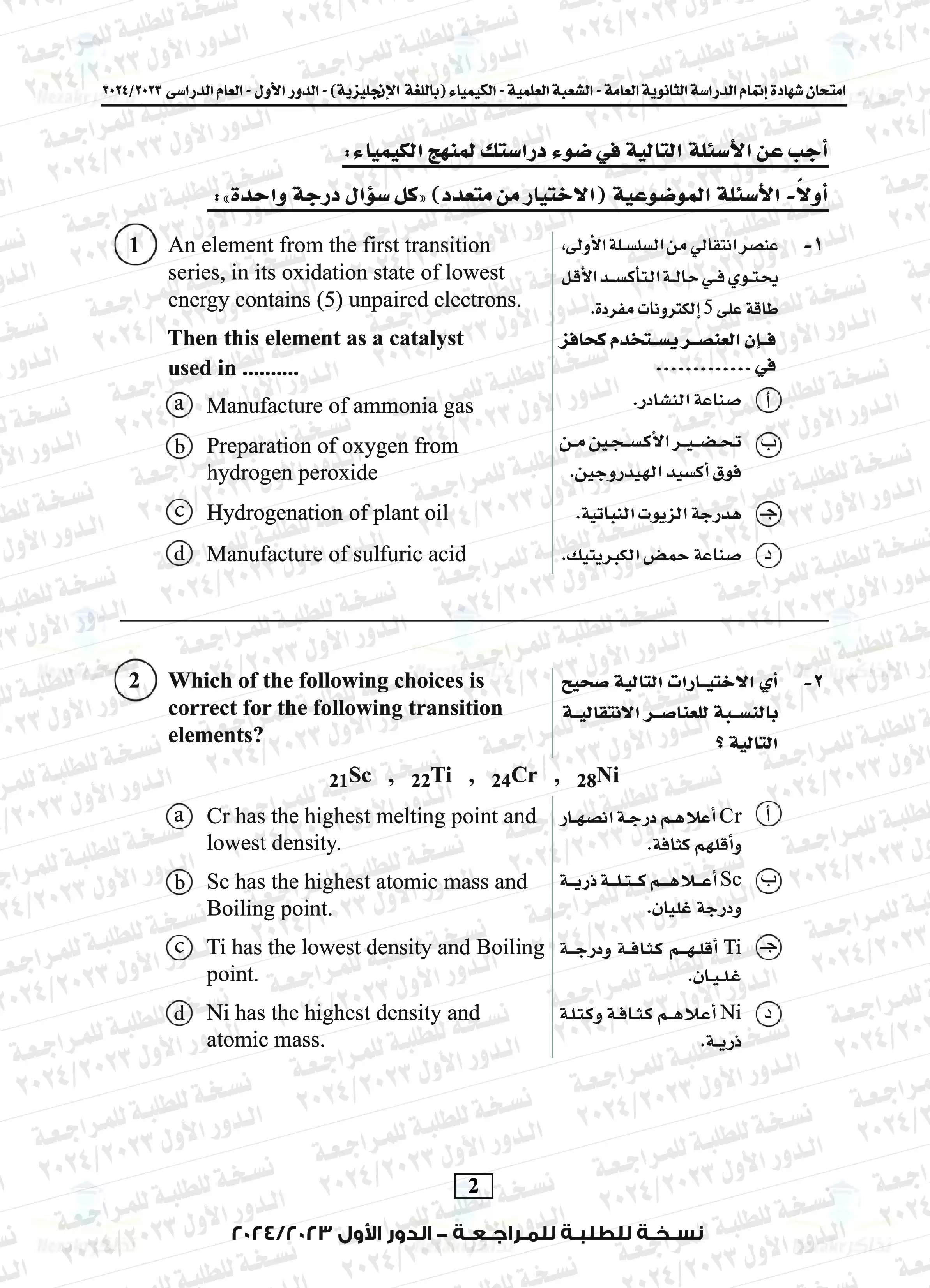 صفحة 2 من 37 صفحة من ملف: امتحان الكيمياء باللغة الإنجليزية Chemistry للثانوية العامة الدور الأول 2024 مع نموذج الإجابة الرسمي - Nezakr