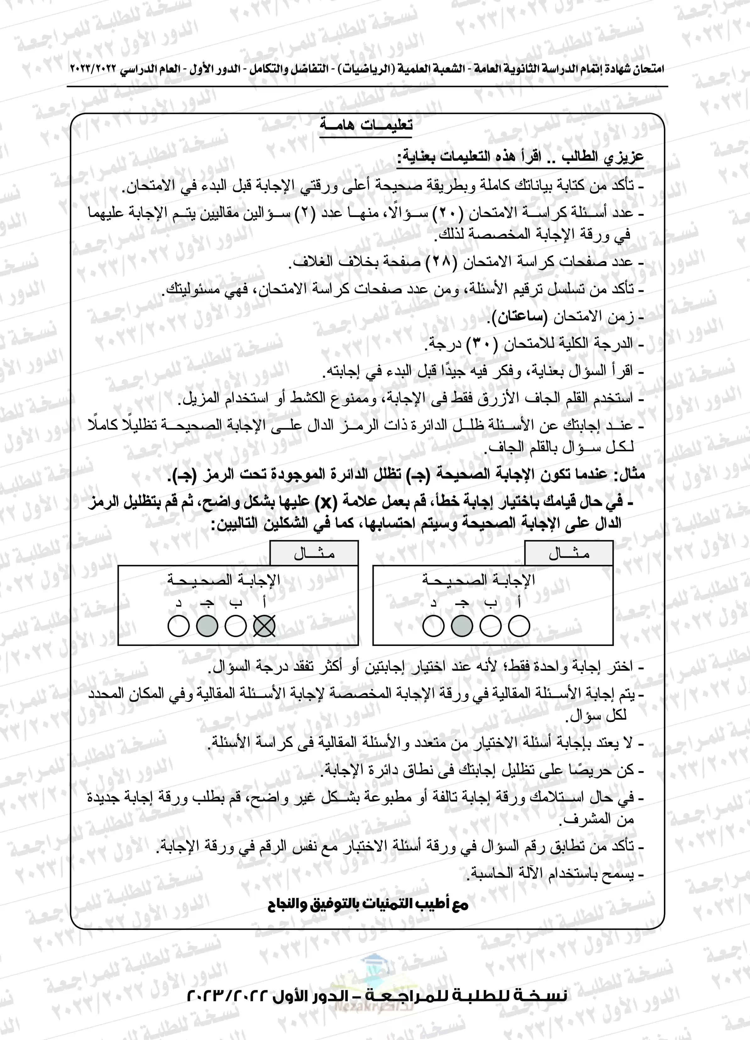 امتحان التفاضل والتكامل للثانوية العامة 2023 بصيغة PDF مع نموذج الإجابة الرسمي