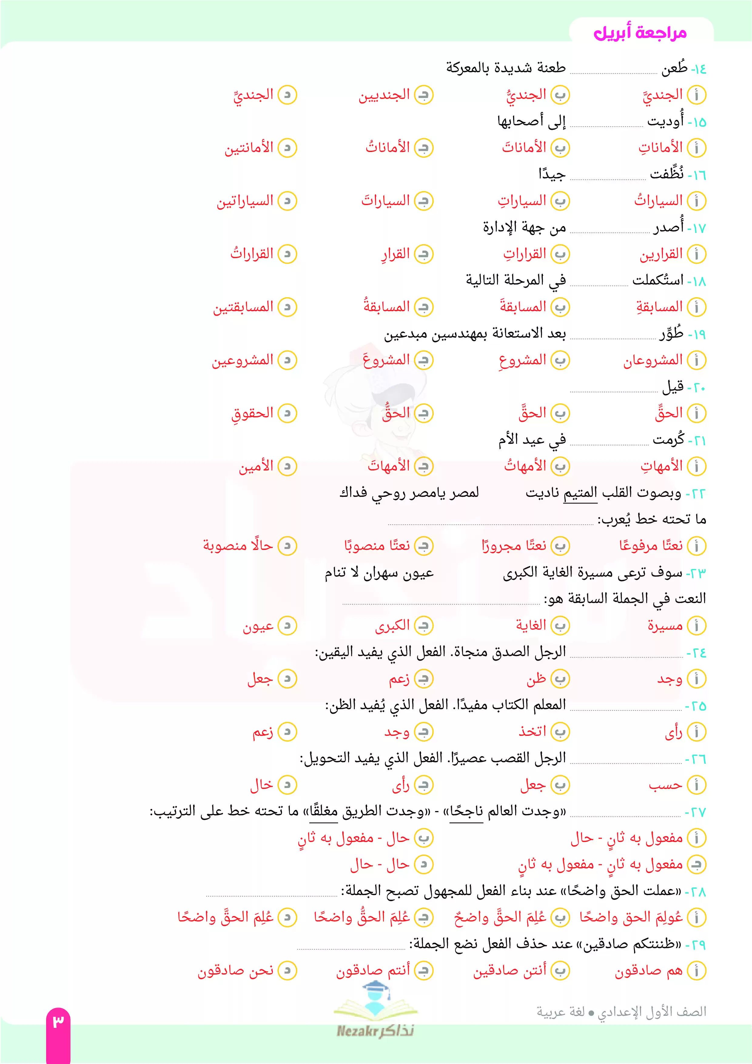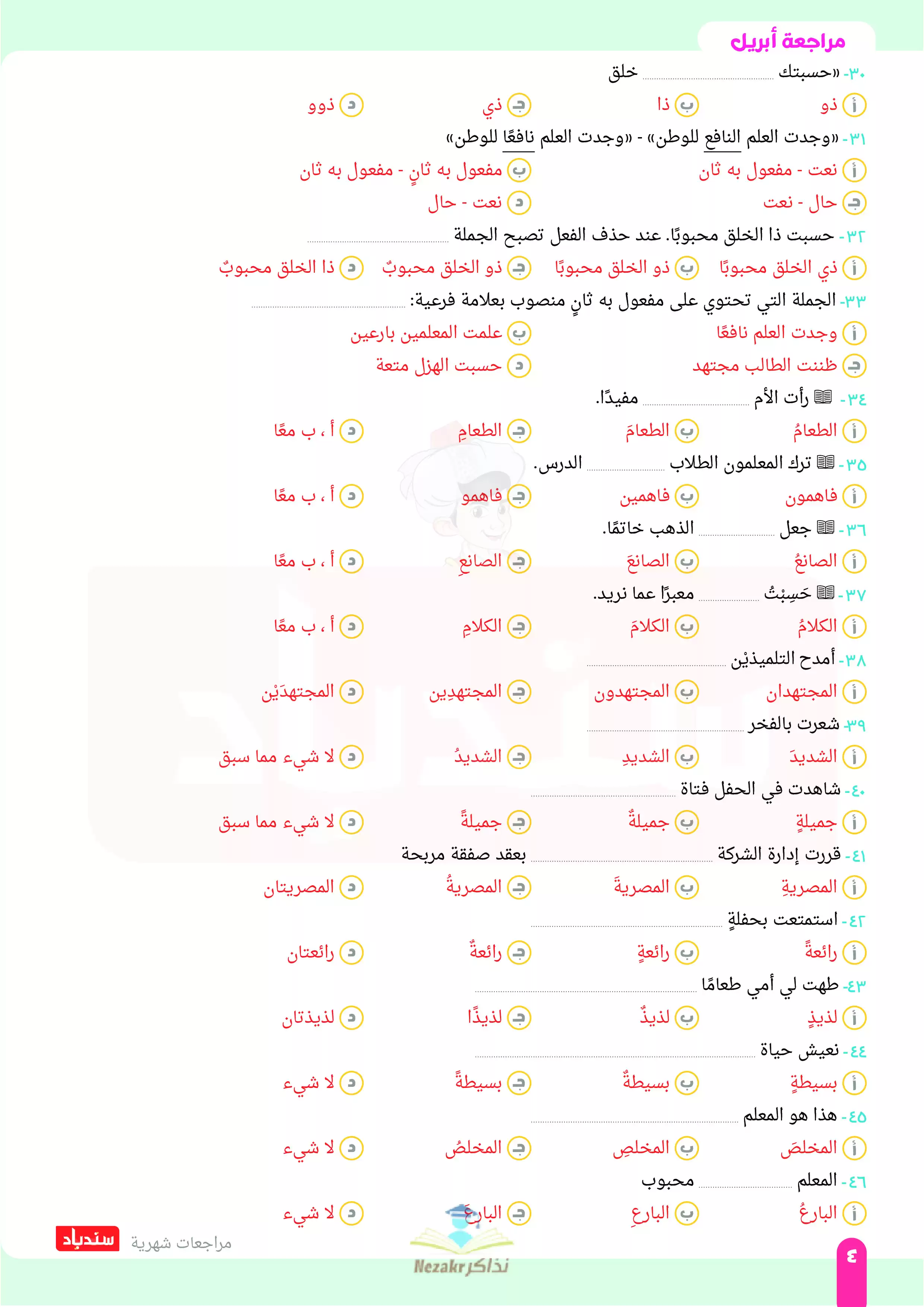 مرحباً بكم أولياء أمور وطلاب الصف الأول الإعدادي، ننشر لكم مراجعة شهر أبريل في اللغة العربية للصف الأول الإعدادية من كتاب السندباد، وهي تتميز بأنها مراجعة مميزة تأتي إليكم في إطار جهود كتاب السندباد للتيسير على الطلاب وأولياء الأمور حيث ينشر مراجعات الشهور للطلاب بشكل مجاني في صورة ملفات يمكن طباعتها والمذاكره منها بكل سهولة، وهي مراجعة معدة بدقة وبجودة عالية وتتضمن: