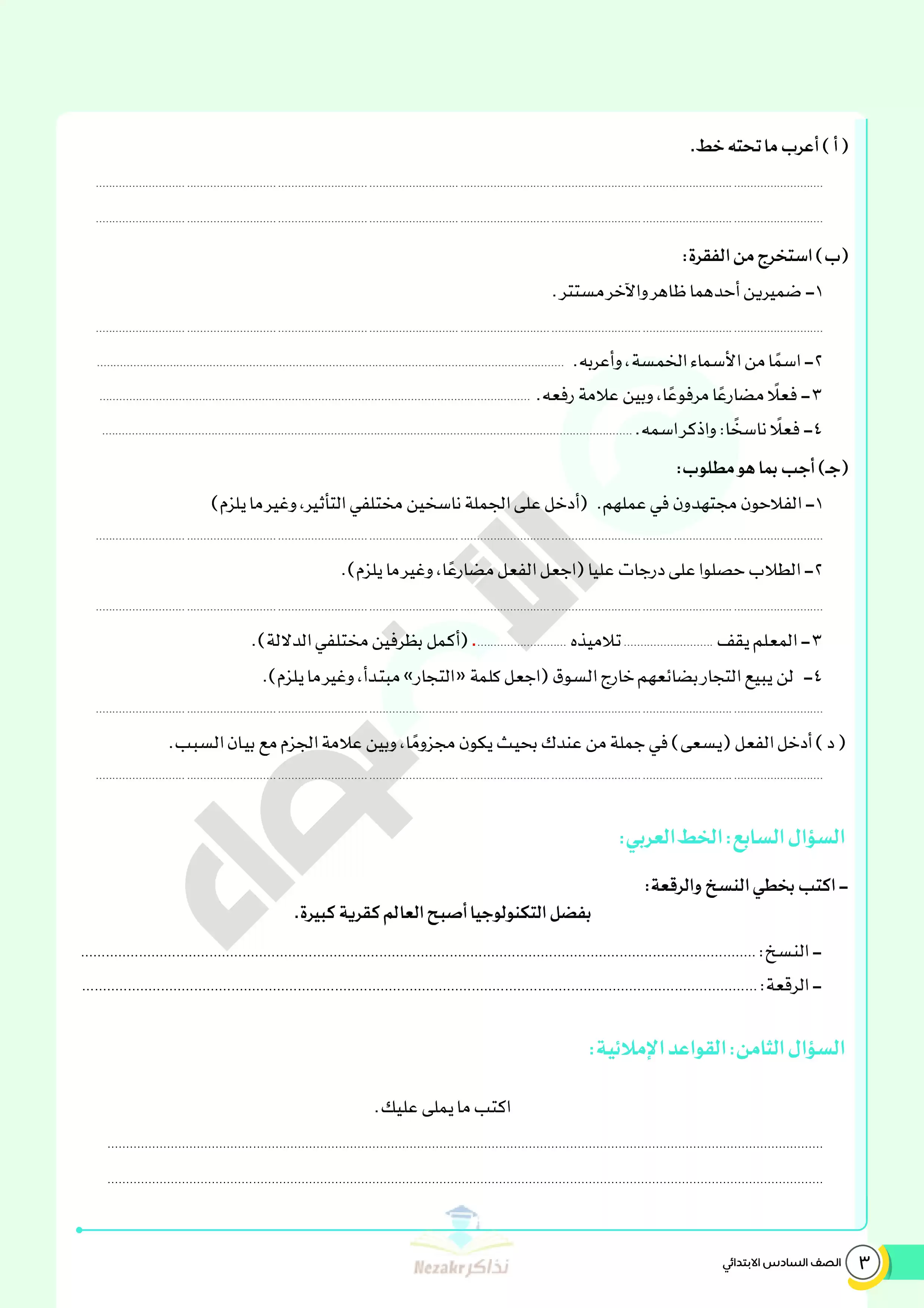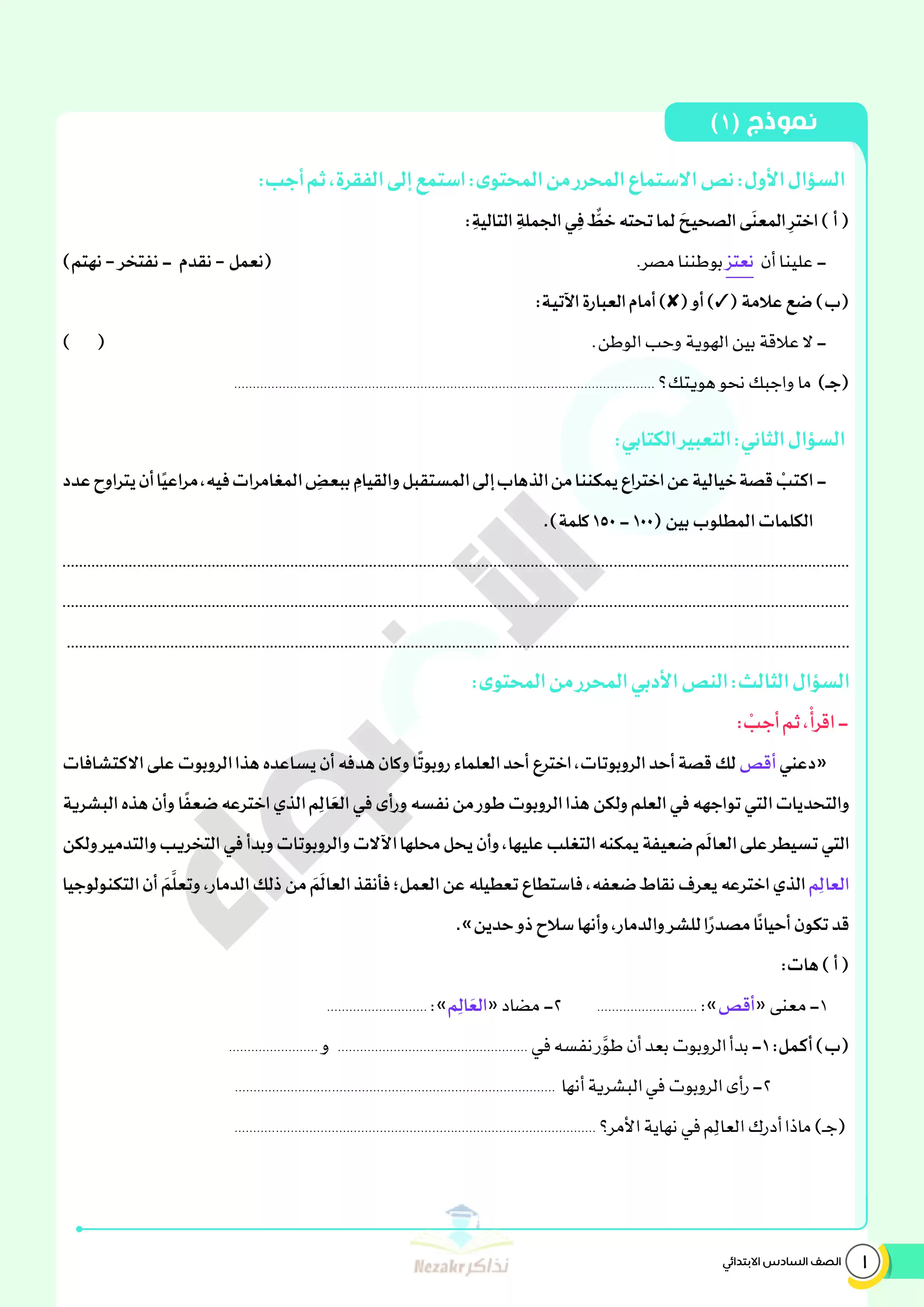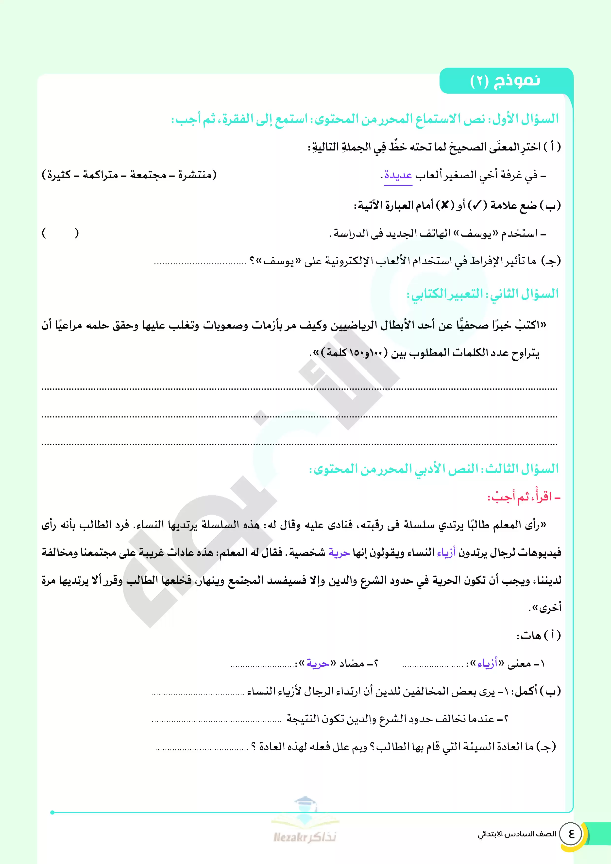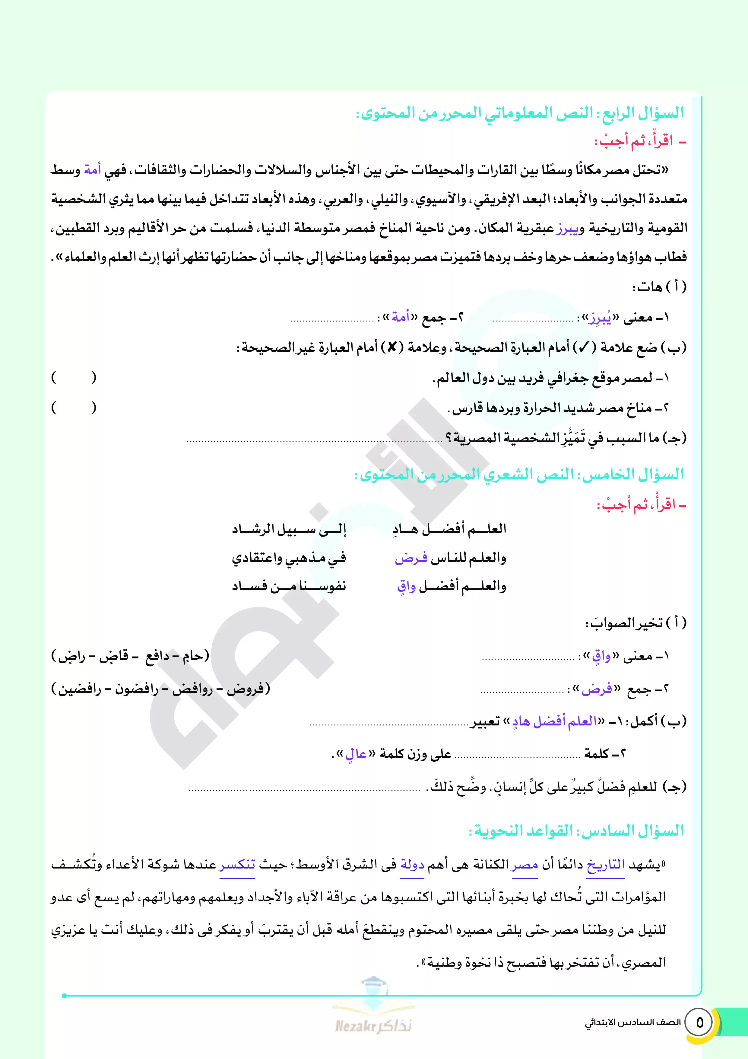 | بيانات الملف: (نماذج اختبارات ومراجعة الأضواء النهائية في مادة العربي للصف السادس الابتدائي الترم الثاني 2025 - Nezakr) | |