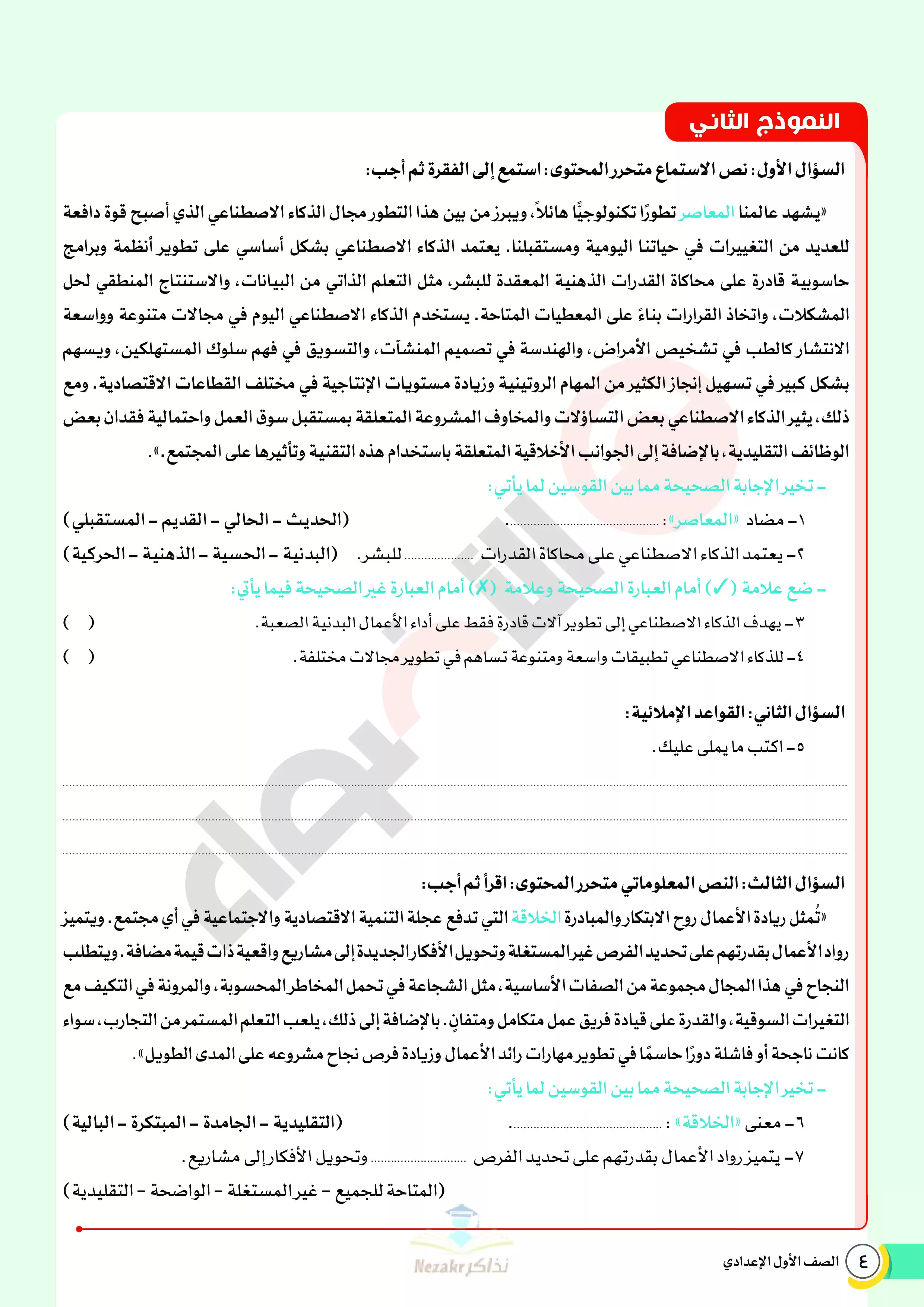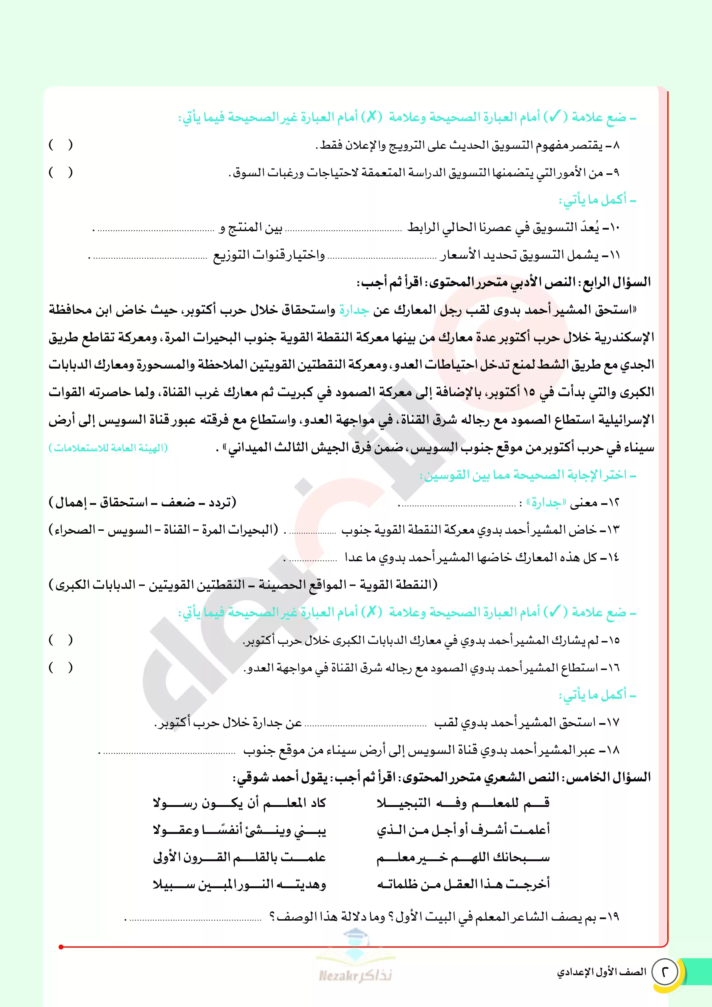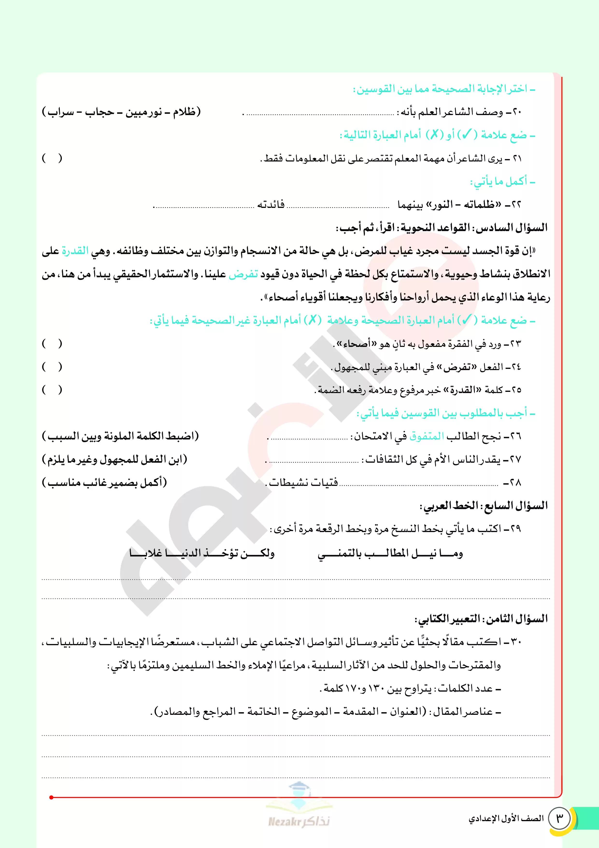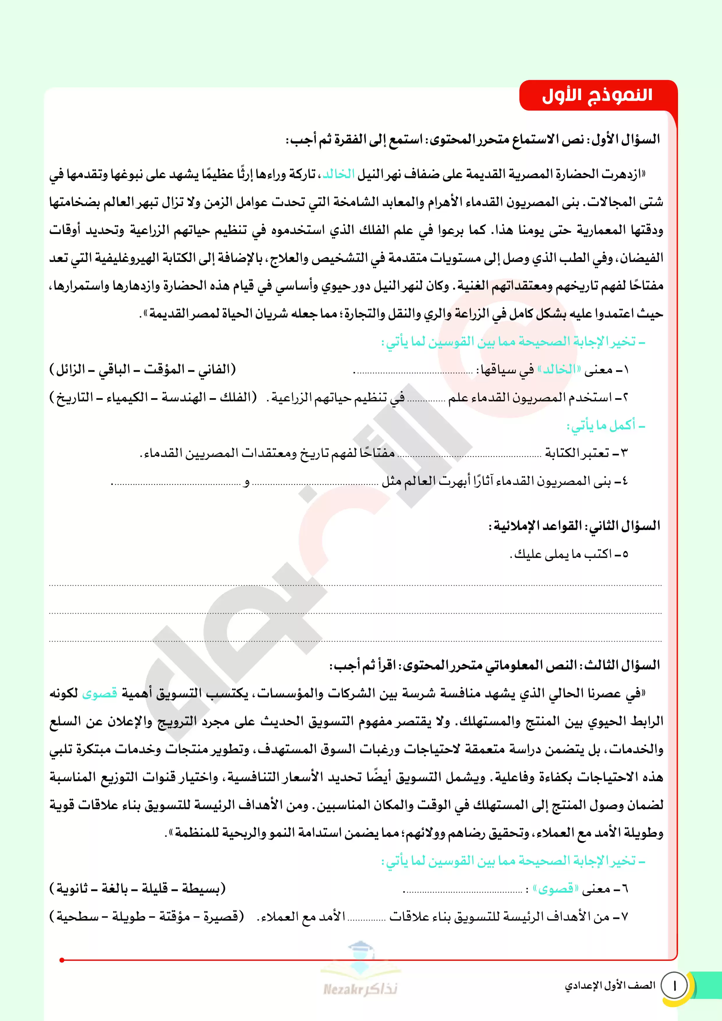 | بيانات الملف: (نماذج اختبارات ومراجعة الأضواء النهائية في مادة العربي للصف الأول الإعدادي الترم الثاني 2025 - Nezakr) | |