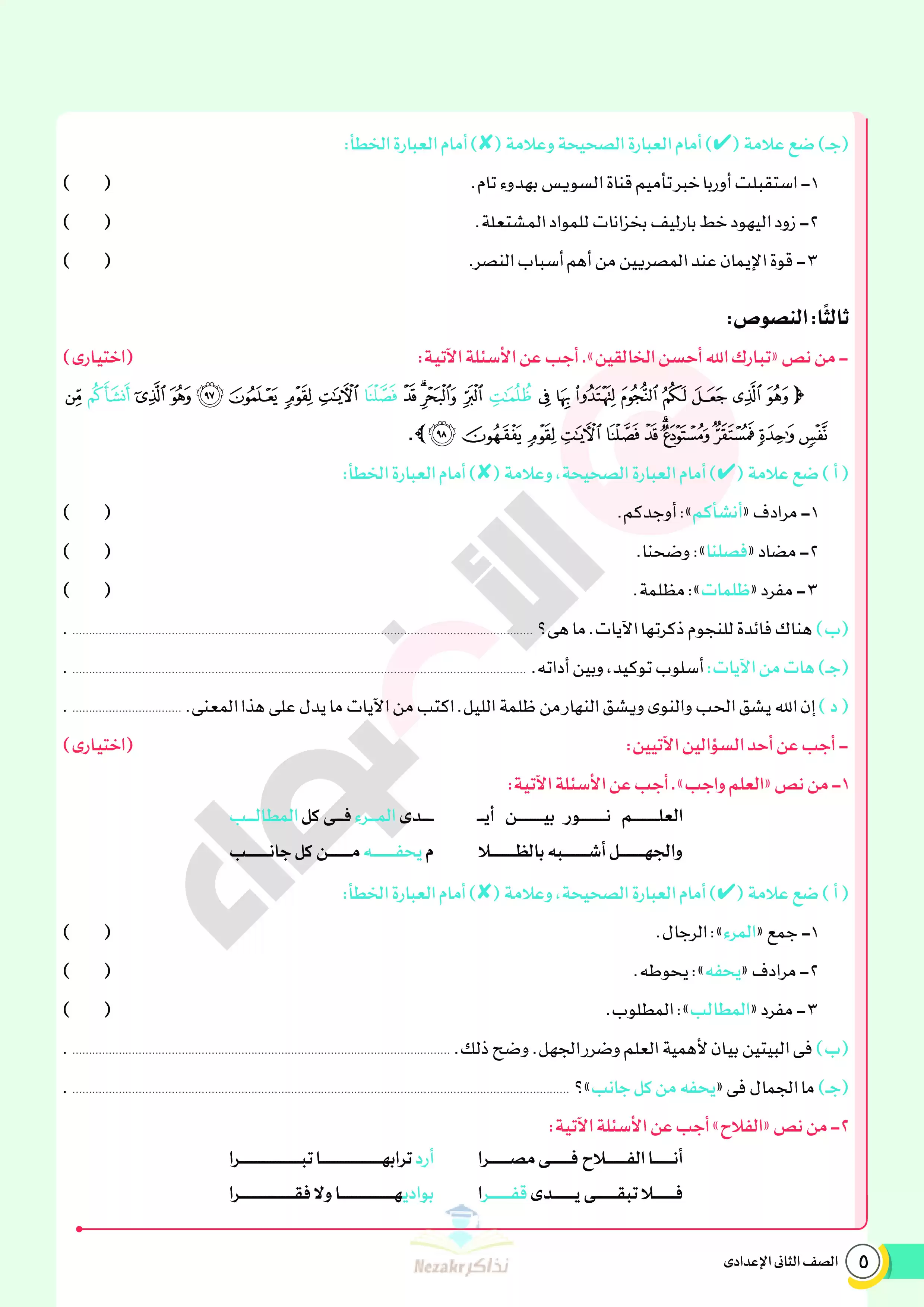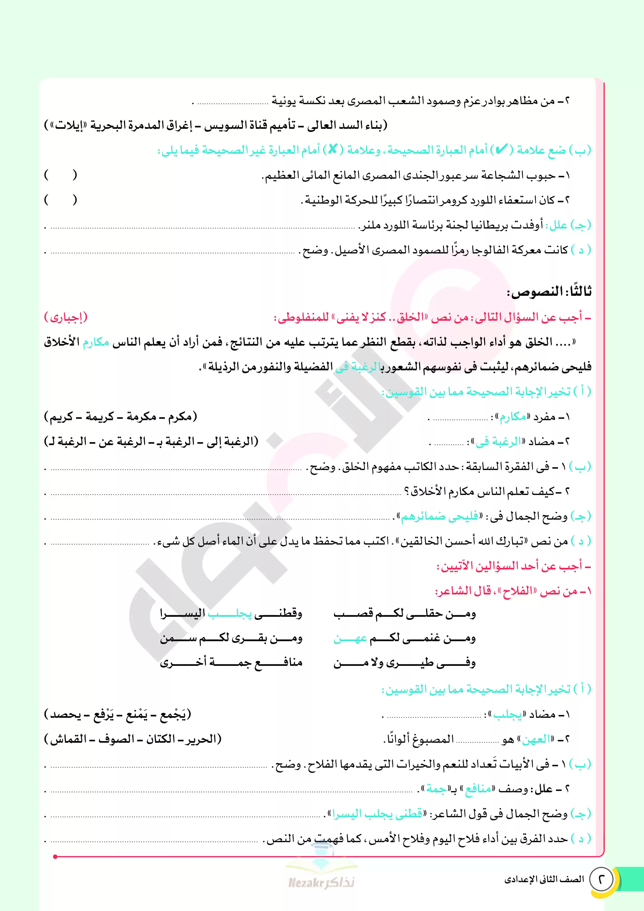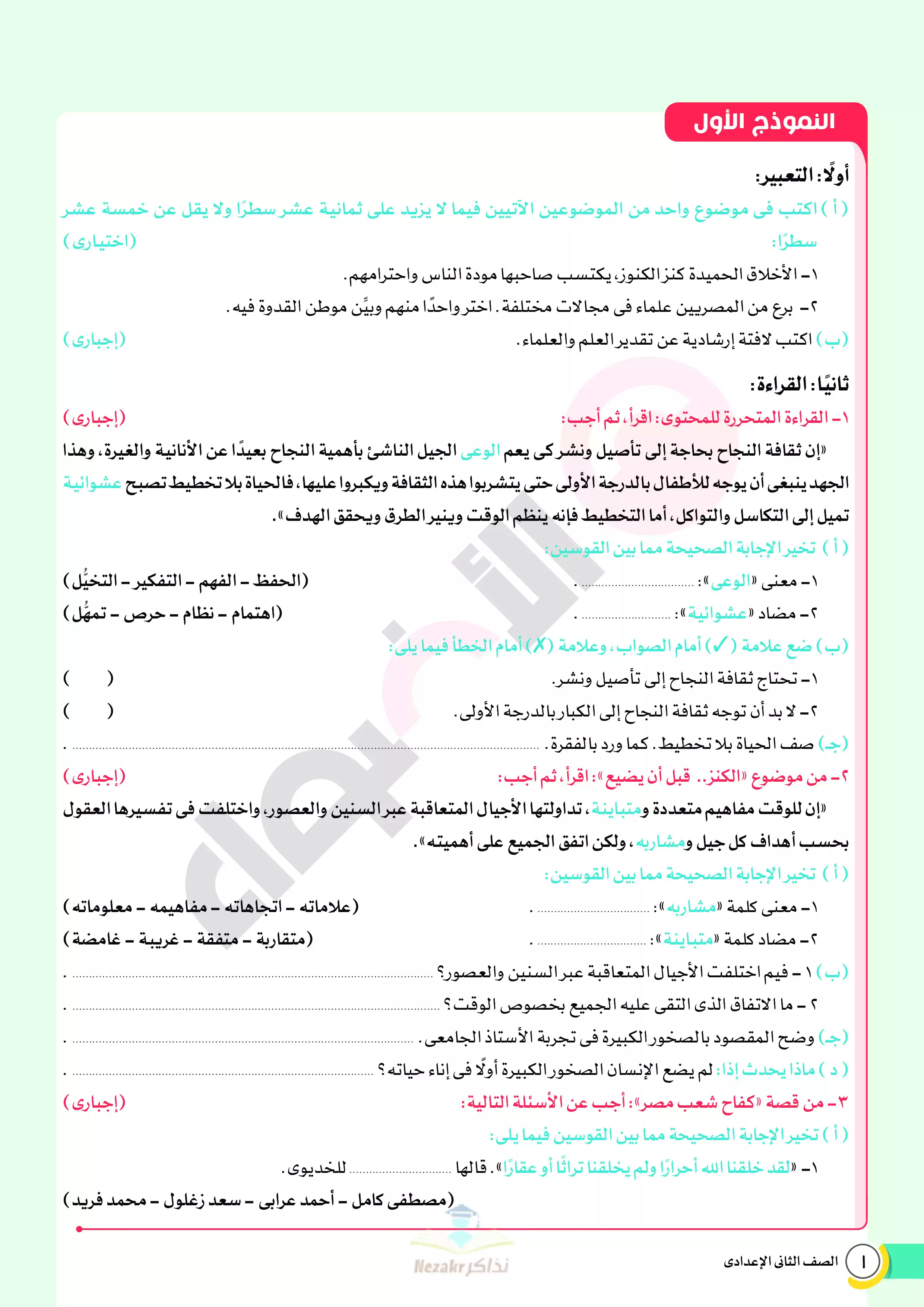 | بيانات الملف: (نماذج اختبارات ومراجعة الأضواء النهائية في مادة العربي للصف الثاني الإعدادي الترم الثاني 2025 - Nezakr) | |