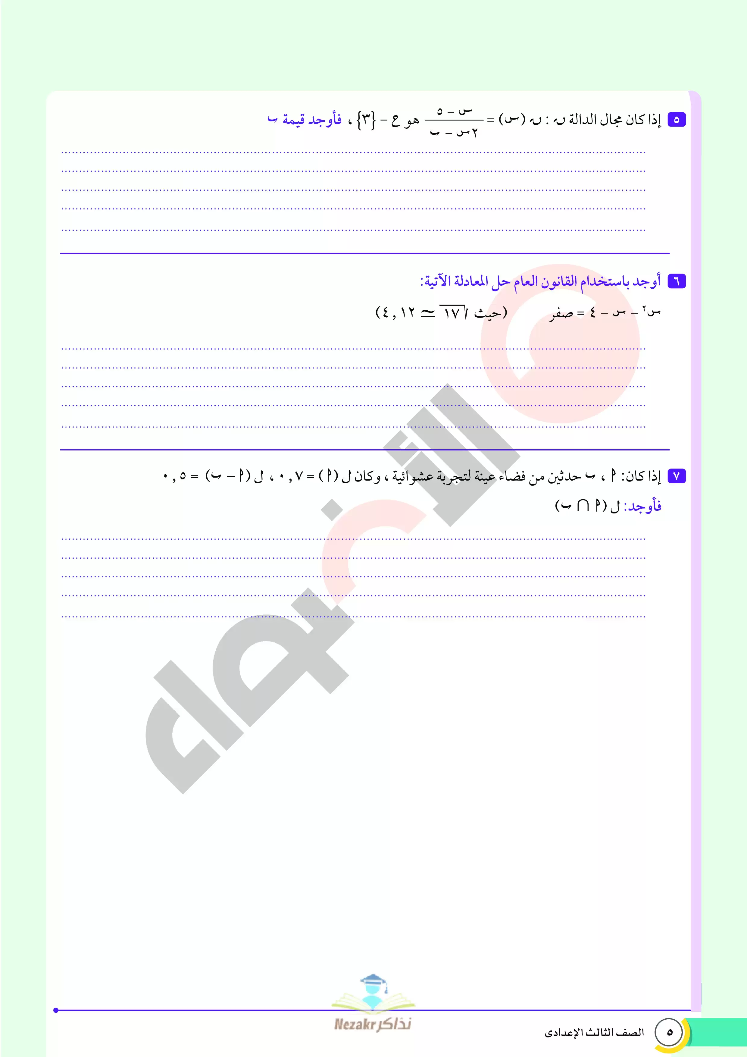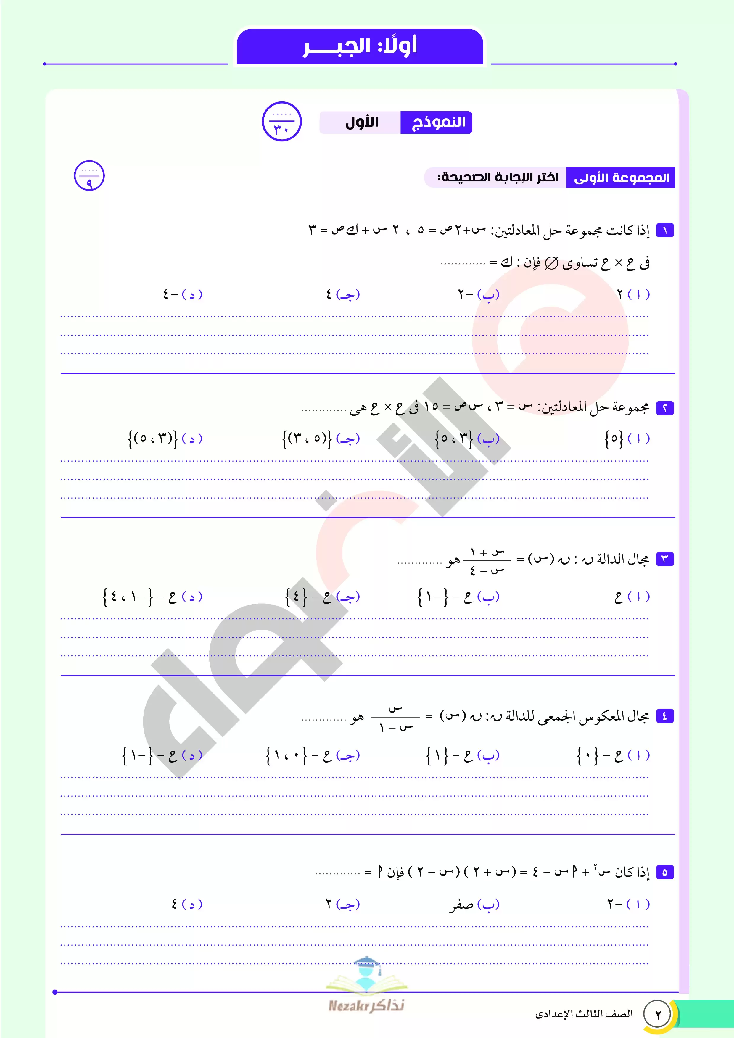 صفحة 5 من 68 صفحة من ملف: نماذج اختبارات ومراجعة الأضواء النهائية في مادة الرياضيات للصف الثالث الإعدادي الترم الثاني 2025 - Nezakr