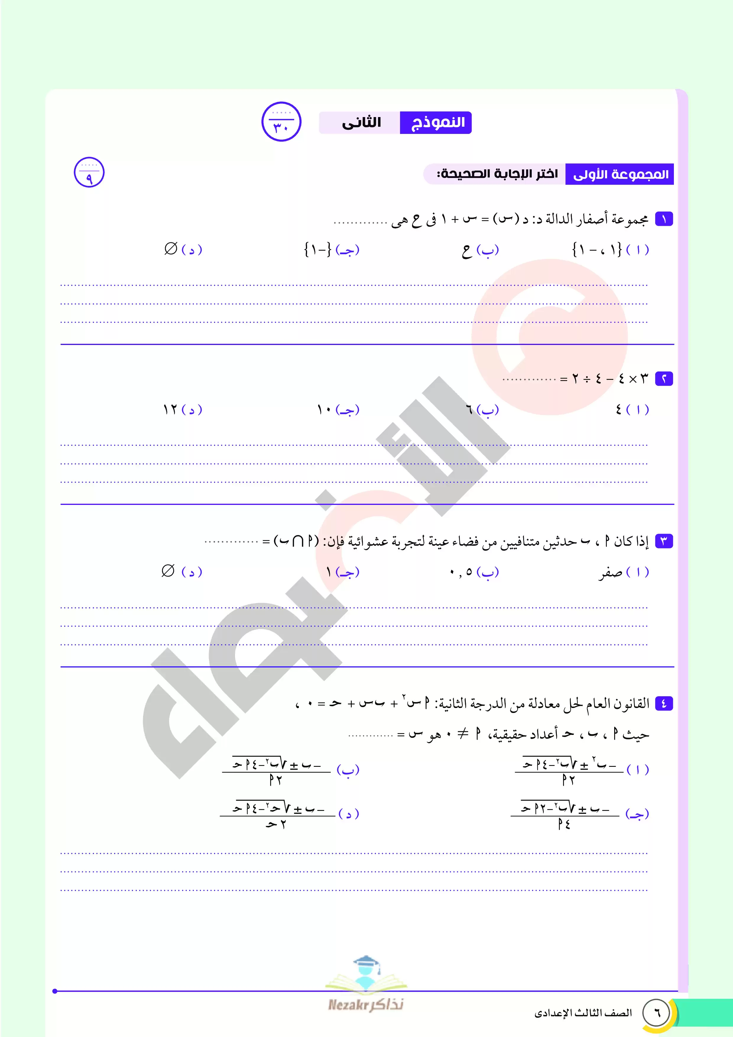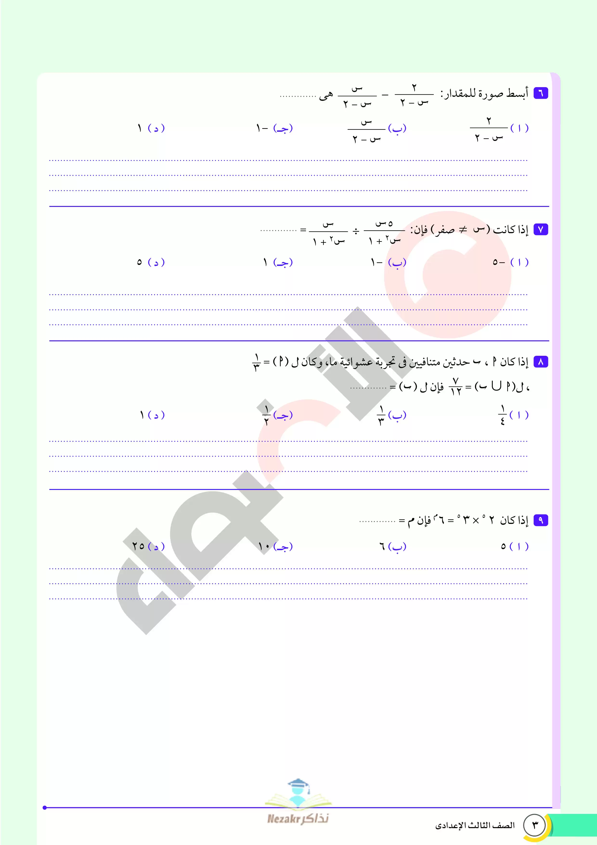 صفحة 6 من 68 صفحة من ملف: نماذج اختبارات ومراجعة الأضواء النهائية في مادة الرياضيات للصف الثالث الإعدادي الترم الثاني 2025 - Nezakr