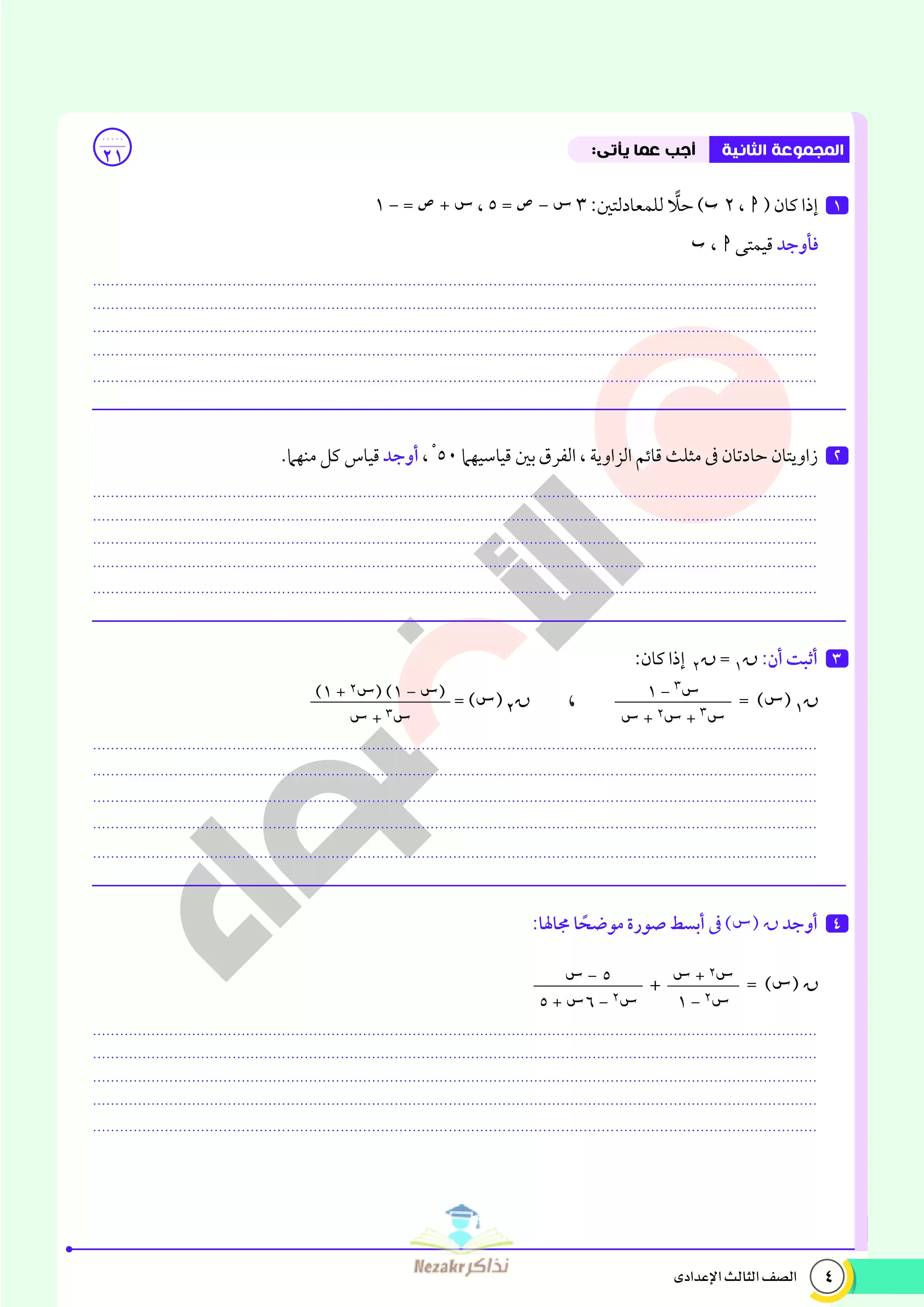 صفحة 4 من 68 صفحة من ملف: نماذج اختبارات ومراجعة الأضواء النهائية في مادة الرياضيات للصف الثالث الإعدادي الترم الثاني 2025 - Nezakr