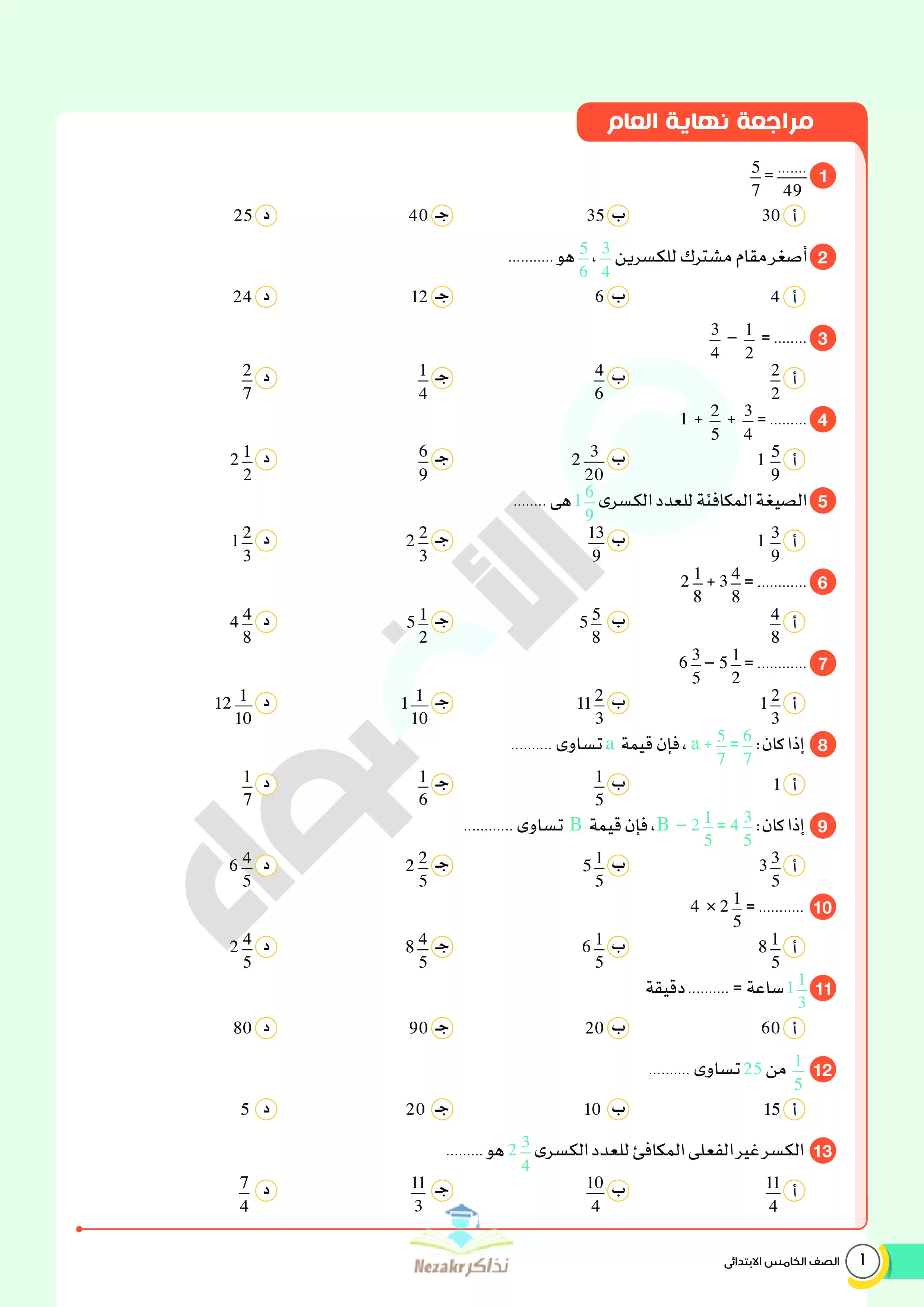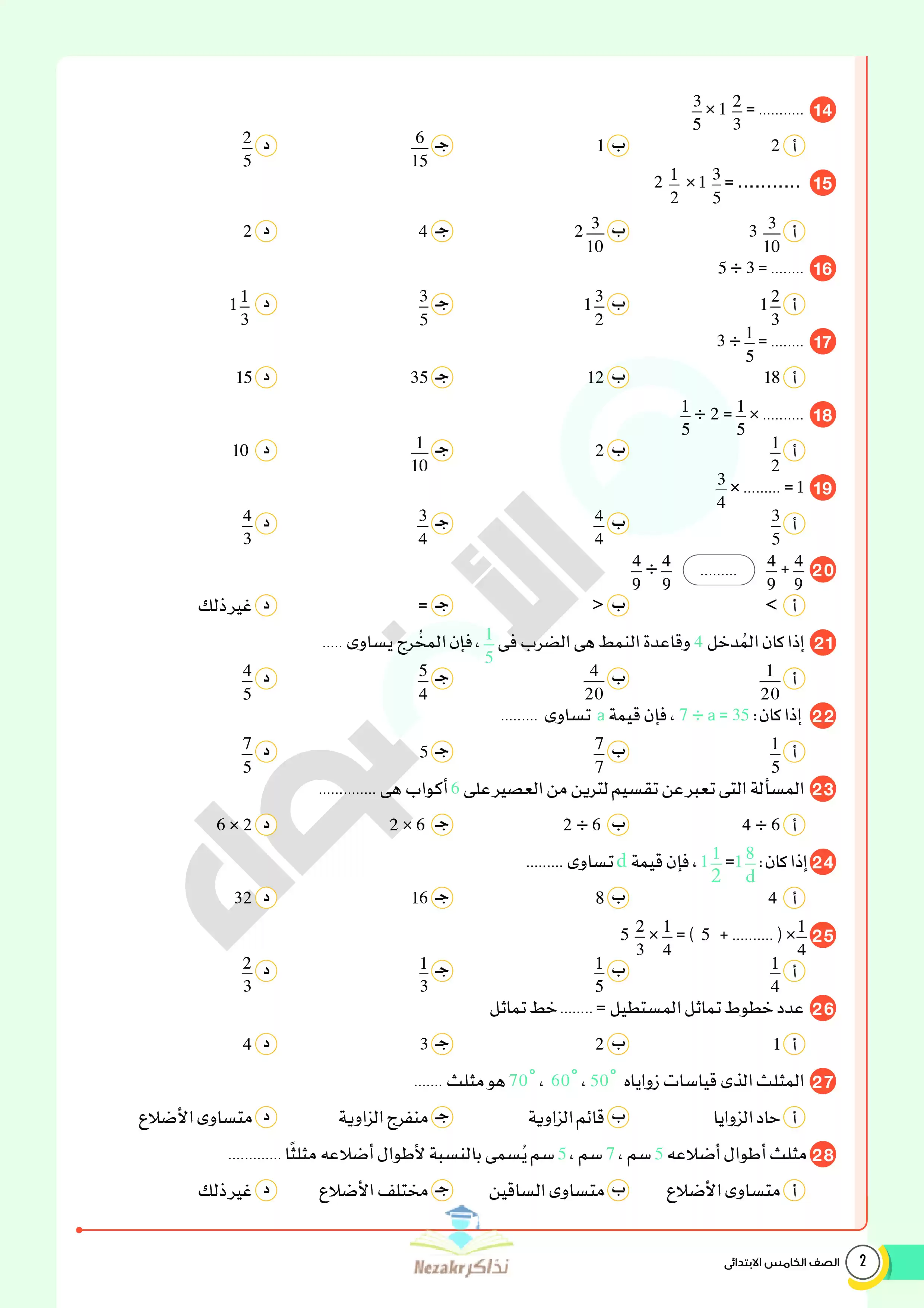 صفحة 2 من 26 صفحة من ملف: نماذج اختبارات ومراجعة الأضواء النهائية في الرياضيات للصف الخامس الابتدائي الترم الثاني 2025 - Nezakr