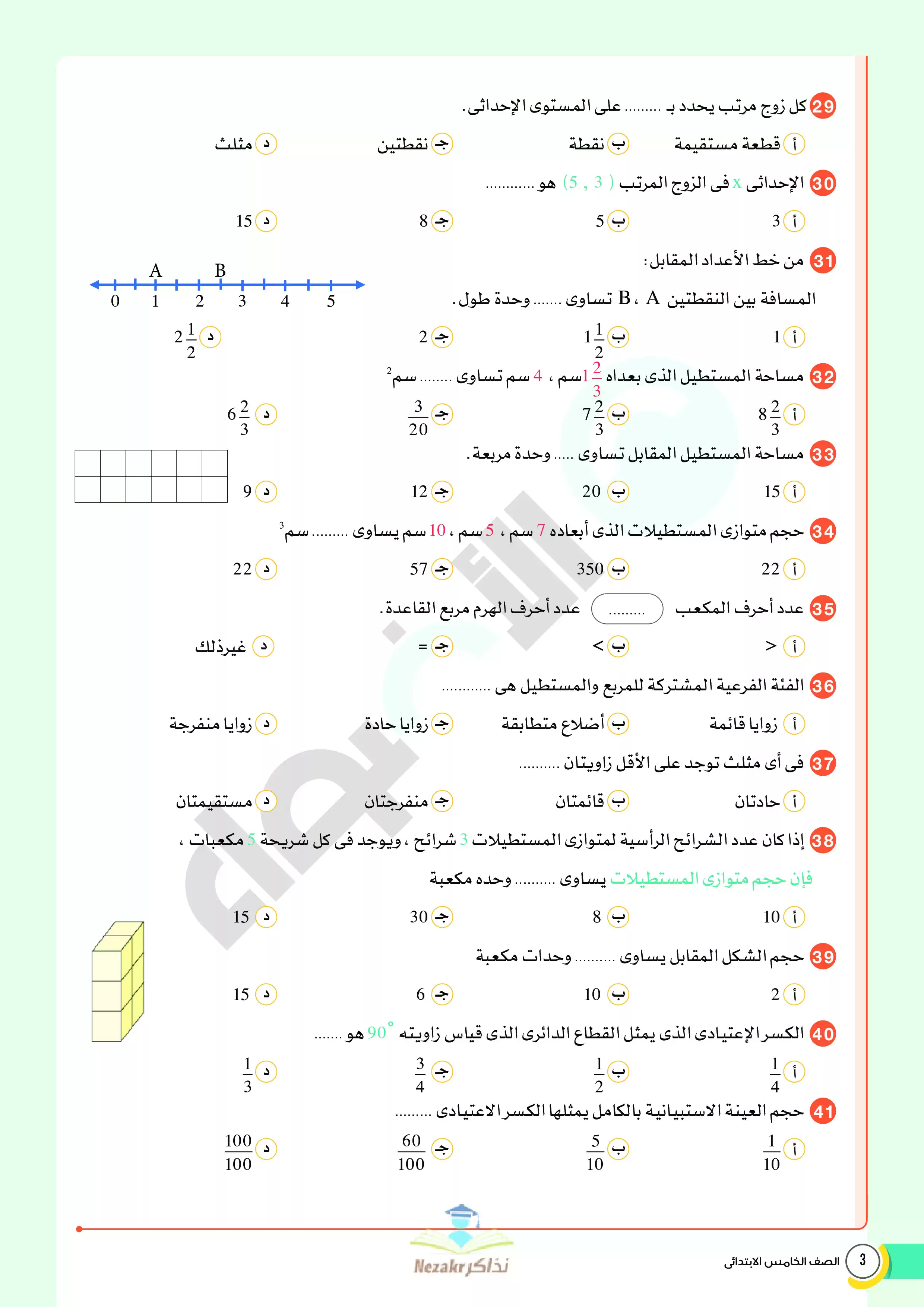 صفحة 3 من 26 صفحة من ملف: نماذج اختبارات ومراجعة الأضواء النهائية في الرياضيات للصف الخامس الابتدائي الترم الثاني 2025 - Nezakr