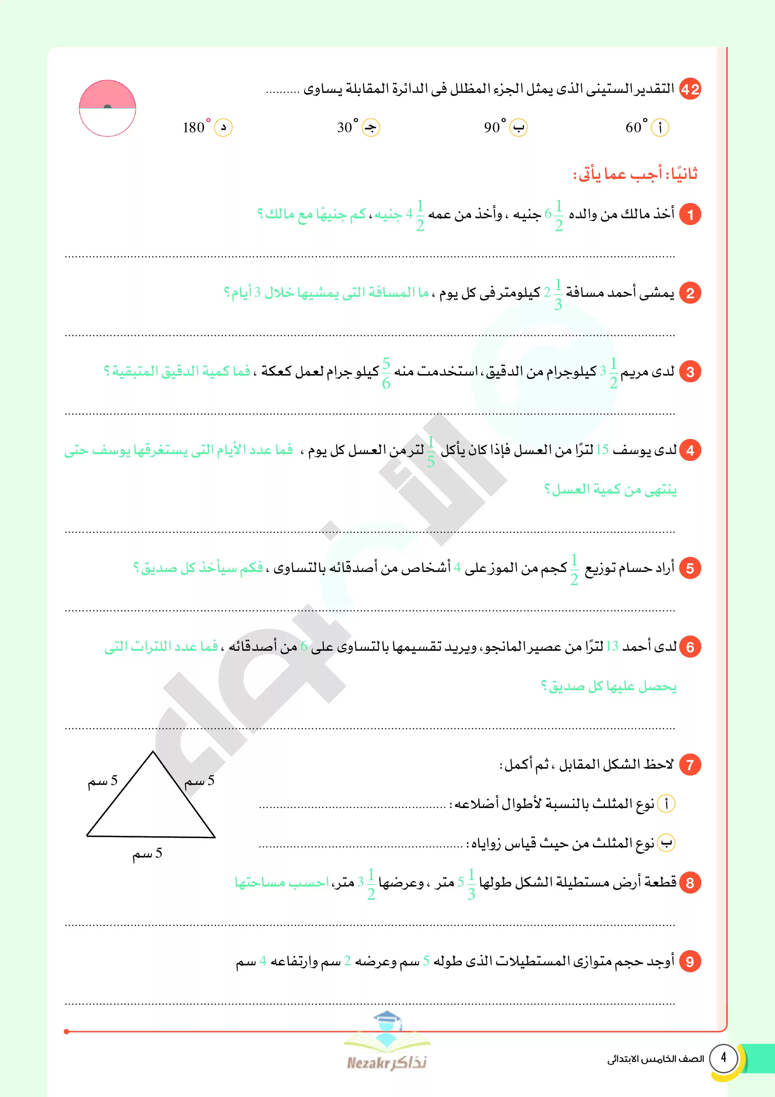 صفحة 4 من 26 صفحة من ملف: نماذج اختبارات ومراجعة الأضواء النهائية في الرياضيات للصف الخامس الابتدائي الترم الثاني 2025 - Nezakr