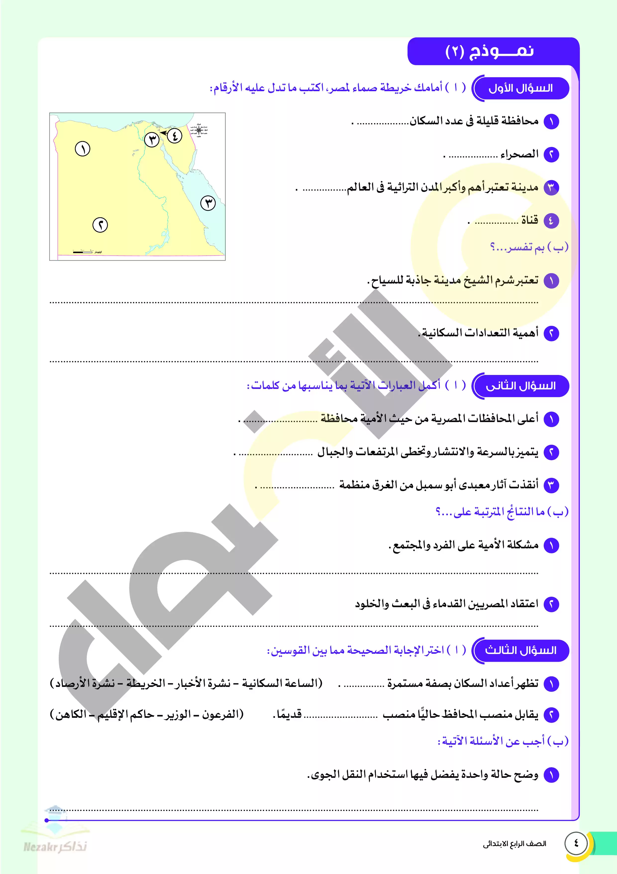 صفحة 4 من 22 صفحة من ملف: نماذج اختبارات ومراجعة الأضواء النهائية في الدراسات للصف الرابع الإبتدائي الترم الثاني 2025 - Nezakr