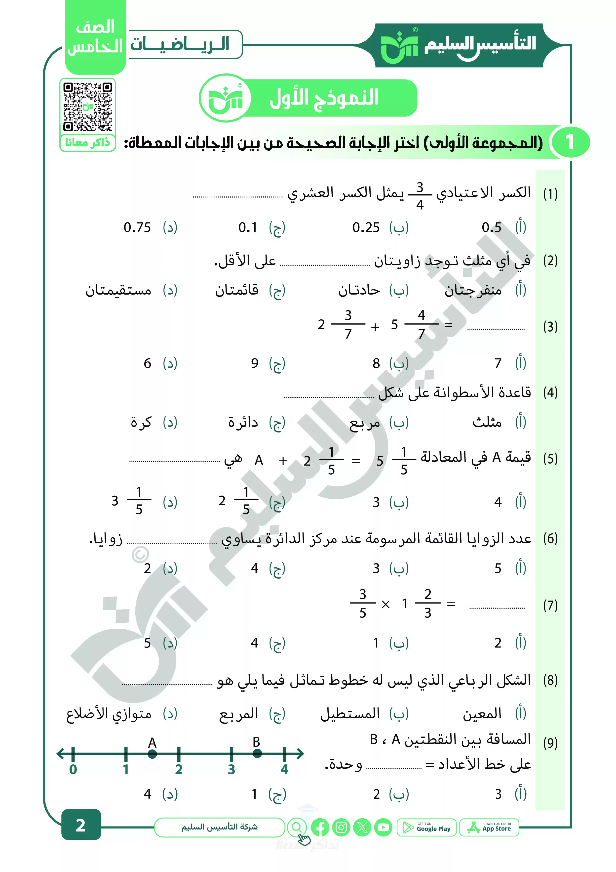 صفحة 2 من 22 صفحة من ملف: نماذج اختبارات ومراجعة الرياضيات النهائية من التأسيس السليم للصف الخامس الابتدائي الترم الثاني 2025 - Nezakr