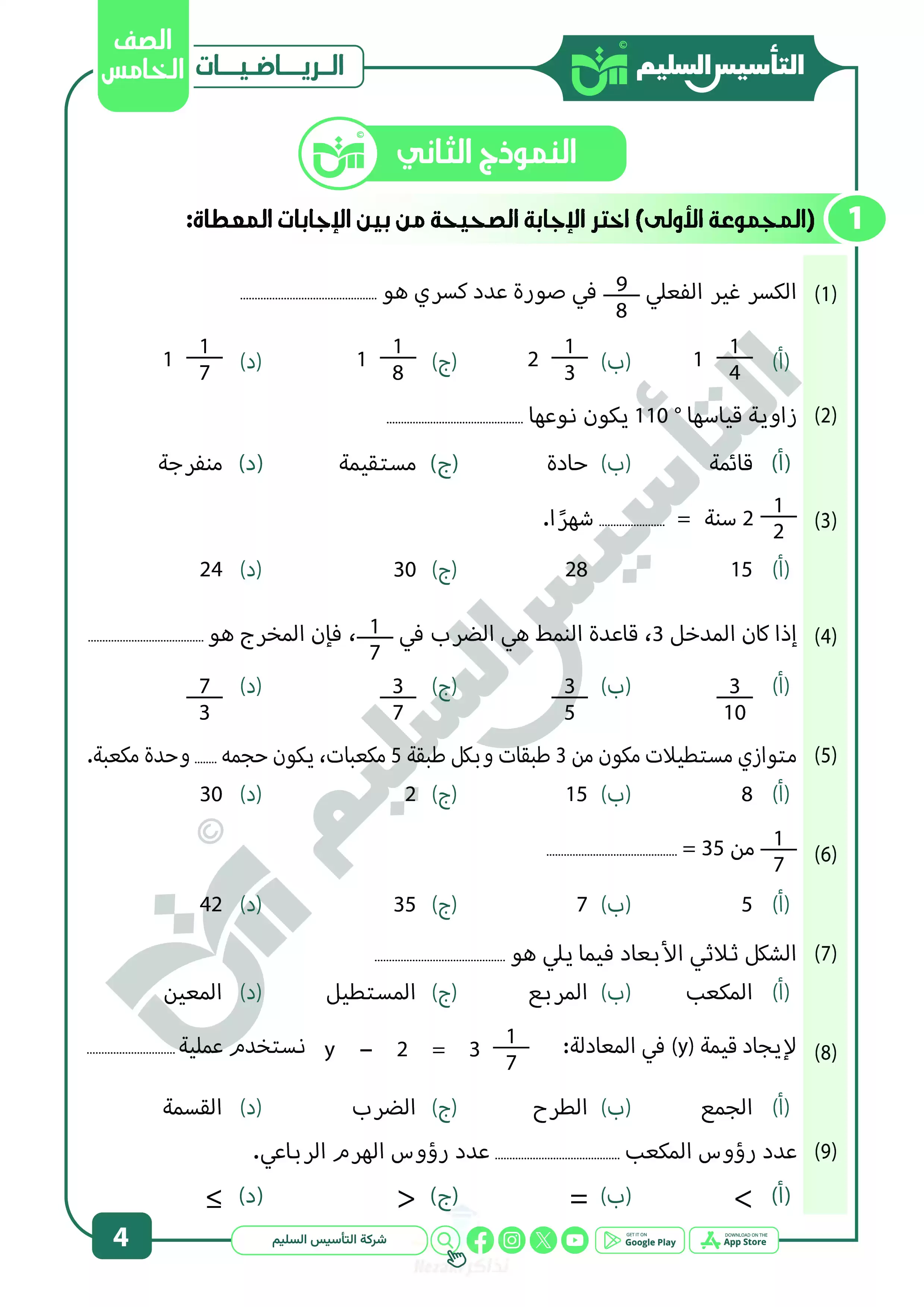 صفحة 4 من 22 صفحة من ملف: نماذج اختبارات ومراجعة الرياضيات النهائية من التأسيس السليم للصف الخامس الابتدائي الترم الثاني 2025 - Nezakr
