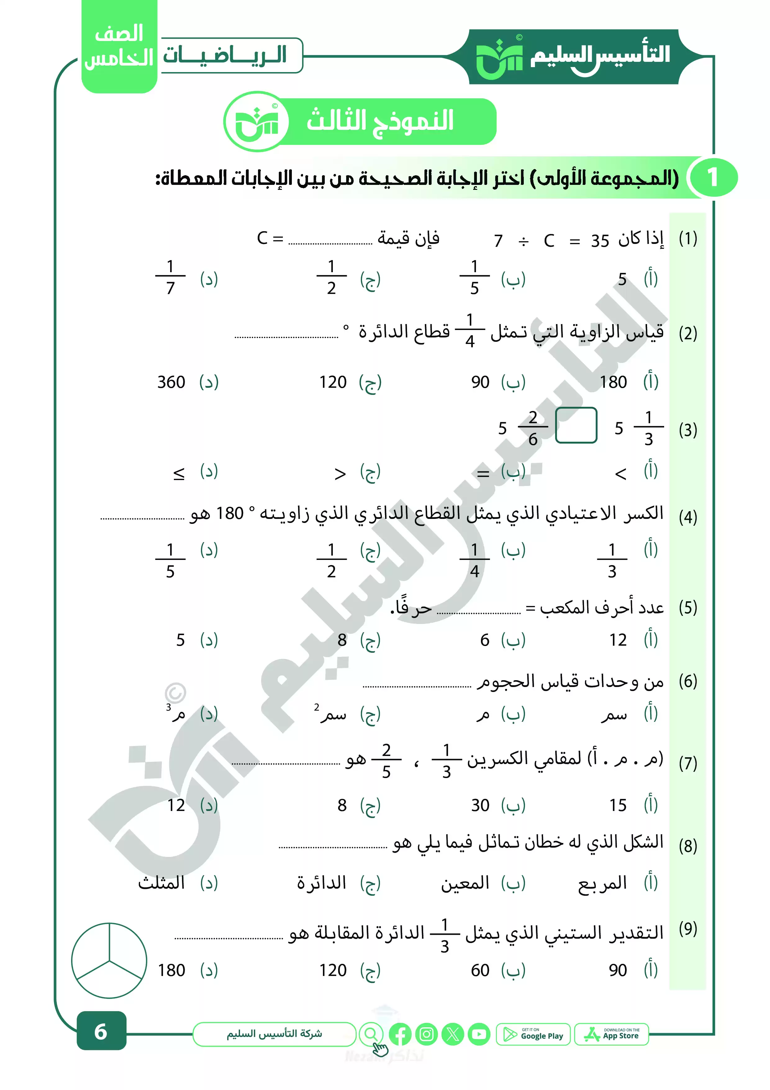 صفحة 6 من 22 صفحة من ملف: نماذج اختبارات ومراجعة الرياضيات النهائية من التأسيس السليم للصف الخامس الابتدائي الترم الثاني 2025 - Nezakr