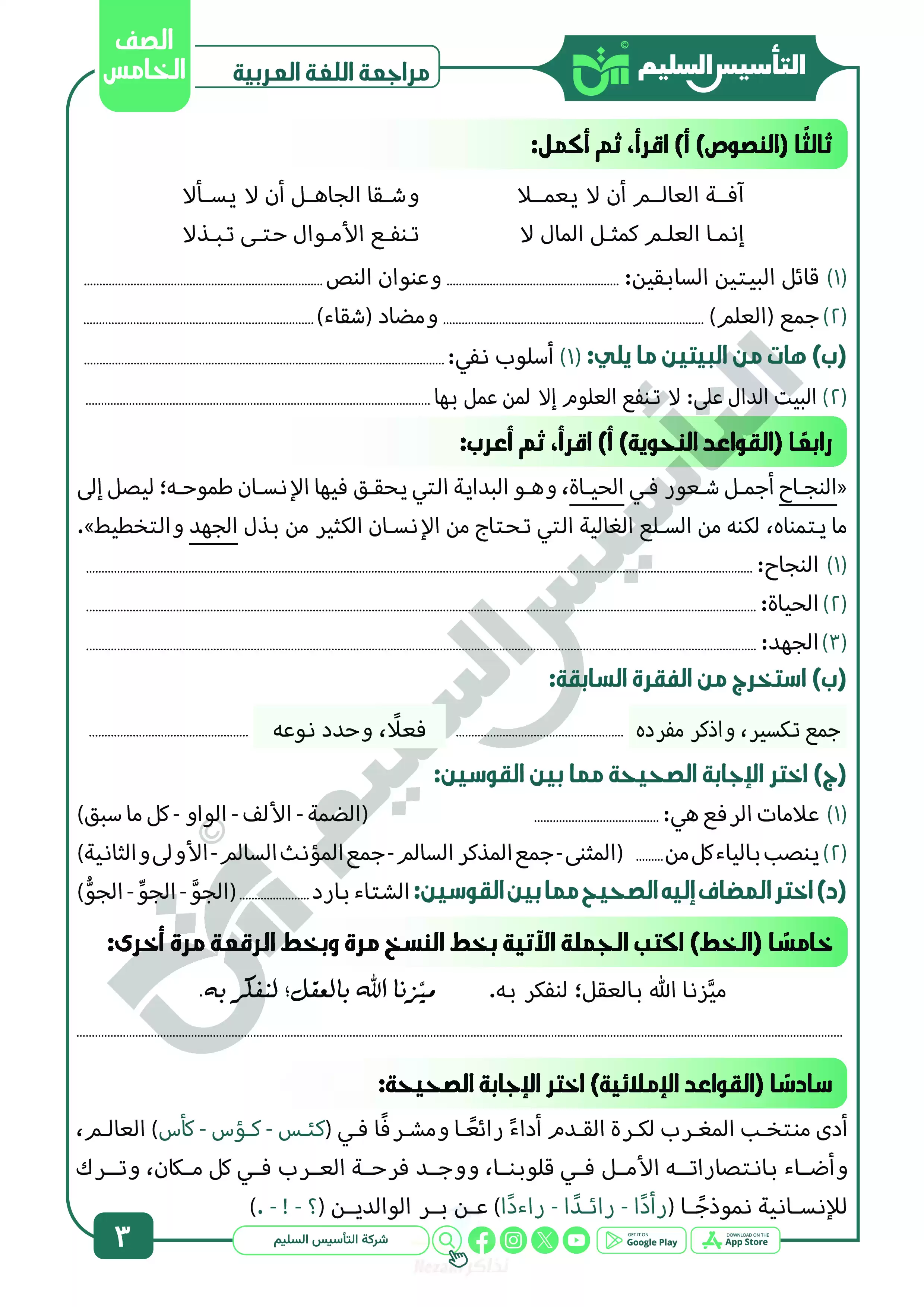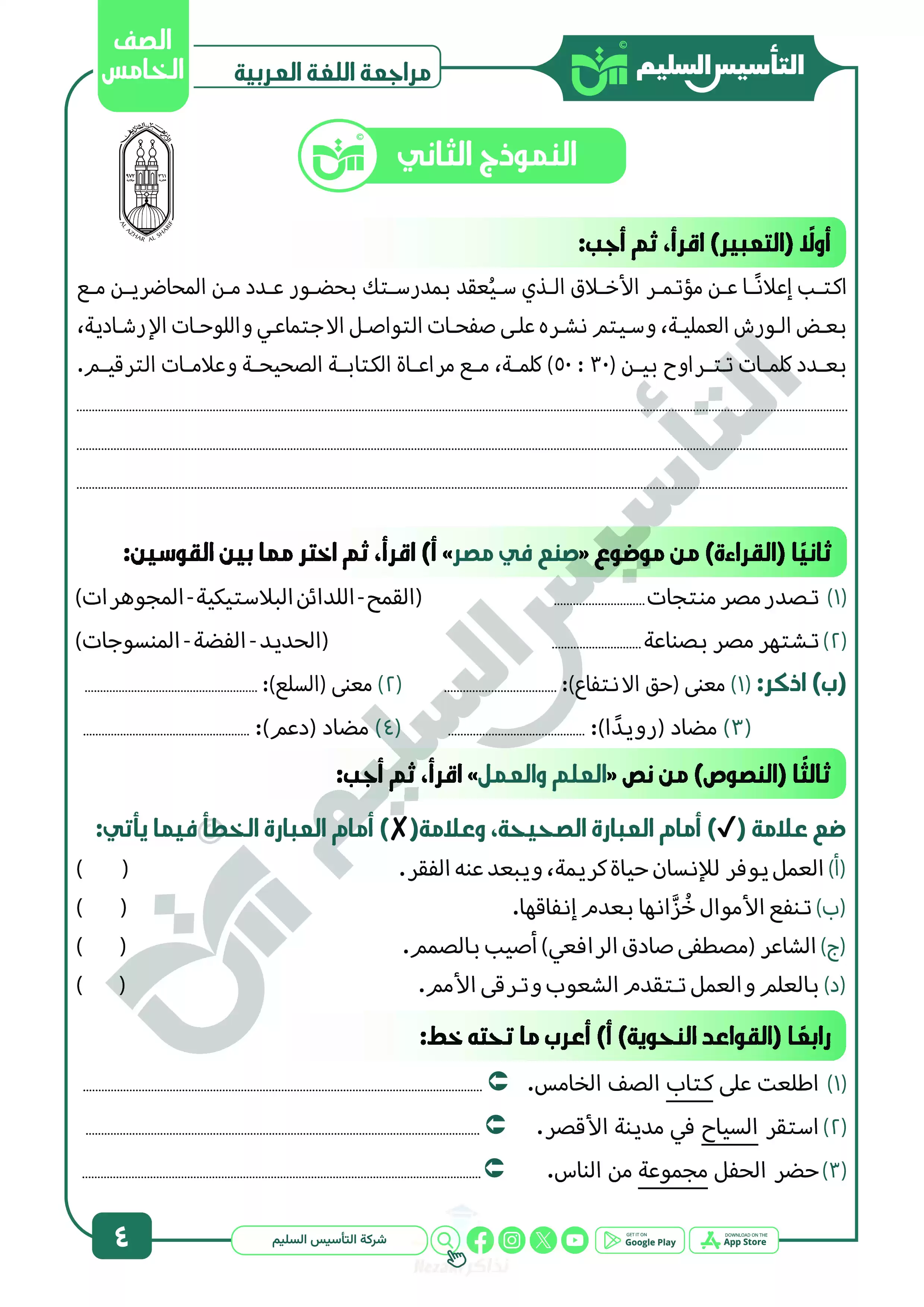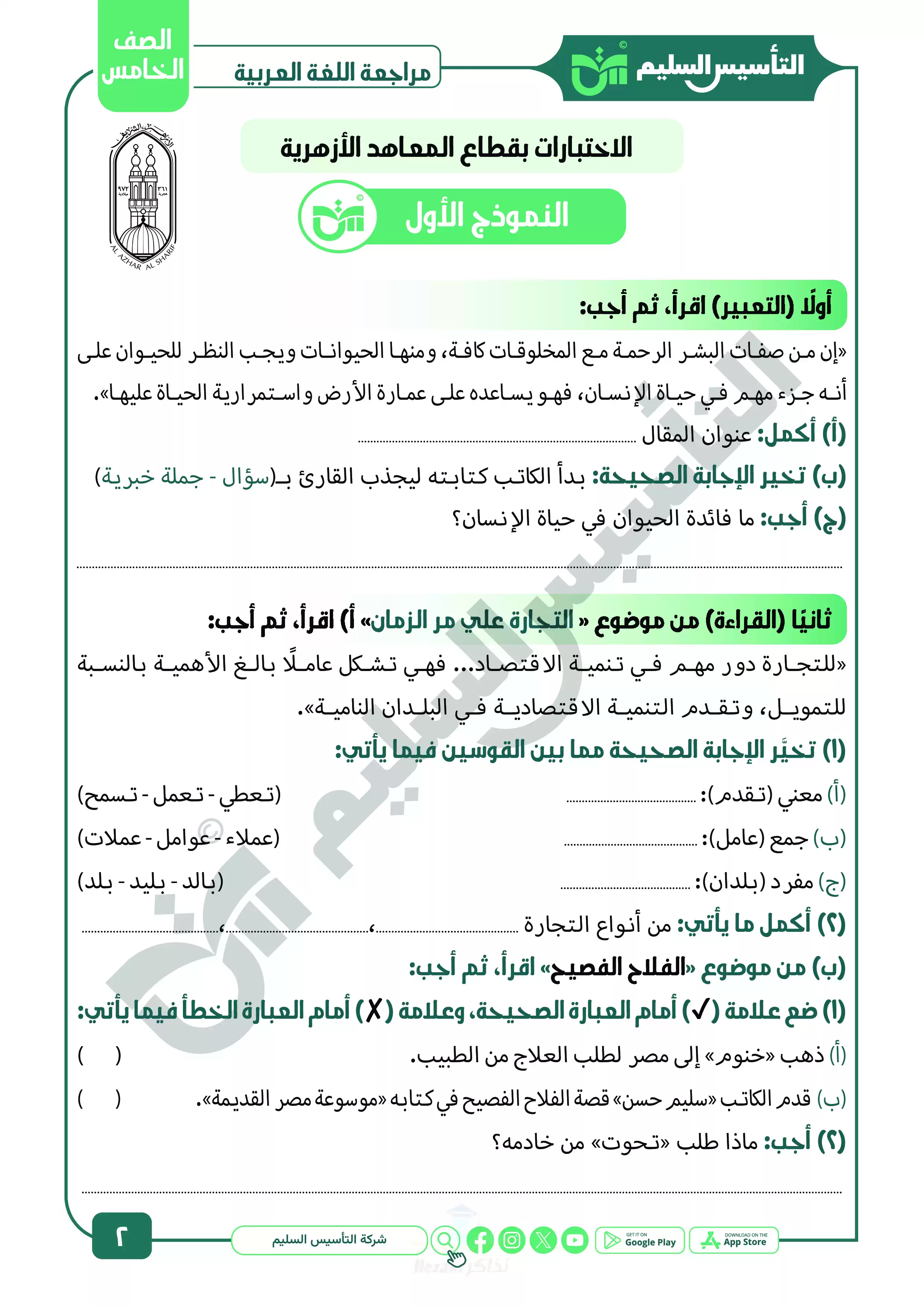 ننشر لكم ملف المراجعة النهائية ونماذج الاختبارات النهائية من كتاب التأسيس السليم في مادة اللغة العربية للصف الخامس الابتدائي الأزهري الفصل الدراسي الثاني 2025، ويحتوي الملف مراجعة وبنك أسئلة التأسيس السليم على منهج الفصل الدراسي الثاني خامسة ابتدائي أزهري كاملاً في العربي، وهو ملف مميز بجودة مرتفعة وبصيغة PDF وذلك لتتمكن من تشغيله على جهاز الموبايل أو من خلال جهاز الكمبيوتر أو عبر اللابتوب أو التابلت لضمان سهولة الوصول الى الكتاب والمذاكرة عليه.