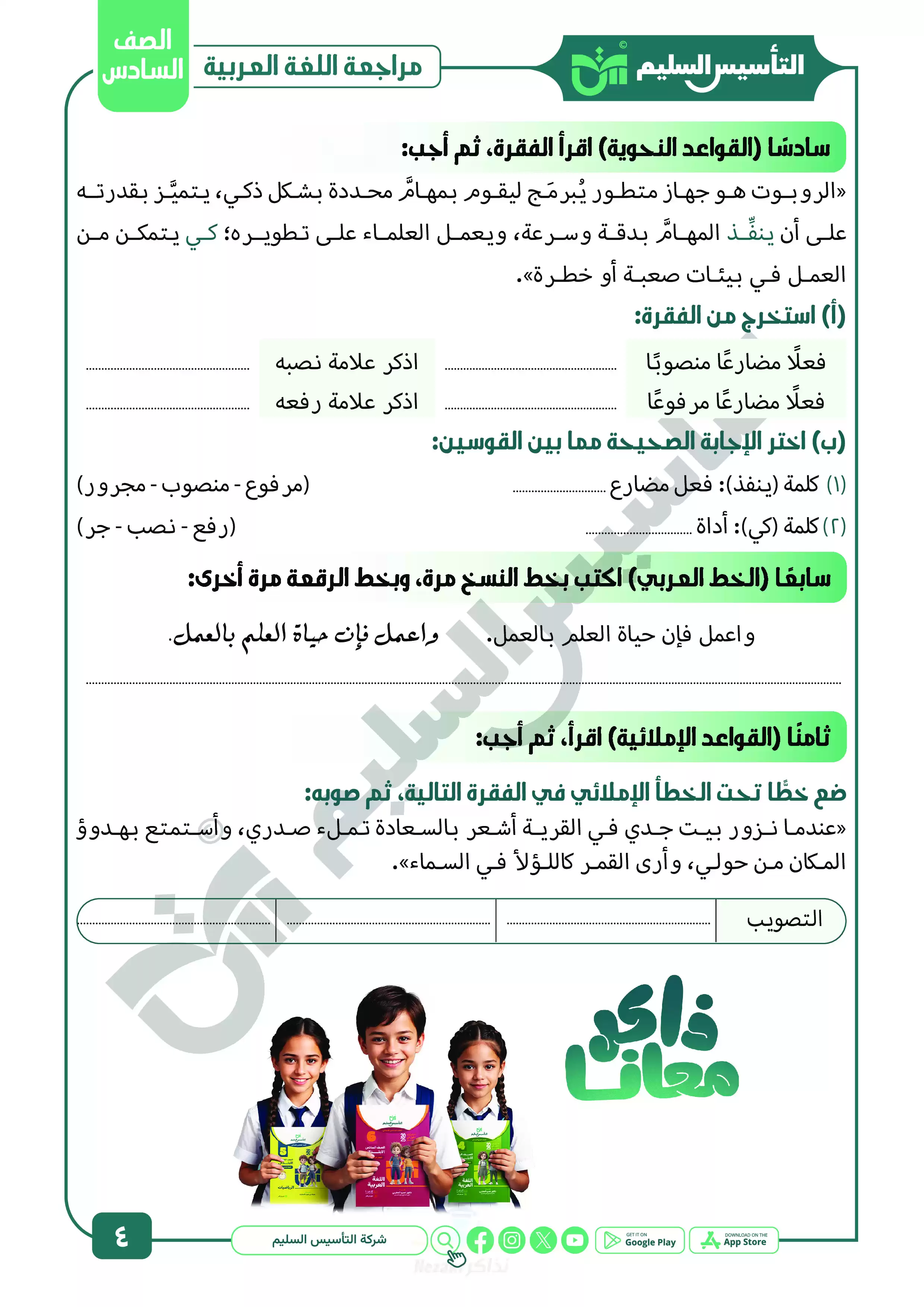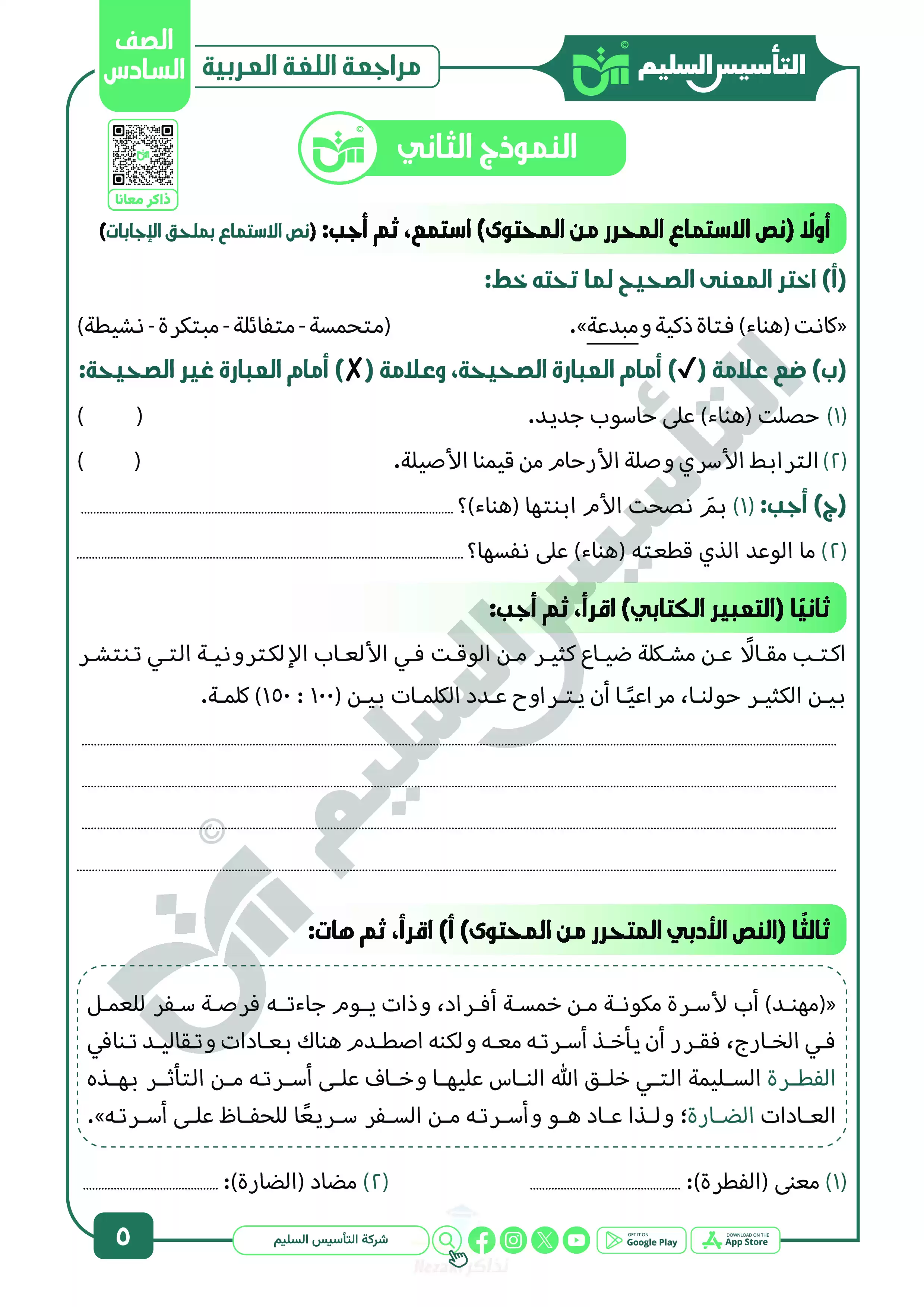 ننشر لكم ملف المراجعة النهائية ونماذج الاختبارات النهائية من كتاب التأسيس السليم في مادة اللغة العربية للصف السادس الابتدائي الفصل الدراسي الثاني 2025، ويحتوي الملف مراجعة وبنك أسئلة التأسيس السليم على منهج الفصل الدراسي الثاني سادسة ابتدائي كاملاً في العربي، وهو ملف مميز بجودة مرتفعة وبصيغة PDF وذلك لتتمكن من تشغيله على جهاز الموبايل أو من خلال جهاز الكمبيوتر أو عبر اللابتوب أو التابلت لضمان سهولة الوصول الى الكتاب والمذاكرة عليه.