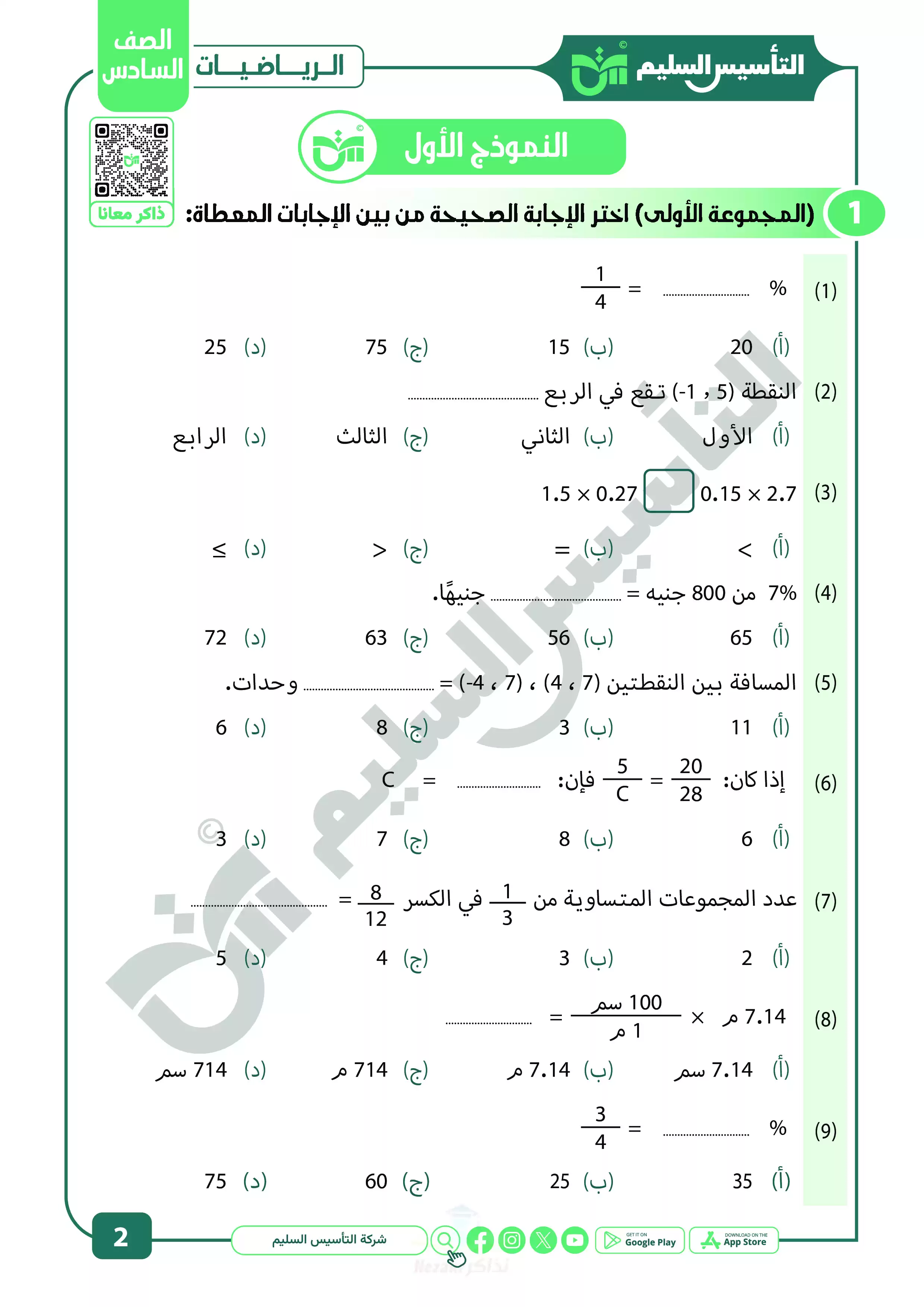 صفحة 2 من 22 صفحة من ملف: نماذج اختبارات ومراجعة الرياضيات النهائية من التأسيس السليم للصف السادس الابتدائي الترم الثاني 2025 - Nezakr