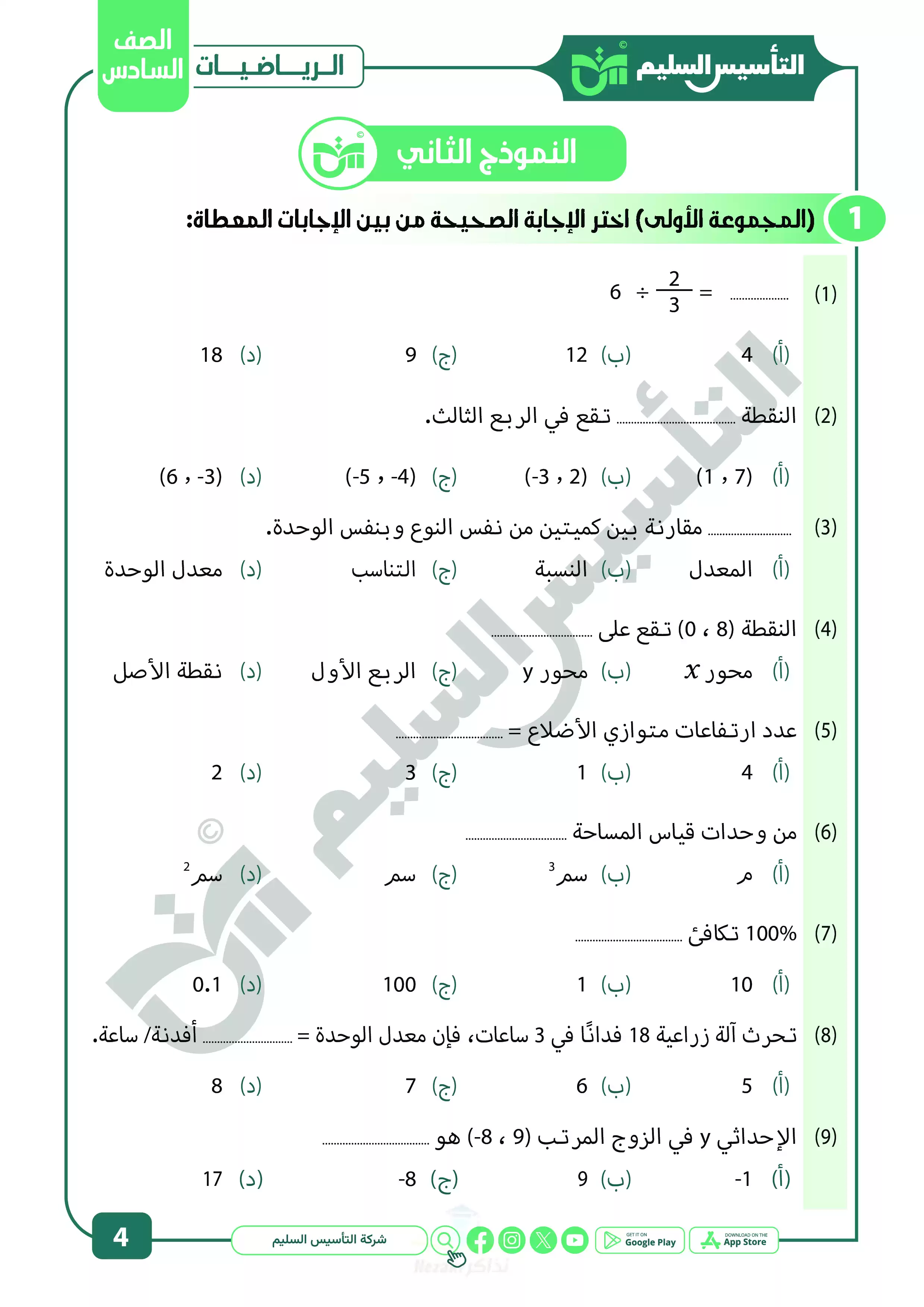 صفحة 4 من 22 صفحة من ملف: نماذج اختبارات ومراجعة الرياضيات النهائية من التأسيس السليم للصف السادس الابتدائي الترم الثاني 2025 - Nezakr